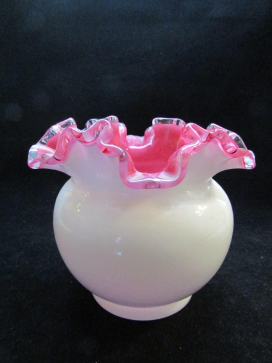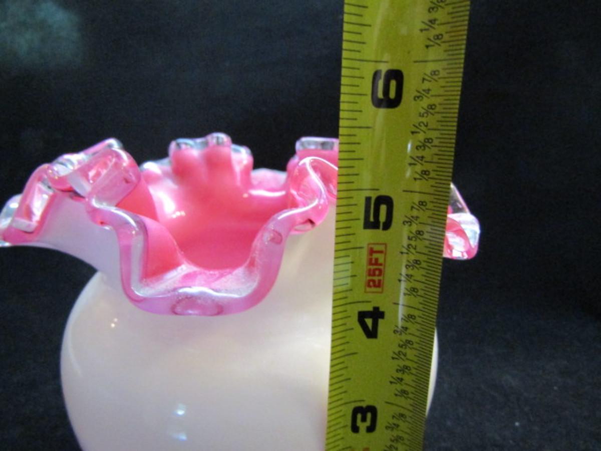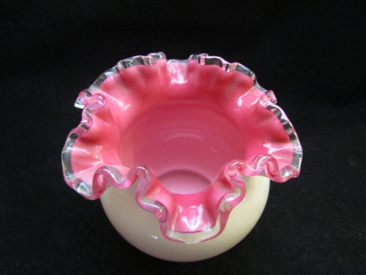 Vintage Glass Rose Bowl with Ruffled Top- White on Pink- Possibly Fenton (#170)