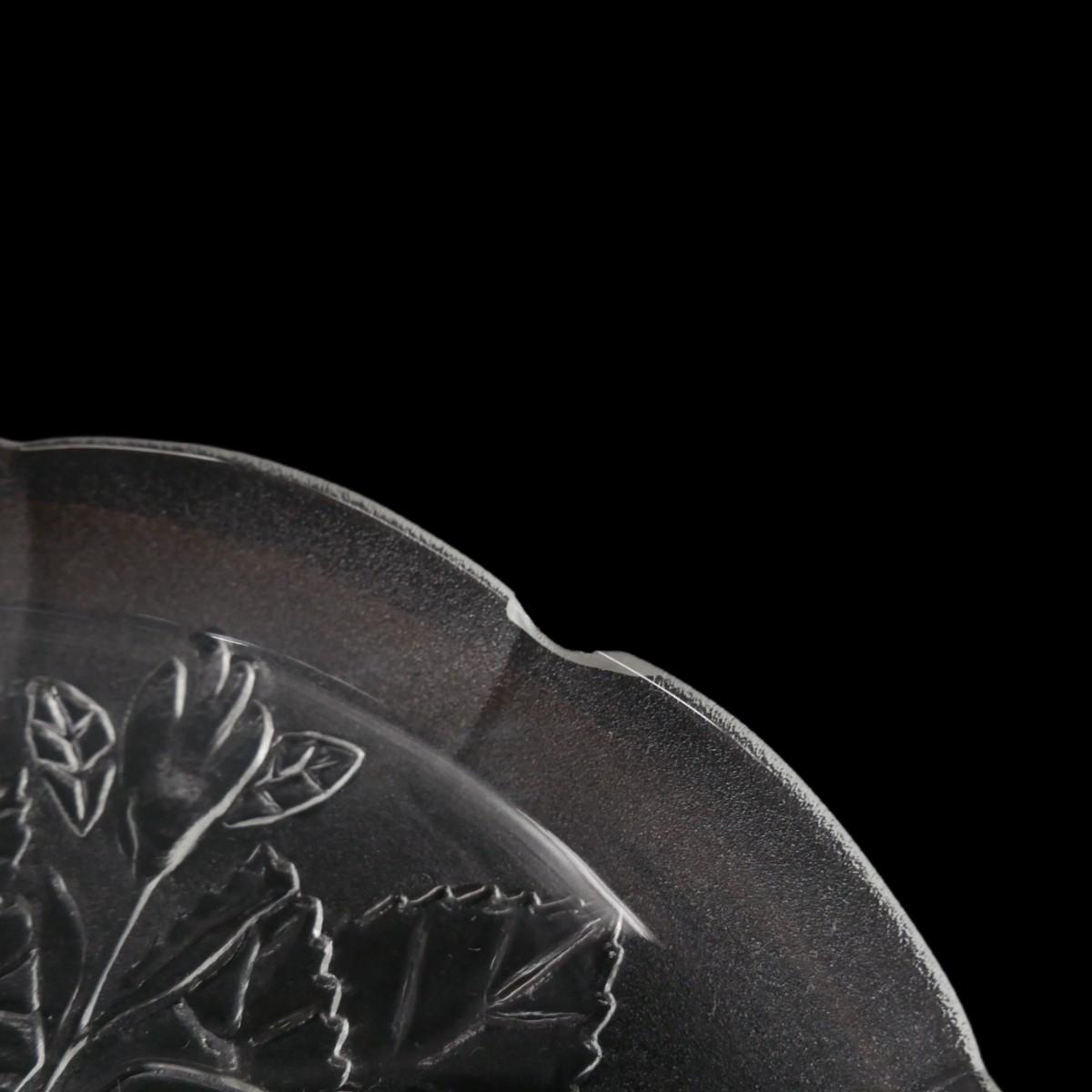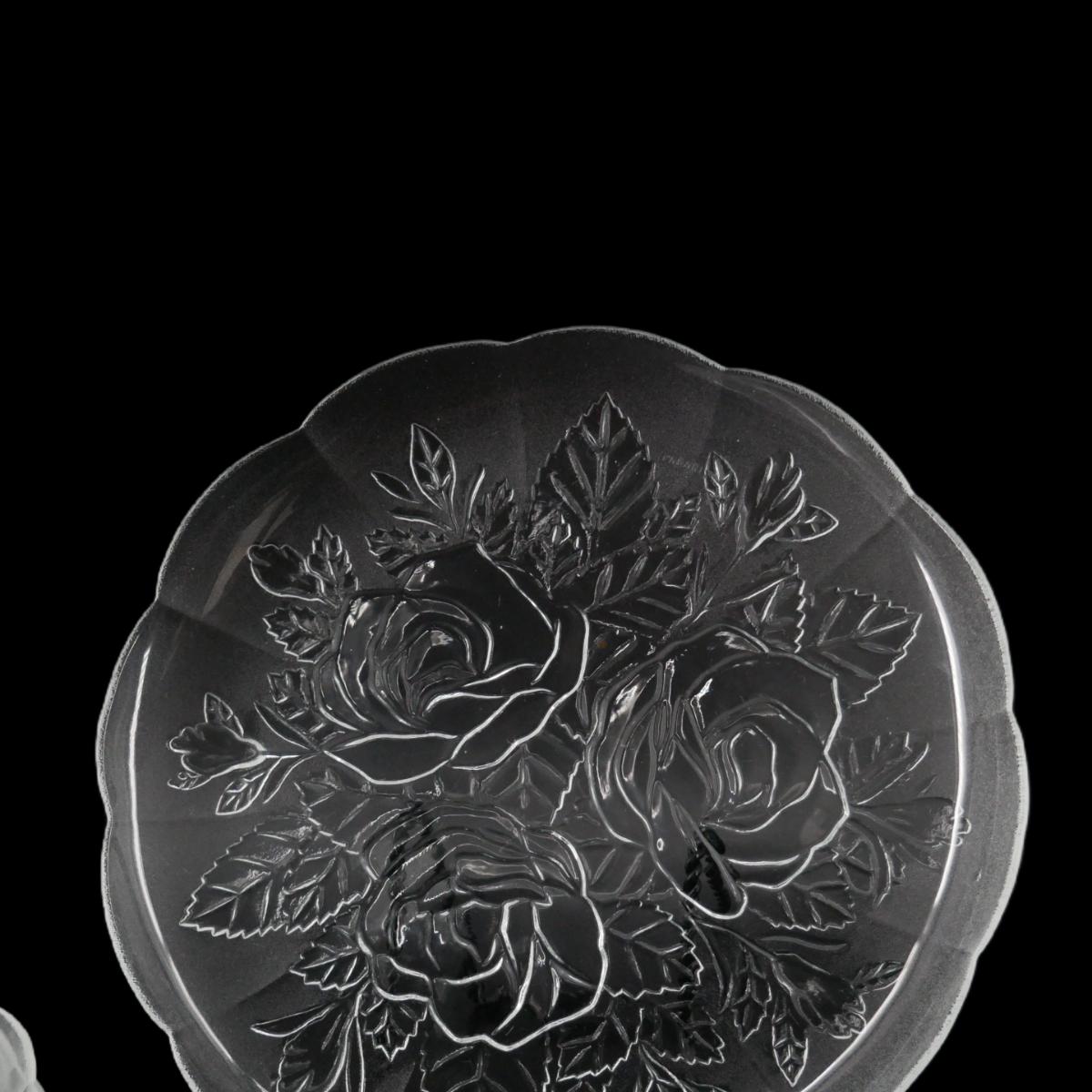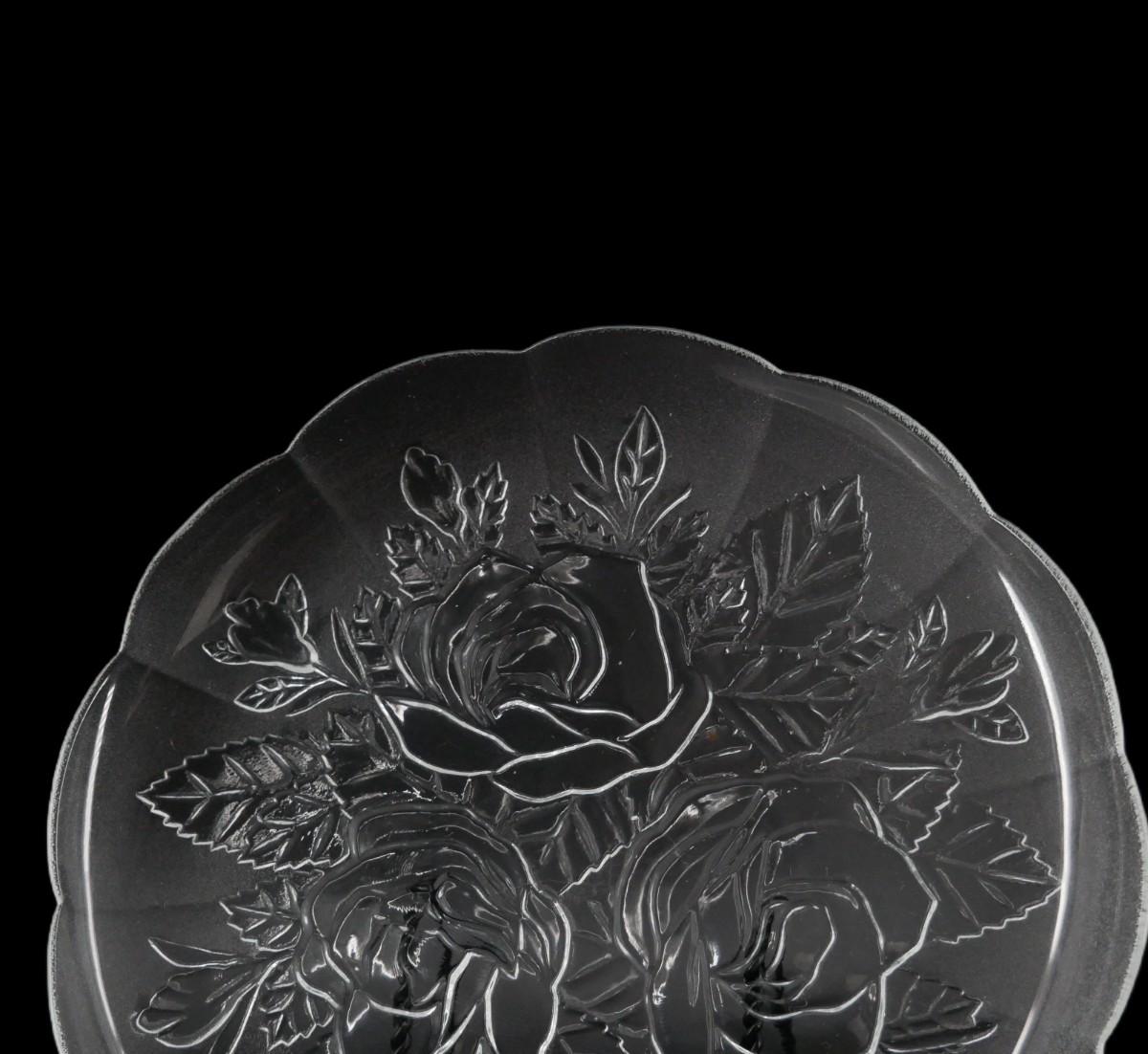 Set of four vintage glass rose dinner plates marked "Pasari, Indonesia". Beautiful scalloped edges with floral rose and leaves design. One plate has chip (see photo). Each measures 10" in diameter. Lot weighs 5 lb. (G36)