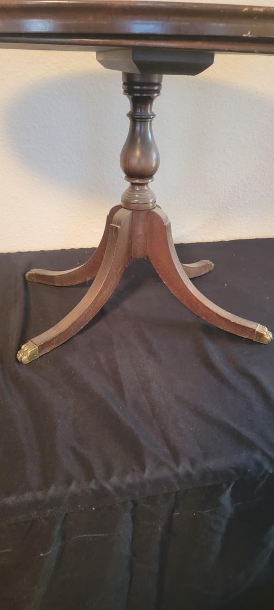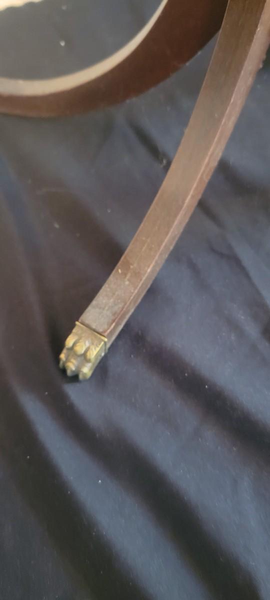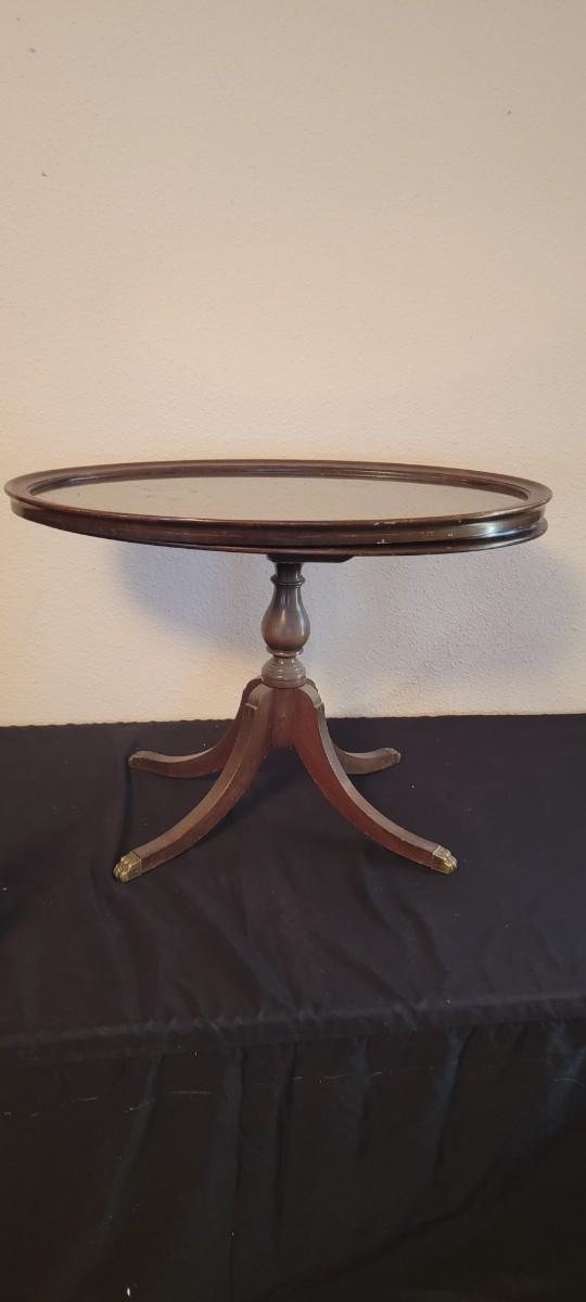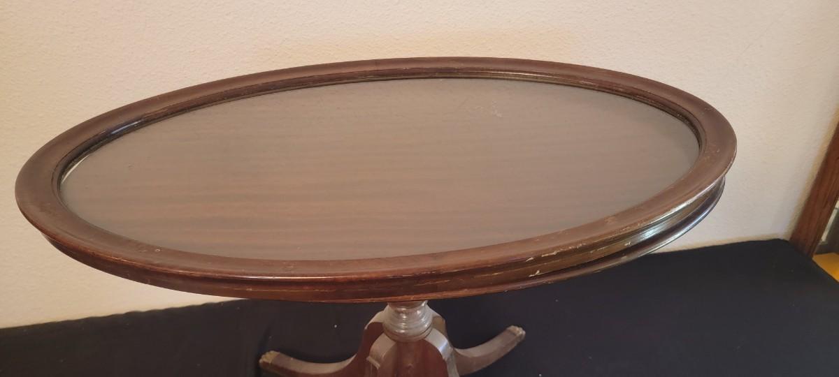 Vintage glass top wood table with metal feet. 18" x 28" oval top.