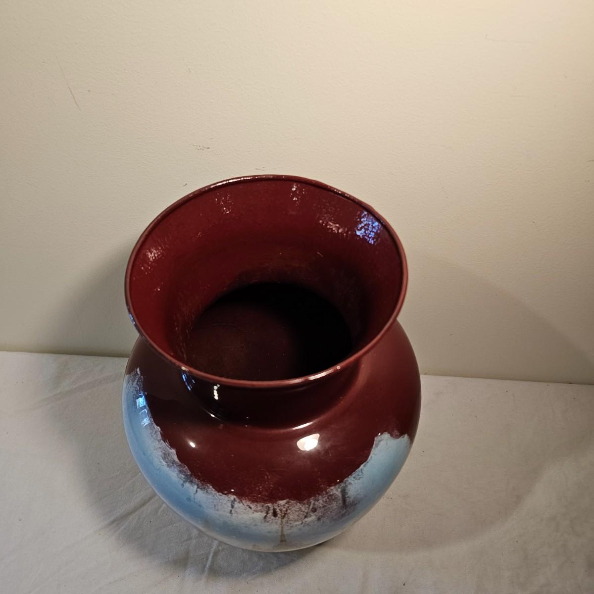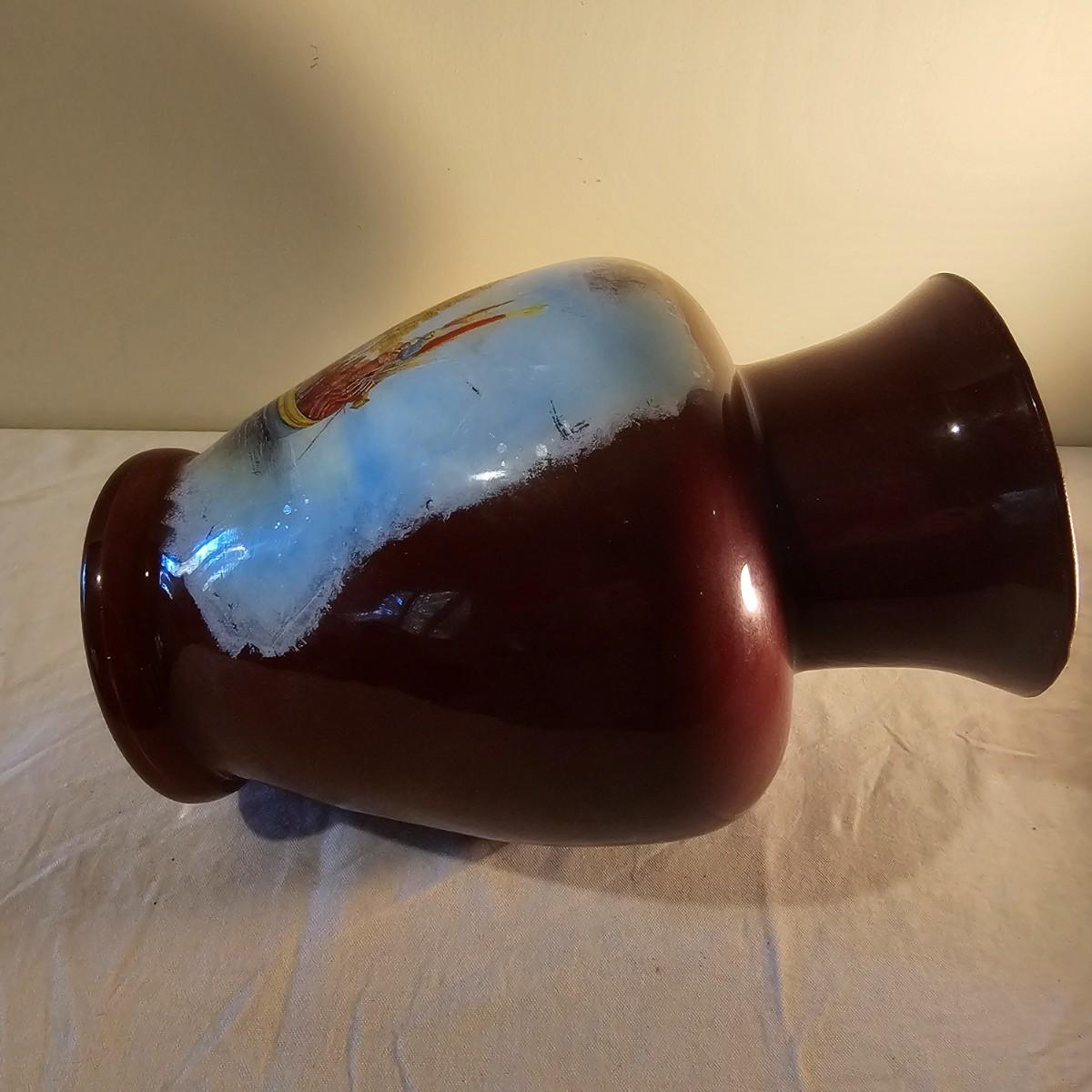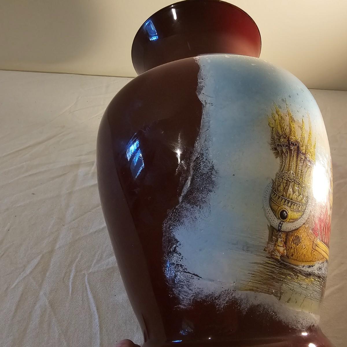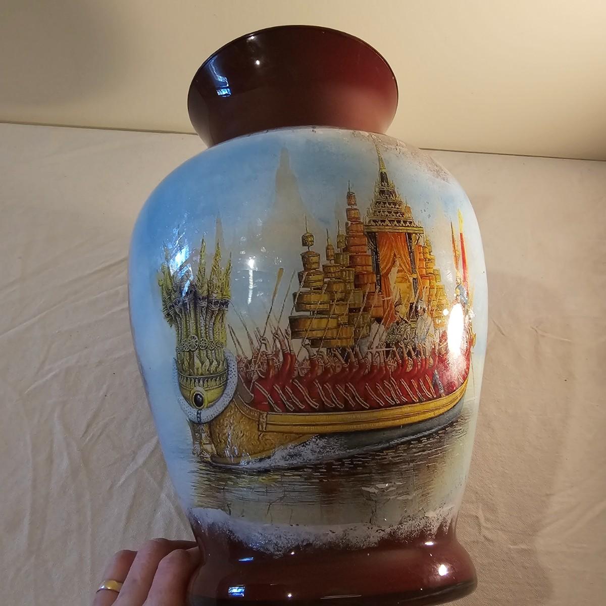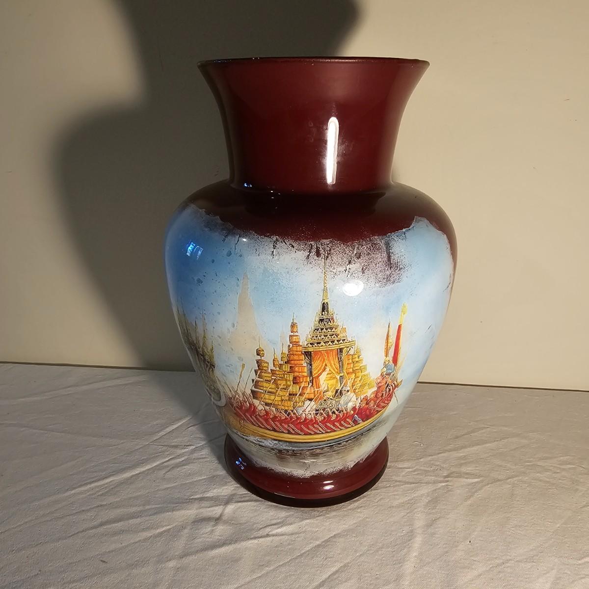 A brown glass vase with an image of a ceremonial barge. Vase may have been painted on the inside. Reddish brown base color. Vase measures 9" D x 13"H. See photos for details. Shipping available.