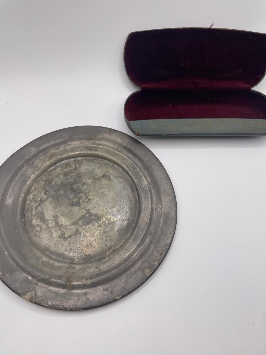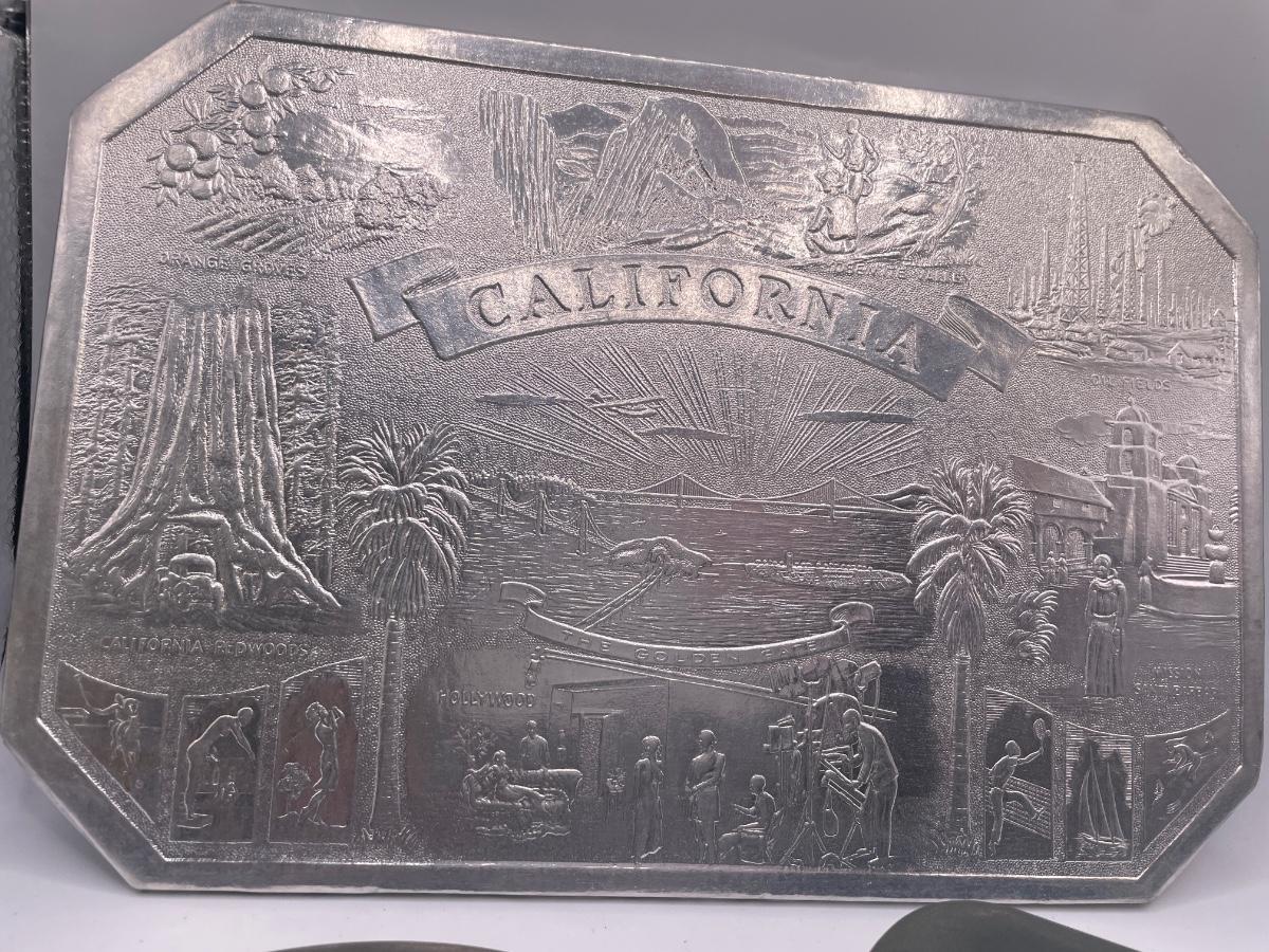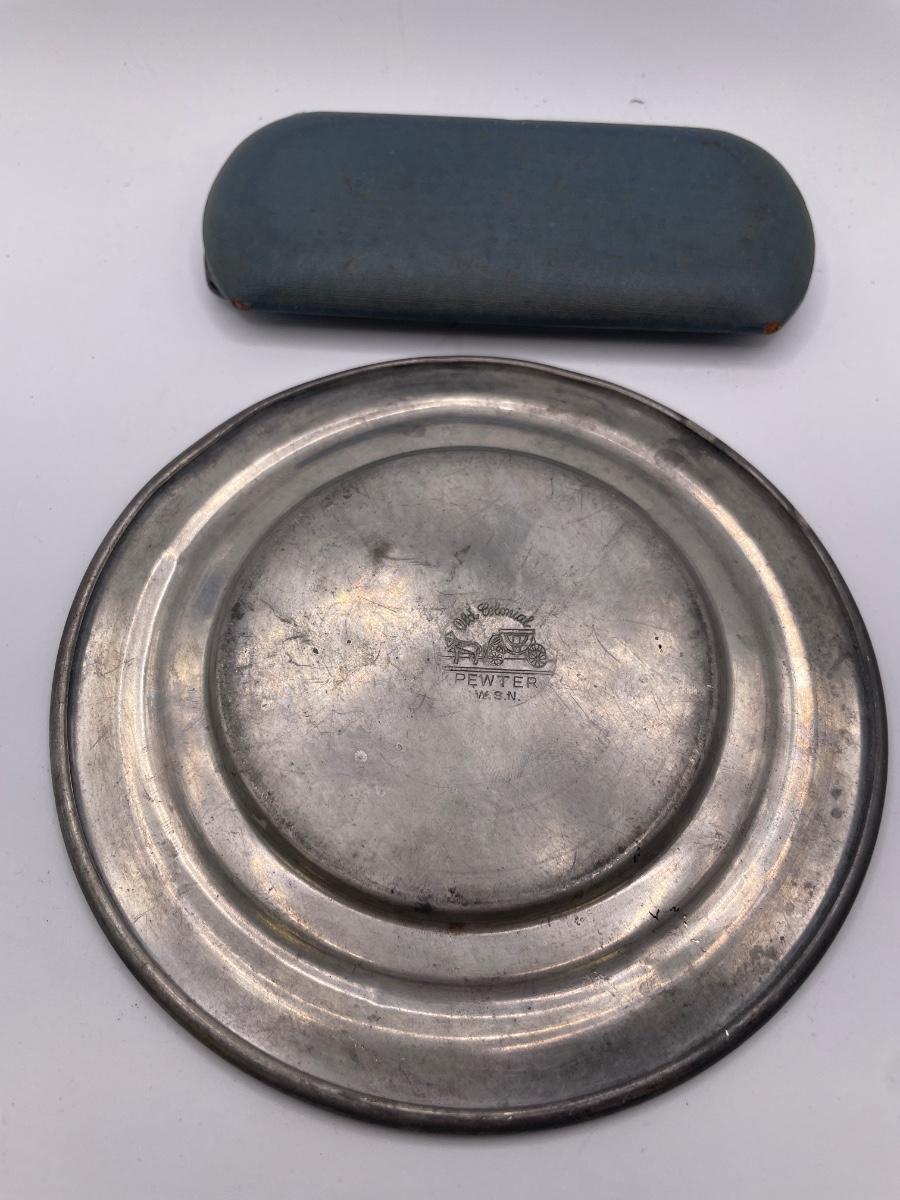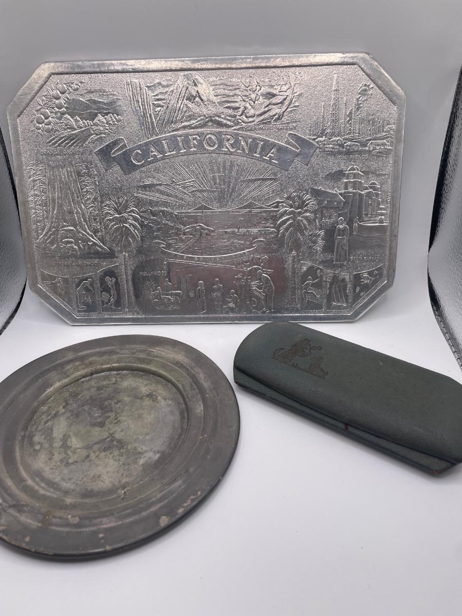 Vintage glasses case, pewter plate and California souvenir