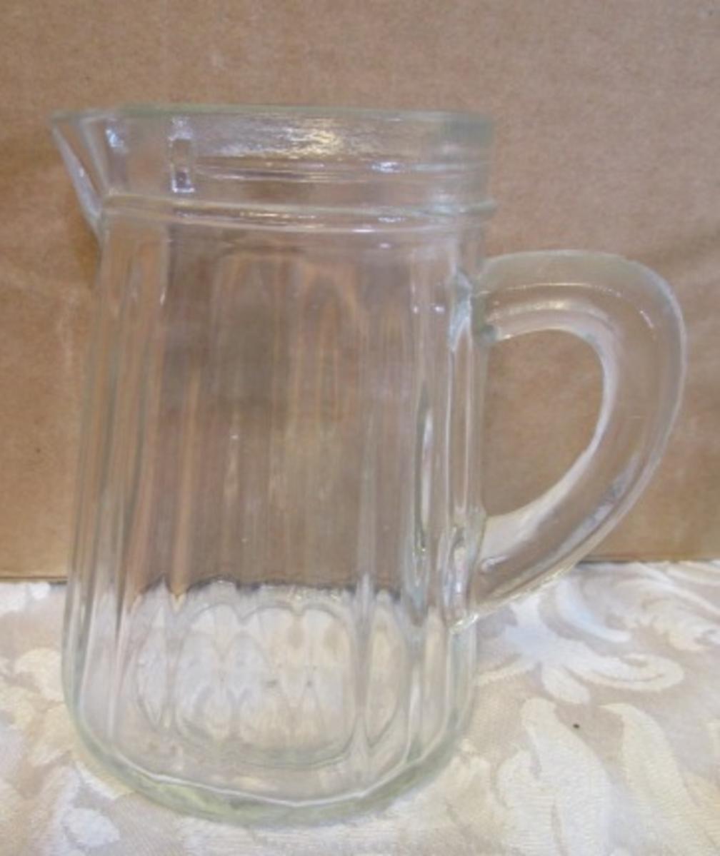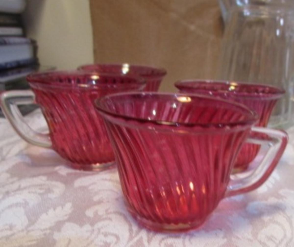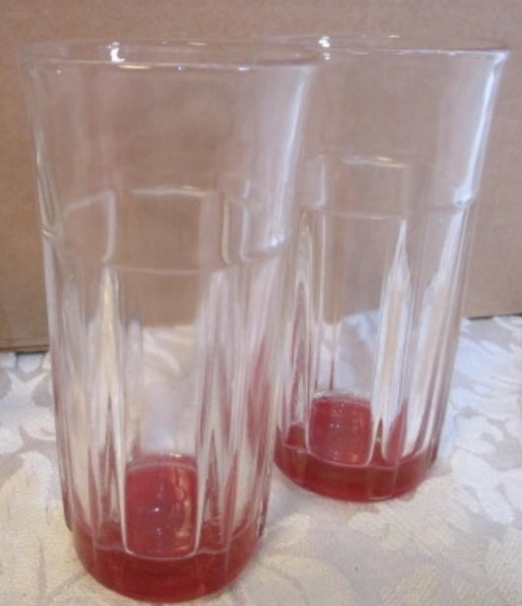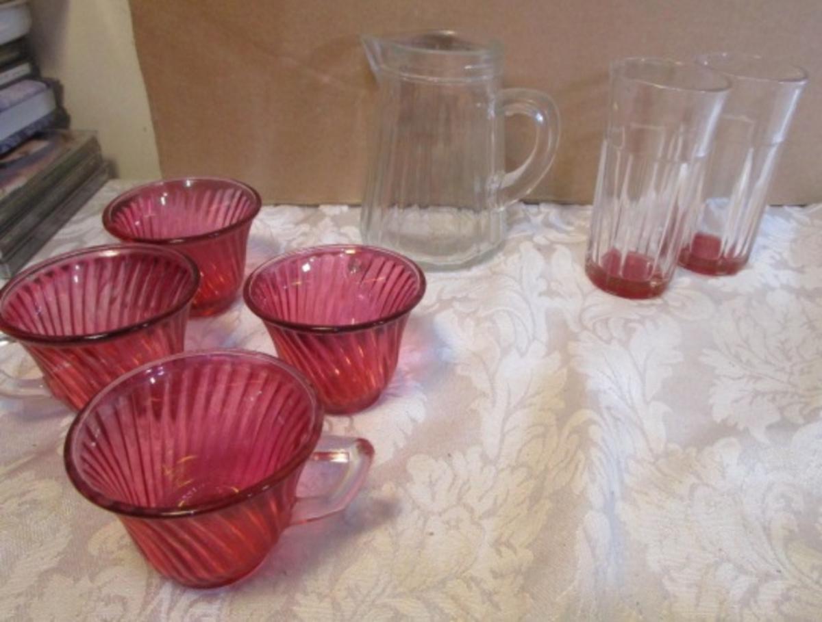 4 pink glass miniature cups, 1 creamer, 2 small glasses