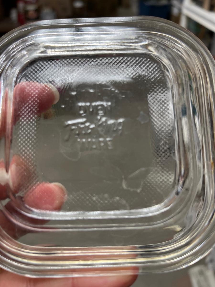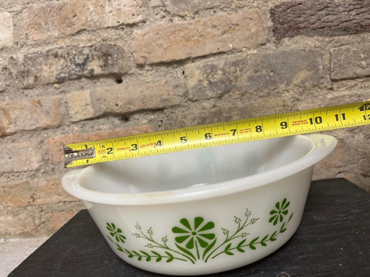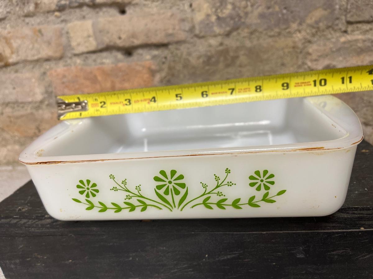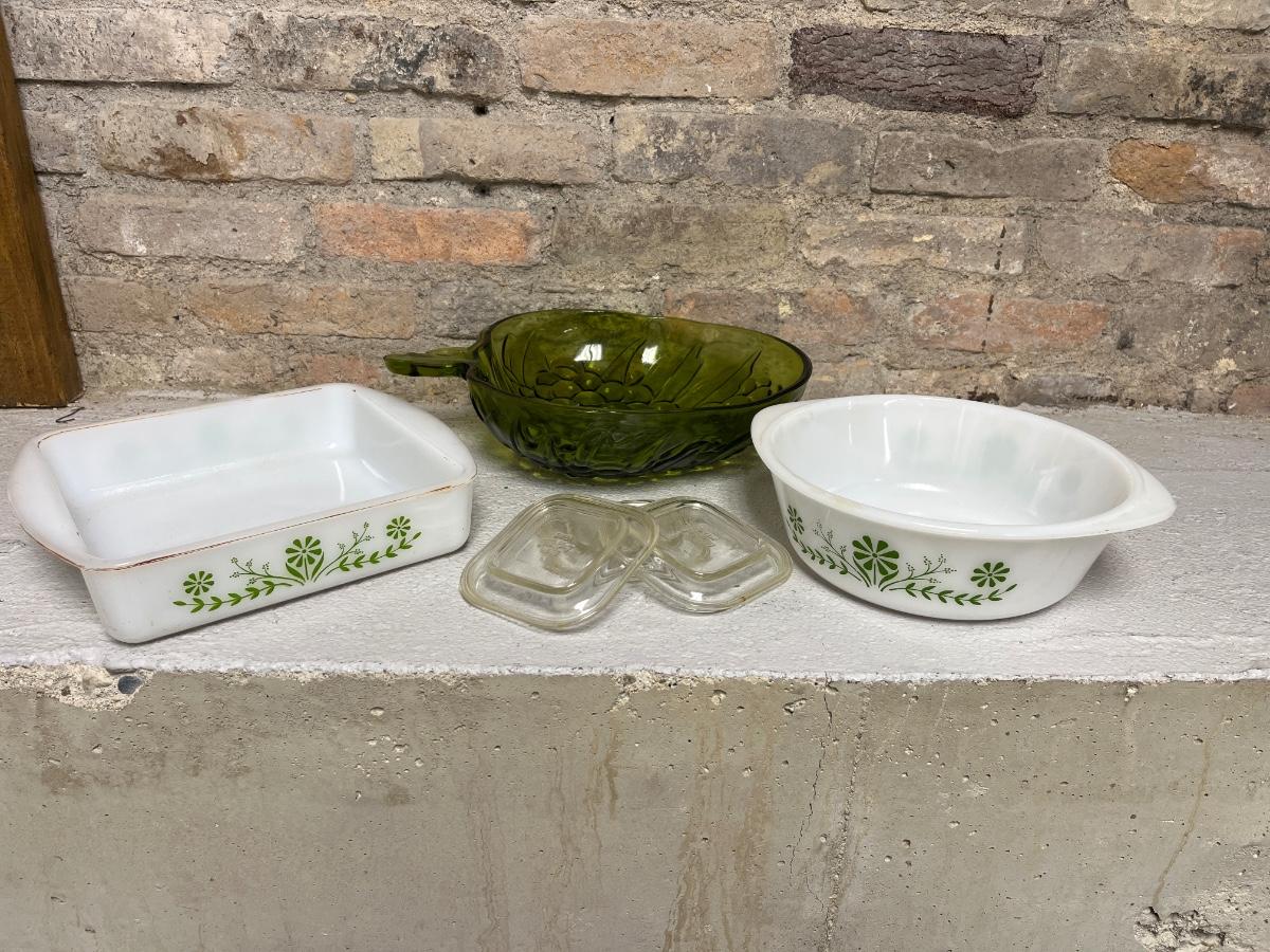 Really cool avocado Indiana Glass grapes bowl, Glasbake 8” square and round casseroles, and three Fire King 4” square clear lids