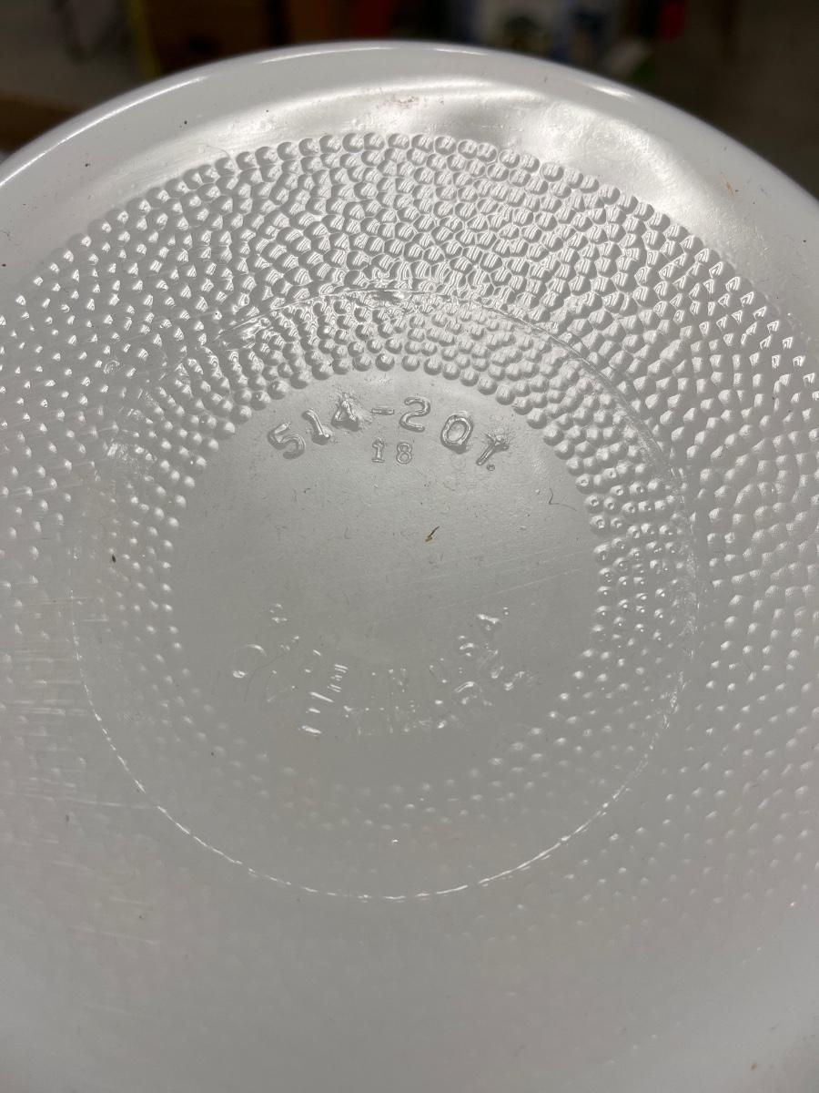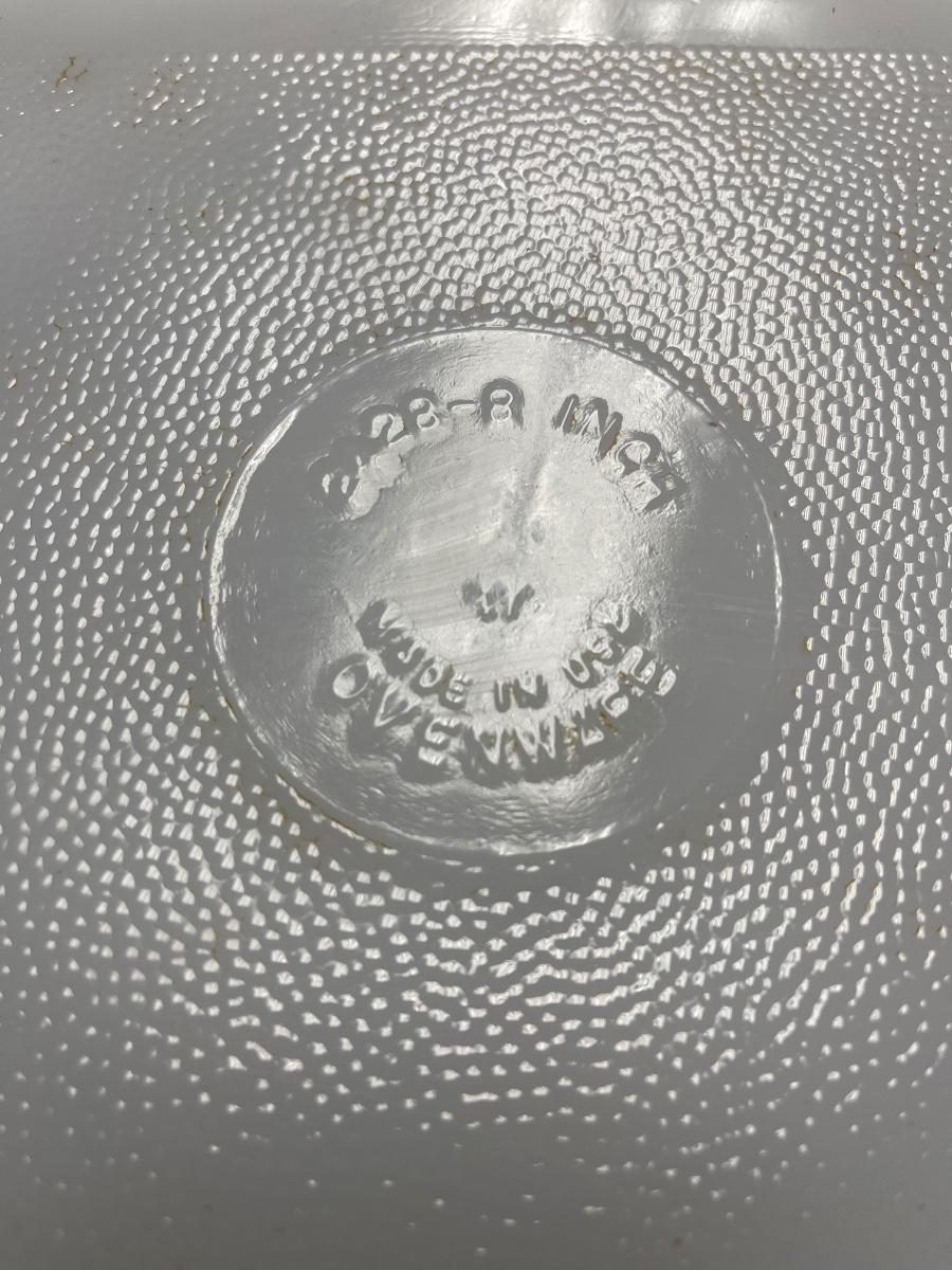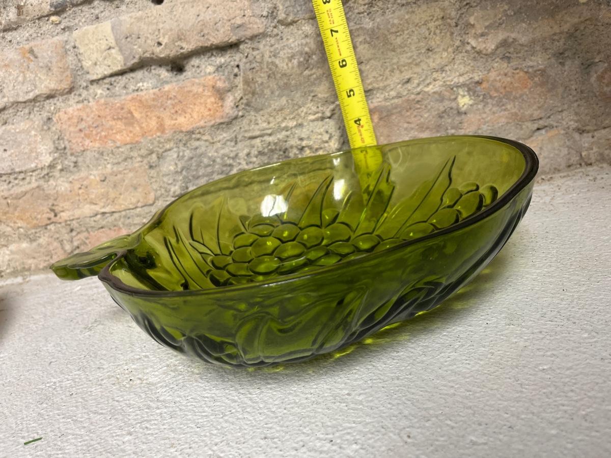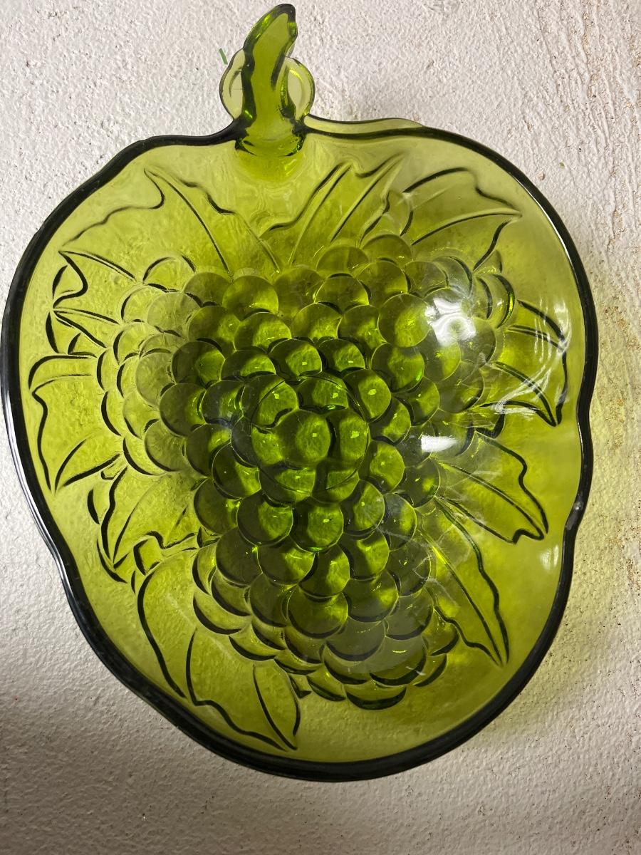 Really cool avocado Indiana Glass grapes bowl, Glasbake 8” square and round casseroles, and three Fire King 4” square clear lids