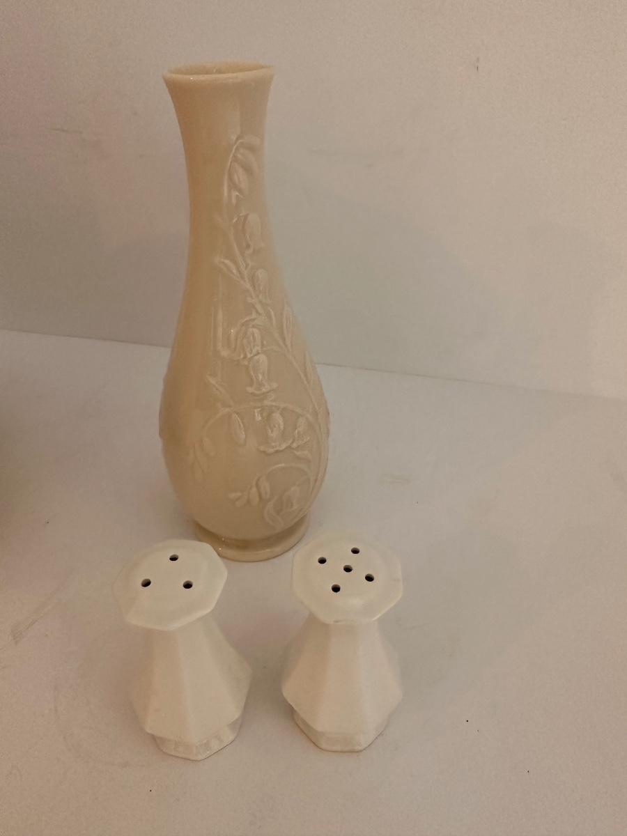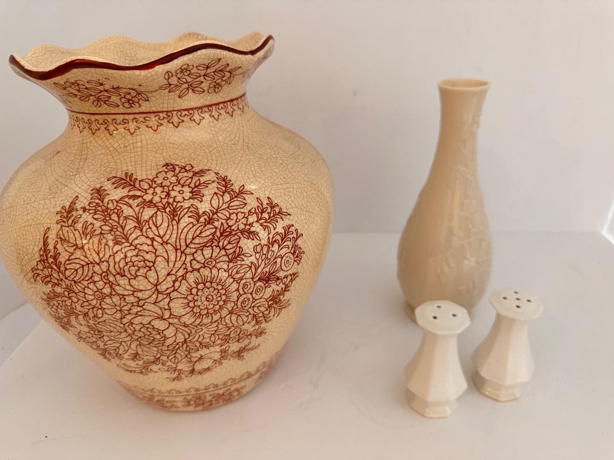 Vintage Glassware Lot Includes Crackled Vase, Leonx Vase, Salt and Pepper Set As Pictured