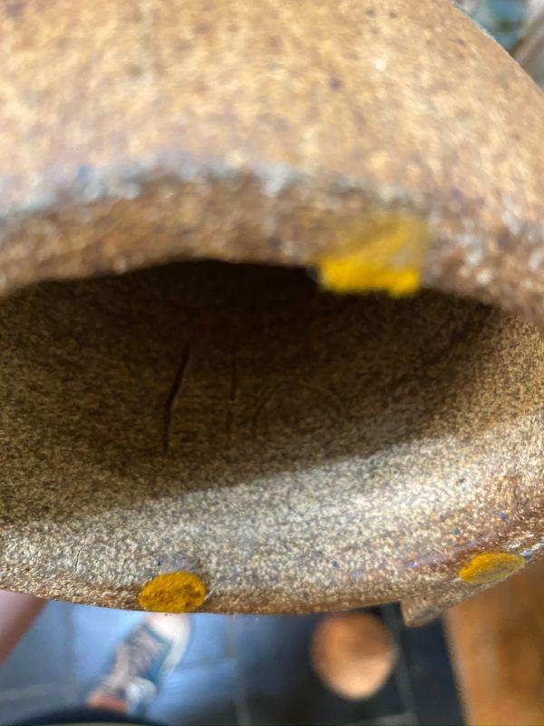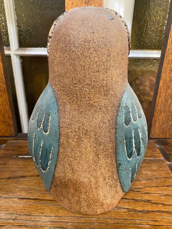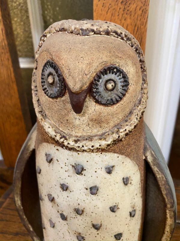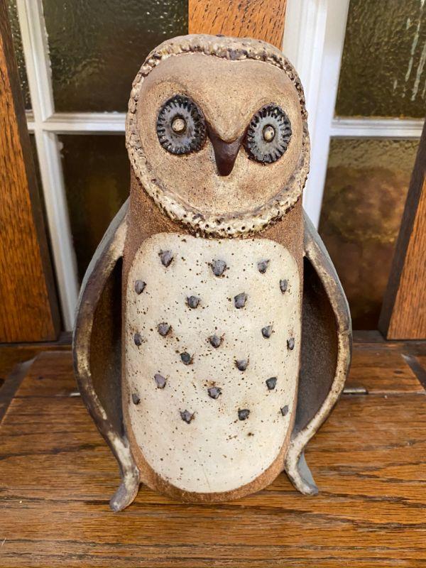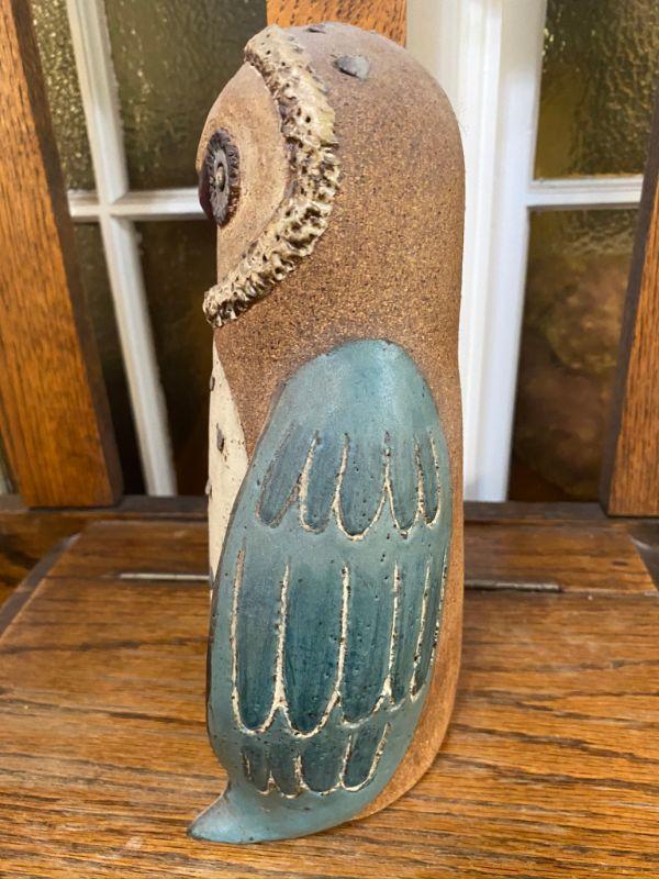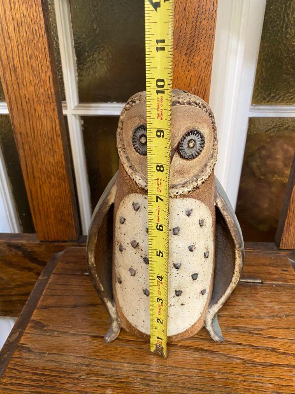 Vintage glazed rough stoneware owl figurine. Stands about 10" tall. Hollow body with the letters "HO" scratched inside. Good Condition.