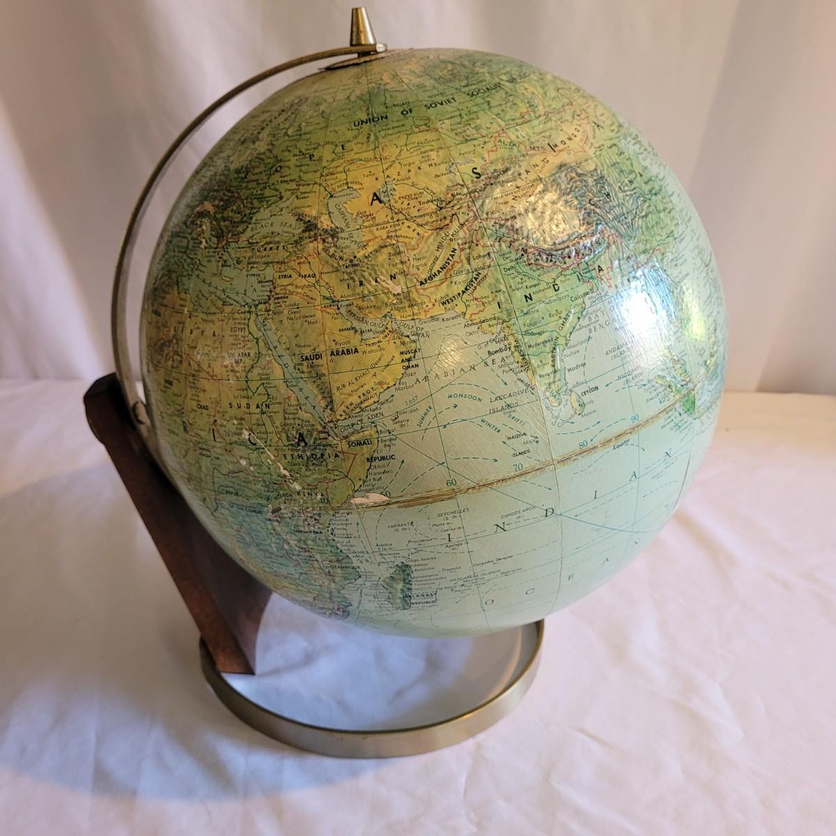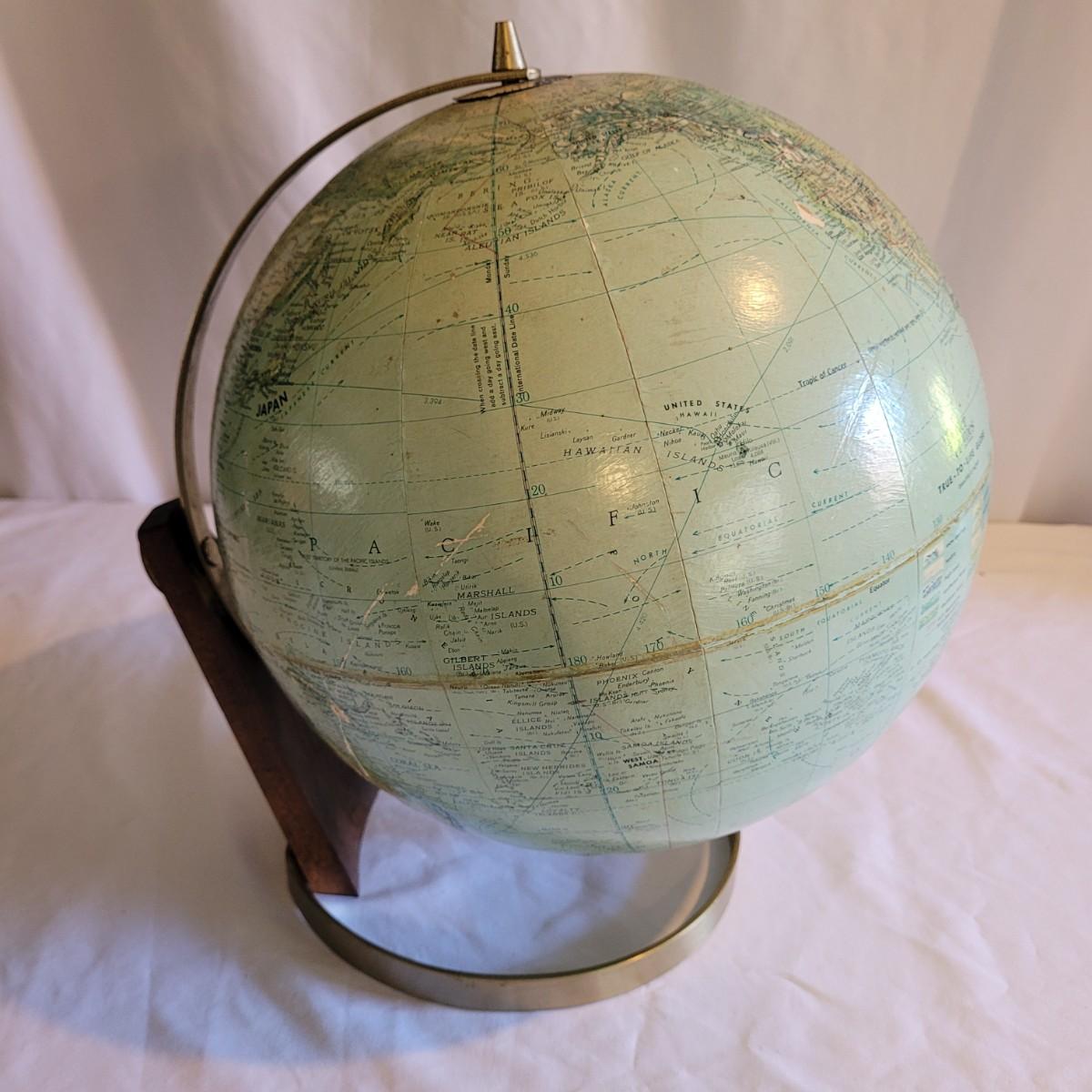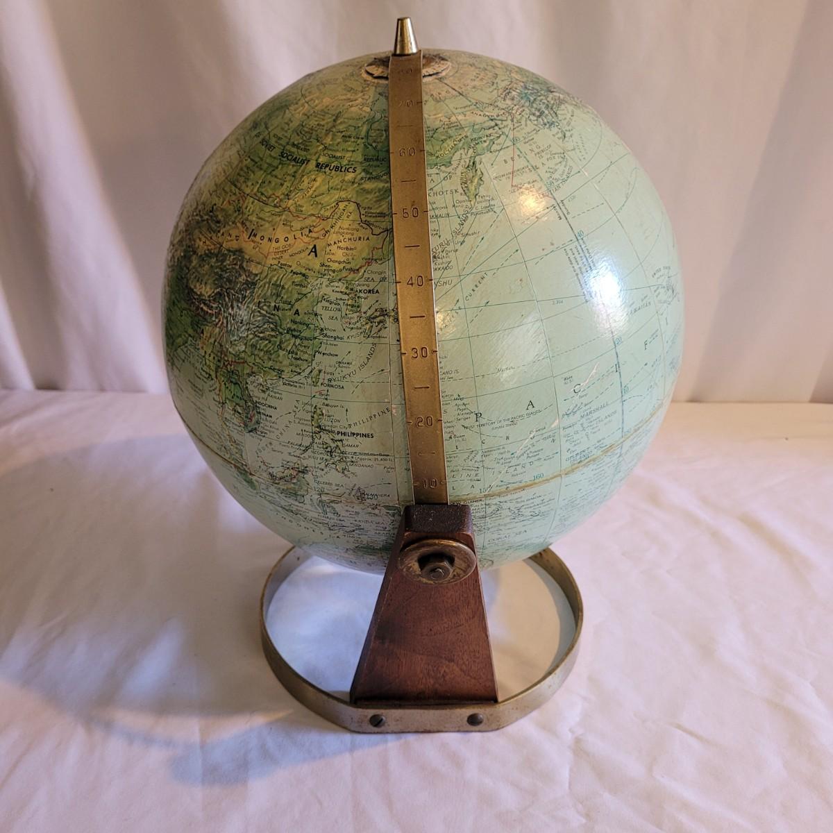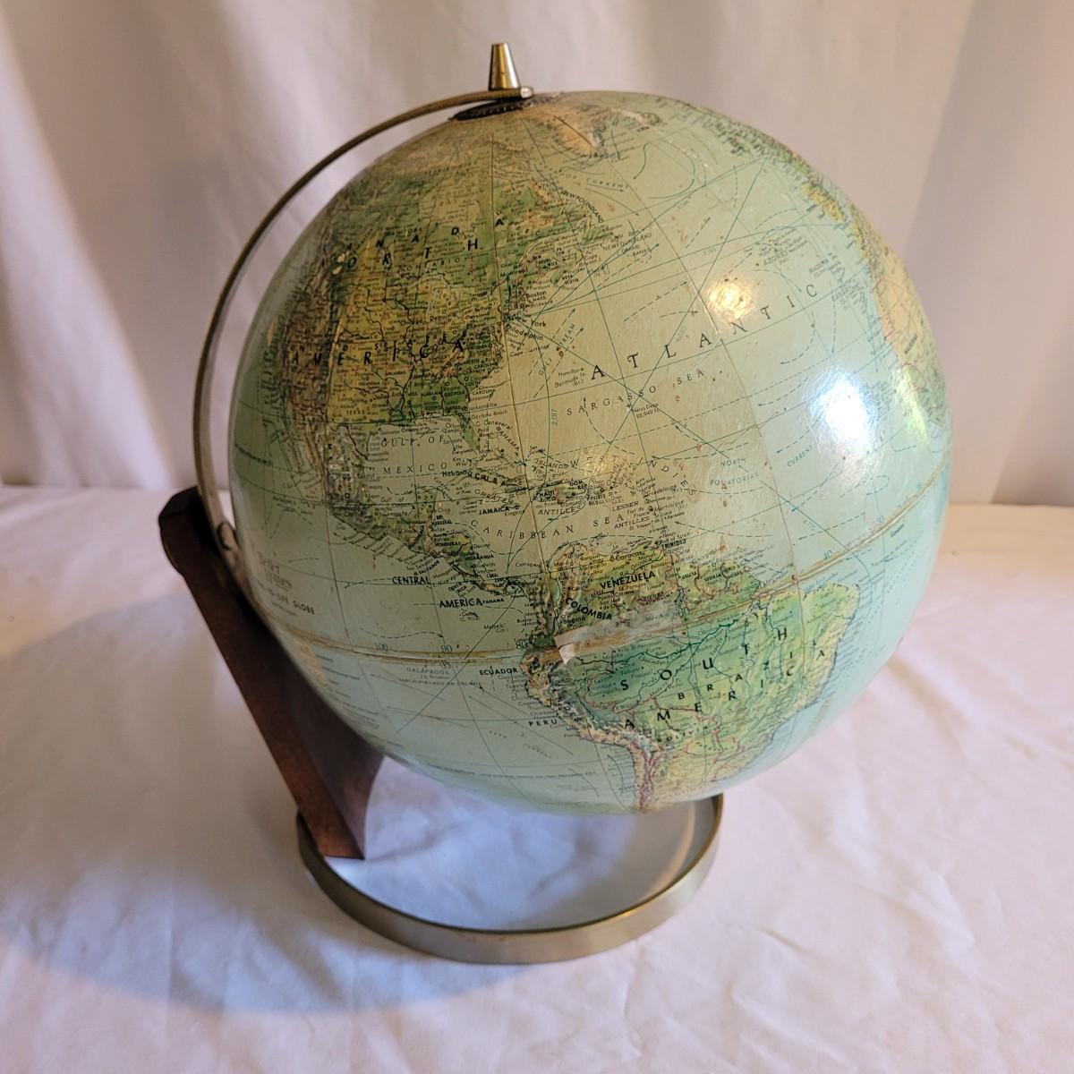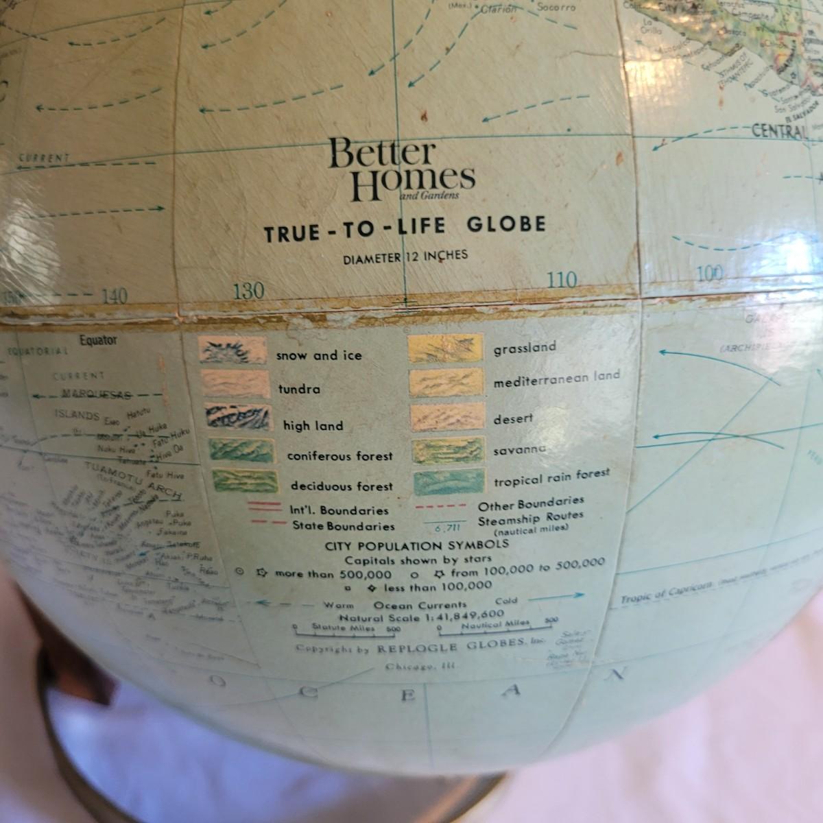 This auction is for a vintage Better Homes "True-To-Life" Globe. Made from paper, brass, and wood. Likely from the 1960 though names and labels of countries suggests it may be older. Globe spins freely on two different axis. Has some signs of wear and has a spot with some peeling tape near the equator seam. Globe measures 12" x 12" x 15"H.