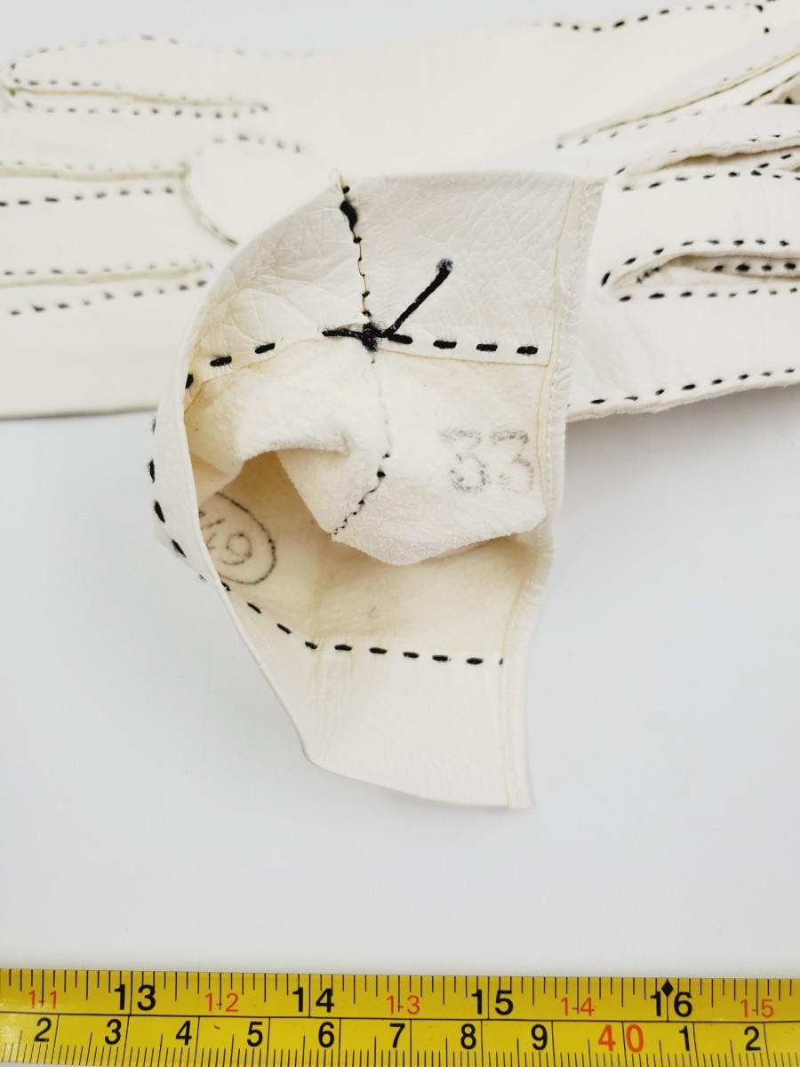 Very pretty white gloves with black stitching, very soft. 6 1/4 and the number 33 can both be seen on the inside of the glove