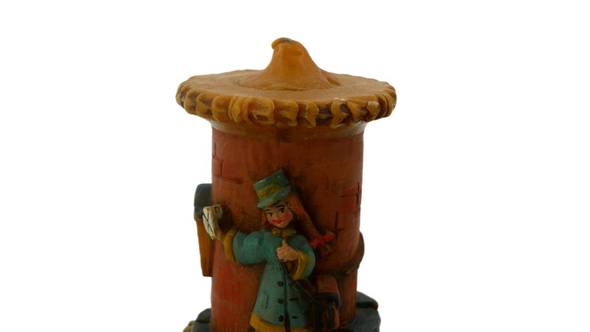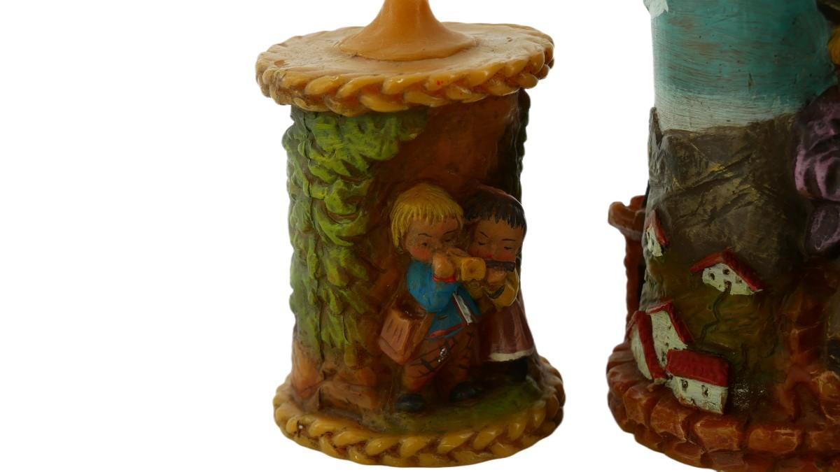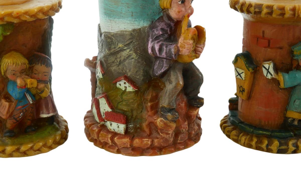 Three vintage, handmade and handpainted candles by Günter-Kerzen. All marked "Günter-Kerzen D 6968 Walldürn". All unburned, normal wear and aging. Tallest measures H 7" x L 4". Weight of lot is 2 lbs 7 oz. (C10)