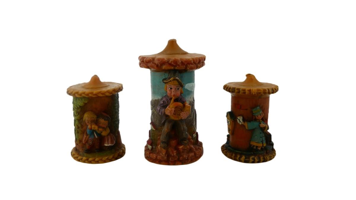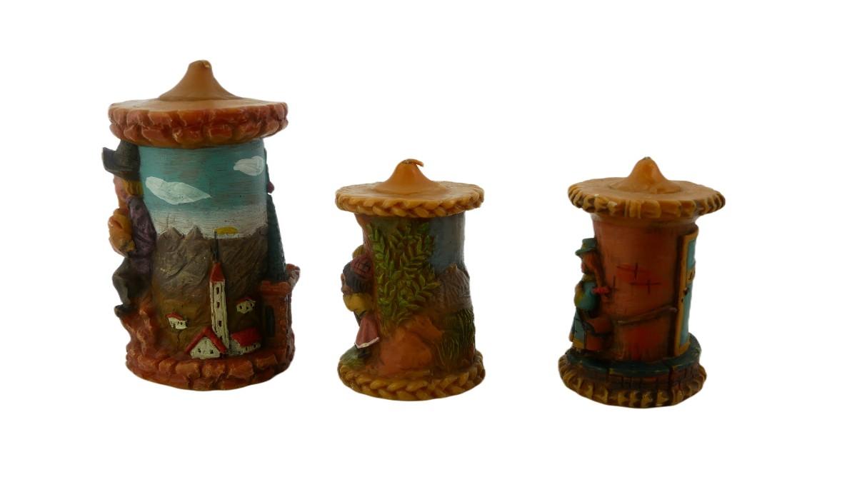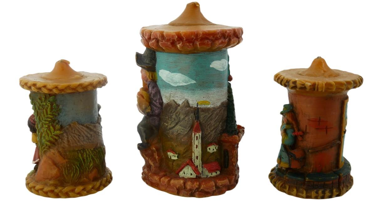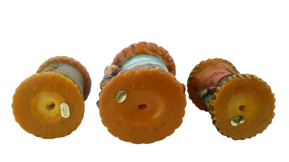 Three vintage, handmade and handpainted candles by Günter-Kerzen. All marked "Günter-Kerzen D 6968 Walldürn". All unburned, normal wear and aging. Tallest measures H 7" x L 4". Weight of lot is 2 lbs 7 oz. (C10)