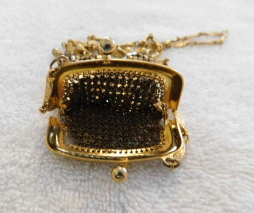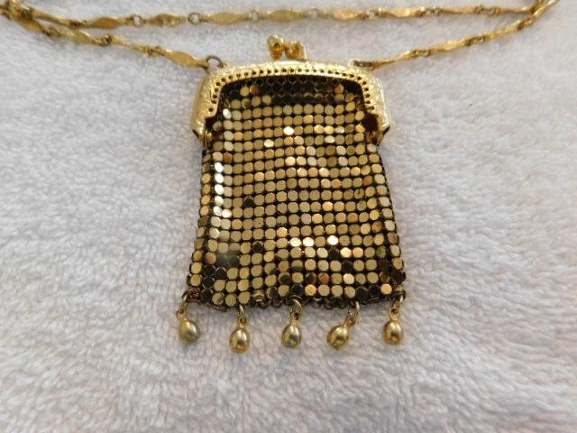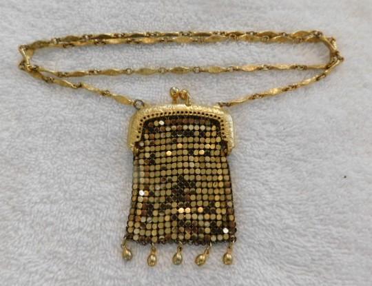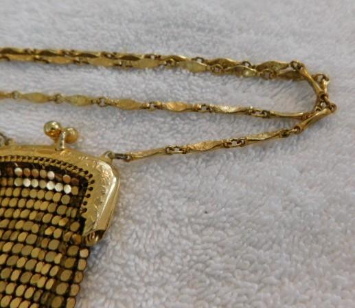 Vintage Gold 3" Mesh Neck Purse With 13" Chain (Closed Length). Very good condition. Discoloration in photo is actually light reflections