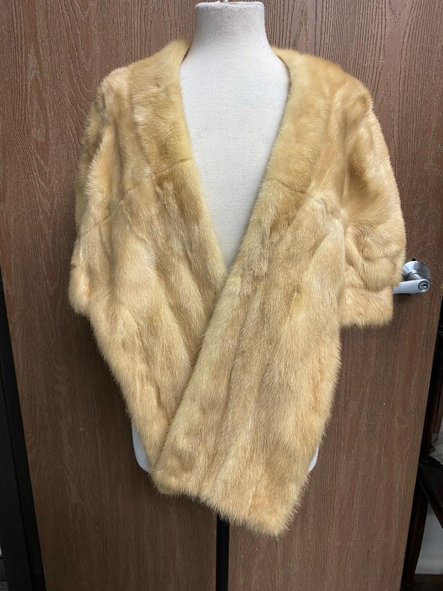 Vintage Gold Blonde Mink Squirrel Fur Stole Shoulder Wrap. Beautiful golden color. Soft, in good vintage condition. On a size 8/medium mannequin for size reference. Does have inside pockets and has been monogrammed.