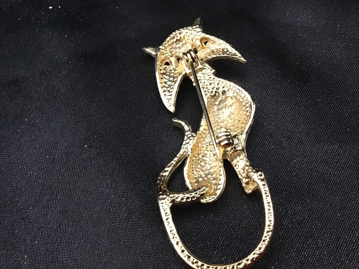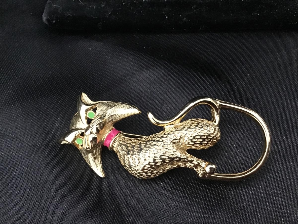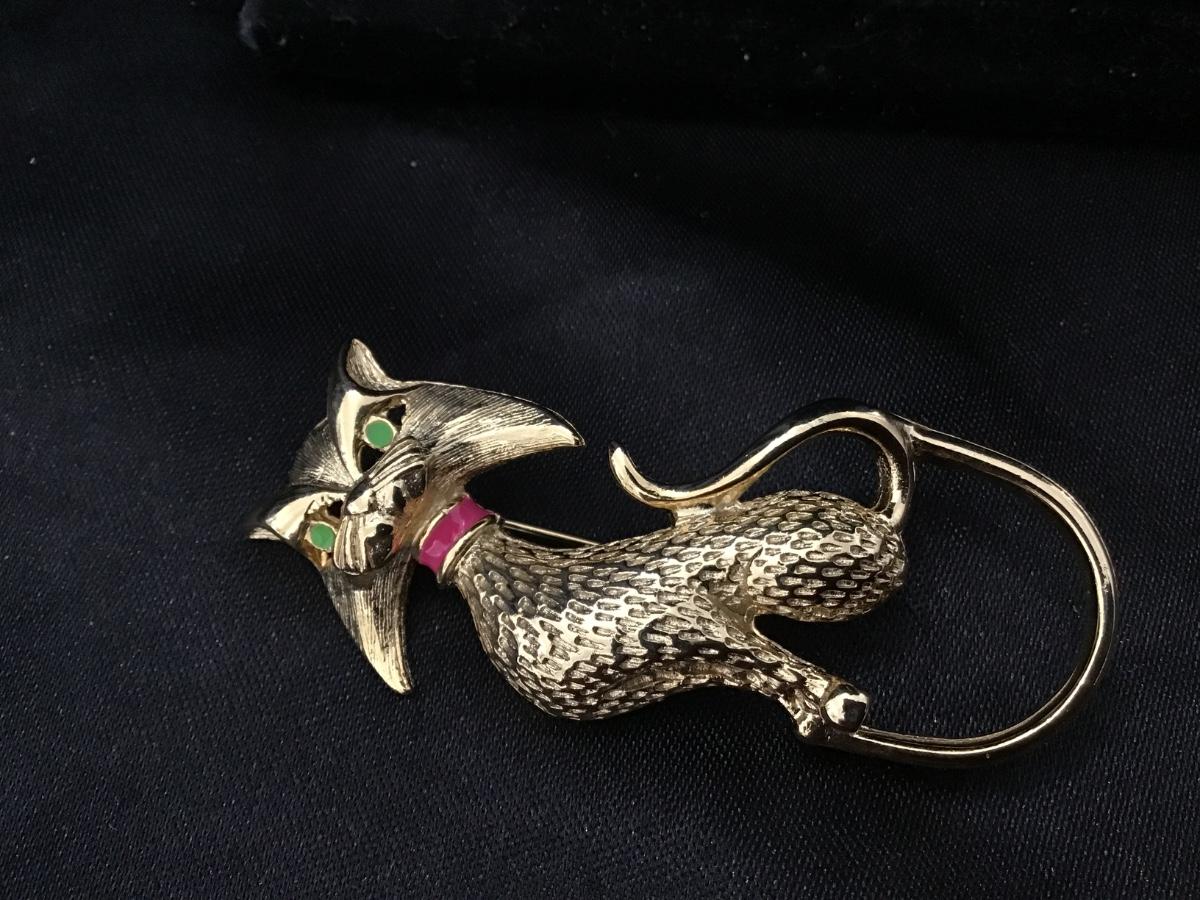 Vintage Gold Cat Brooch Jeweled Kitty Cat Gold Tone Green Eyes & Red Collar MCM