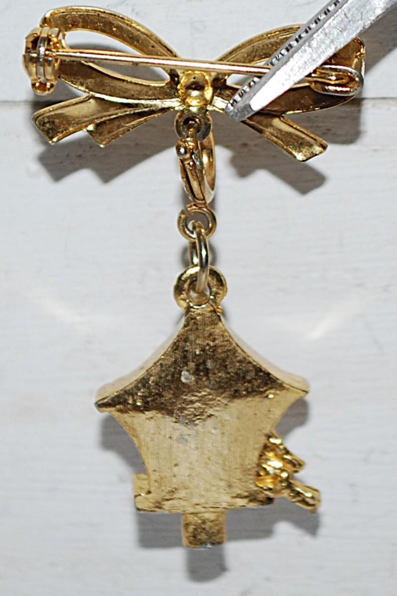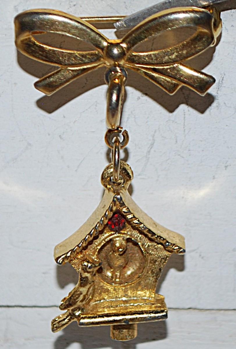 VINTAGE Gold Colored BOW & BIRDHOUSE BROOCH (1¾" x 1") with Dangle House and 2 Birds & RED Stone on a Gold Tone Setting