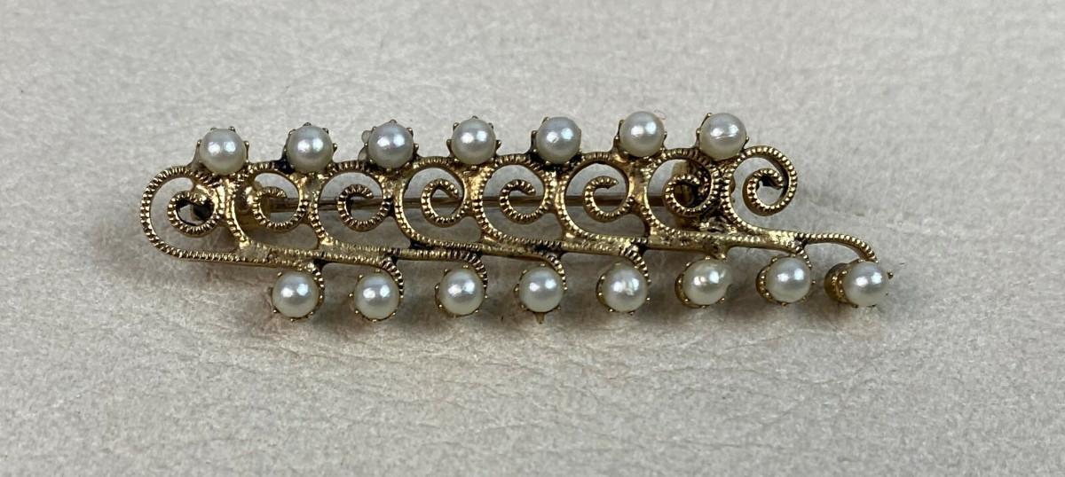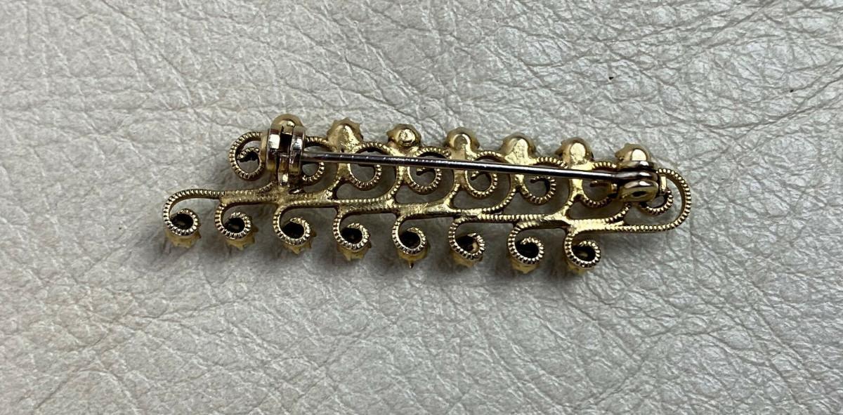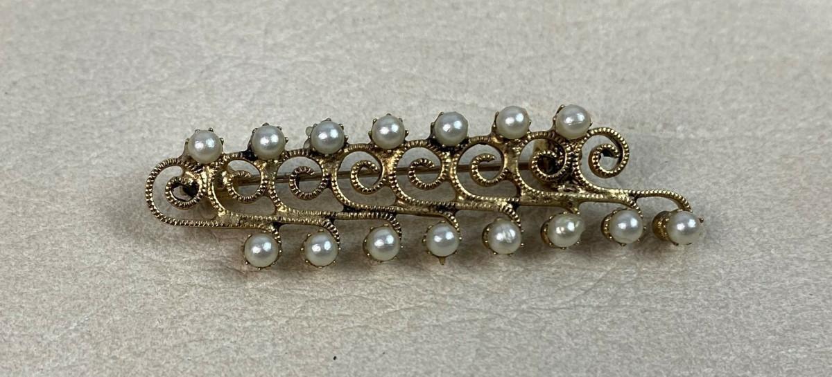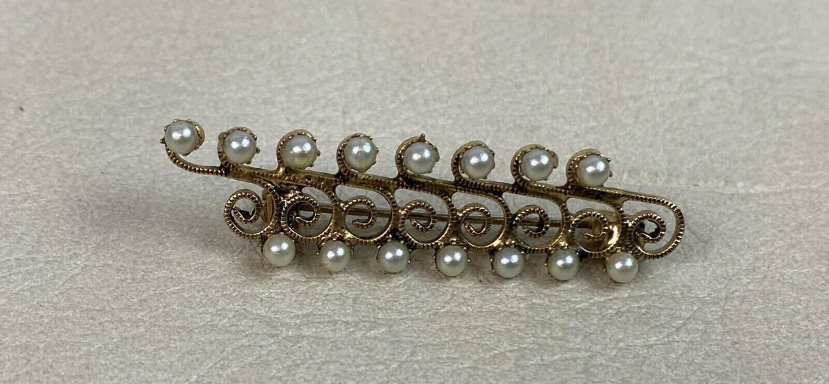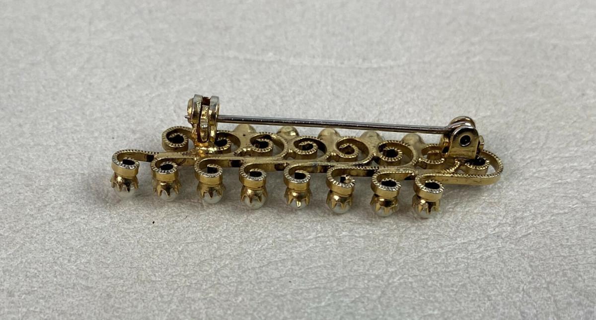 Faux pearl and gold tone wire filigree..delicate tracery on this unsigned vintage jewelry...very good condition...1.75" / 44.5mm long...Estate find.