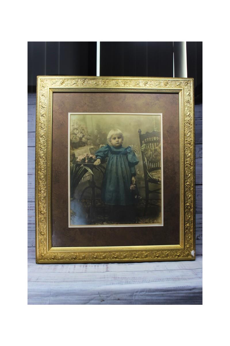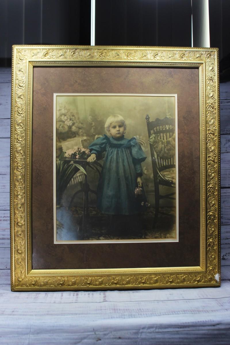 Vintage Gold Framed Print Portrait of a Child in Blue Dress