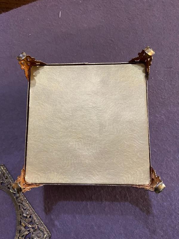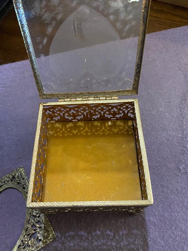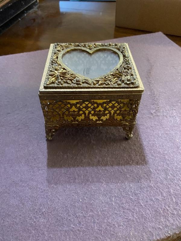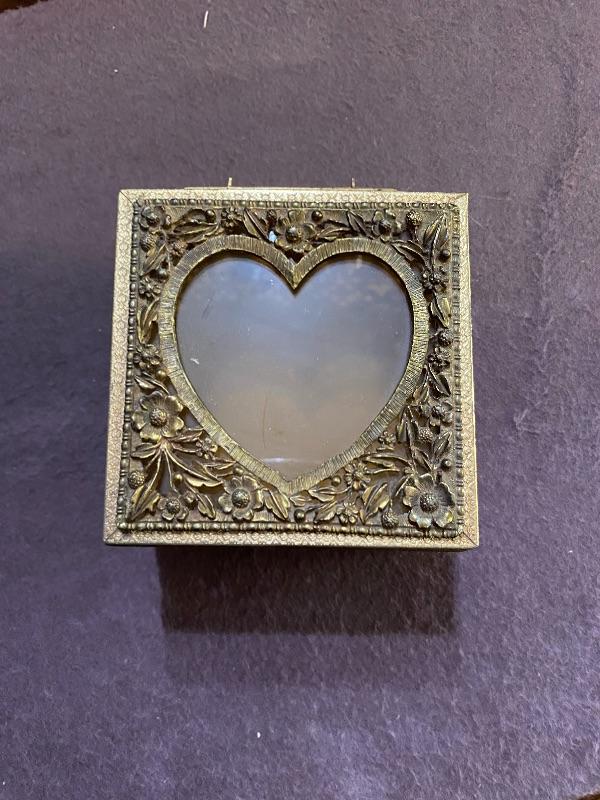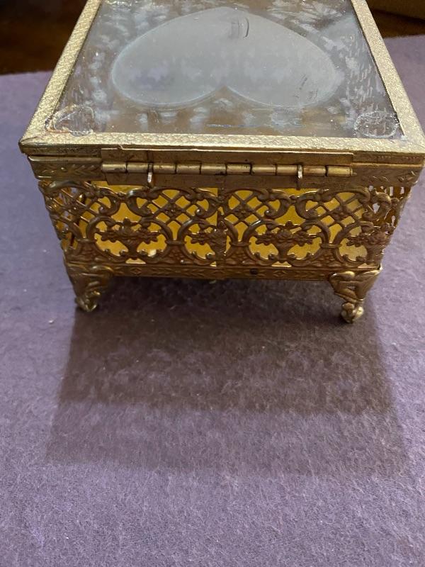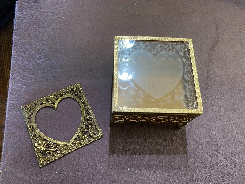 Vintage glass jewelry box. Goldtone metal with a heart cut out lid. The metal piece on top needs to be reglued. In otherwise good condition. About 4” square.