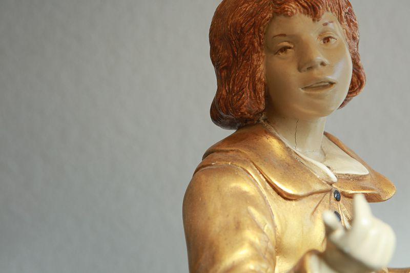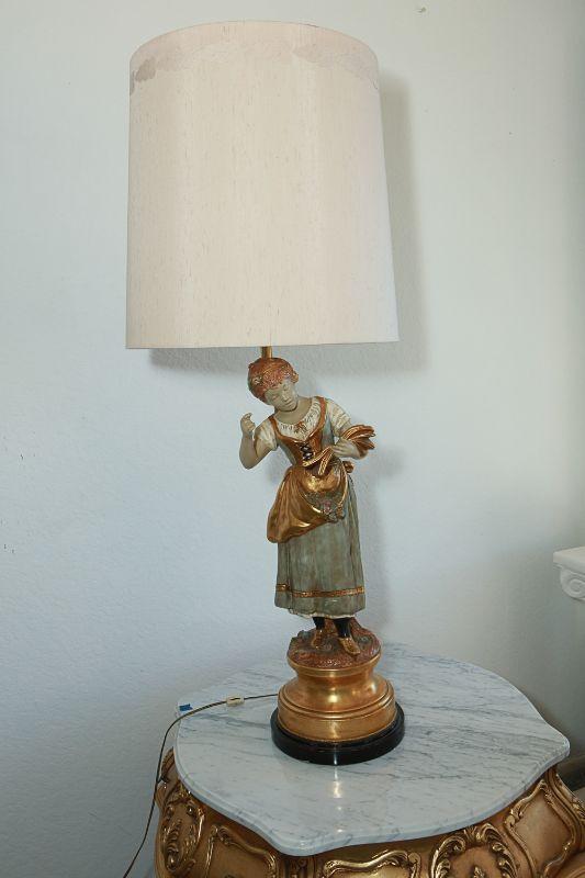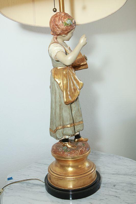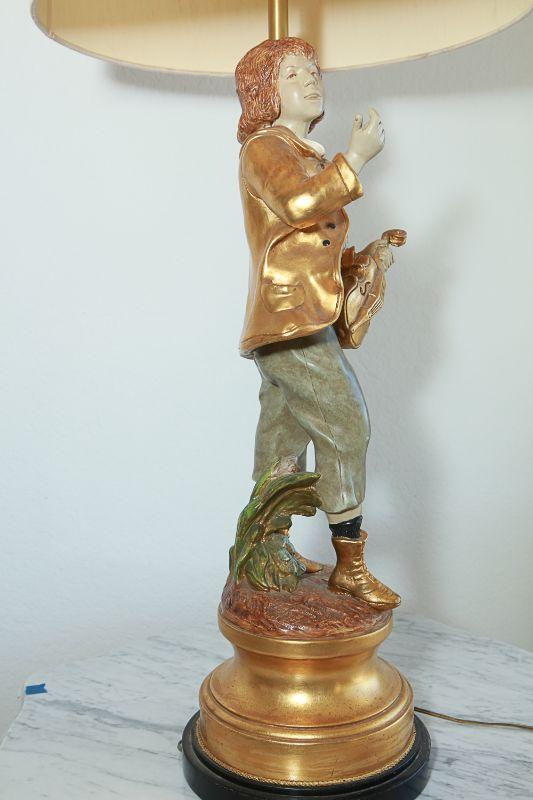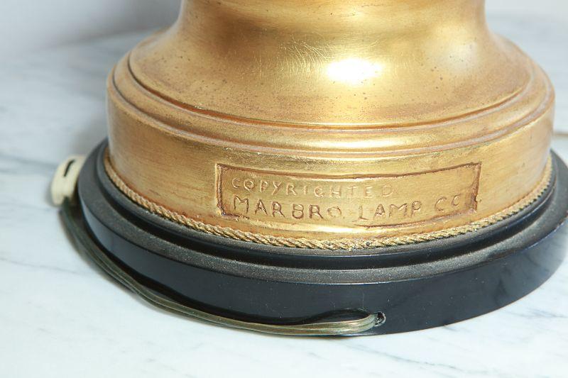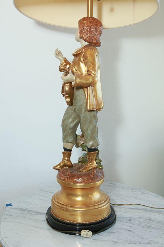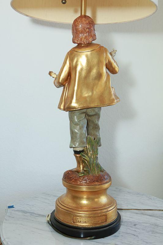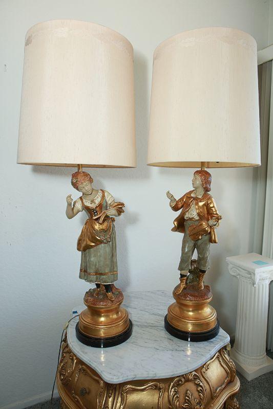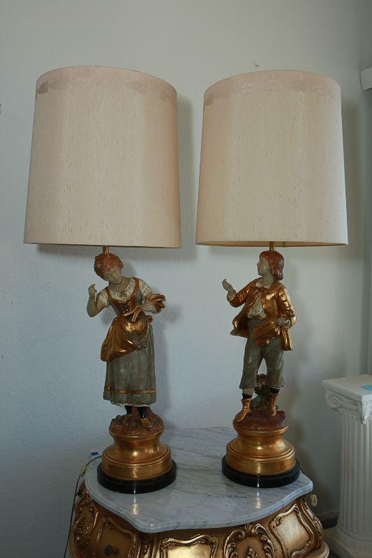 Vintage Marbro Lamp Co figural table lamps. A boy and girl matching pair. Gold paint accents. Heavy. Very little wear, there is a crack in the boys neck. Matching shades included.