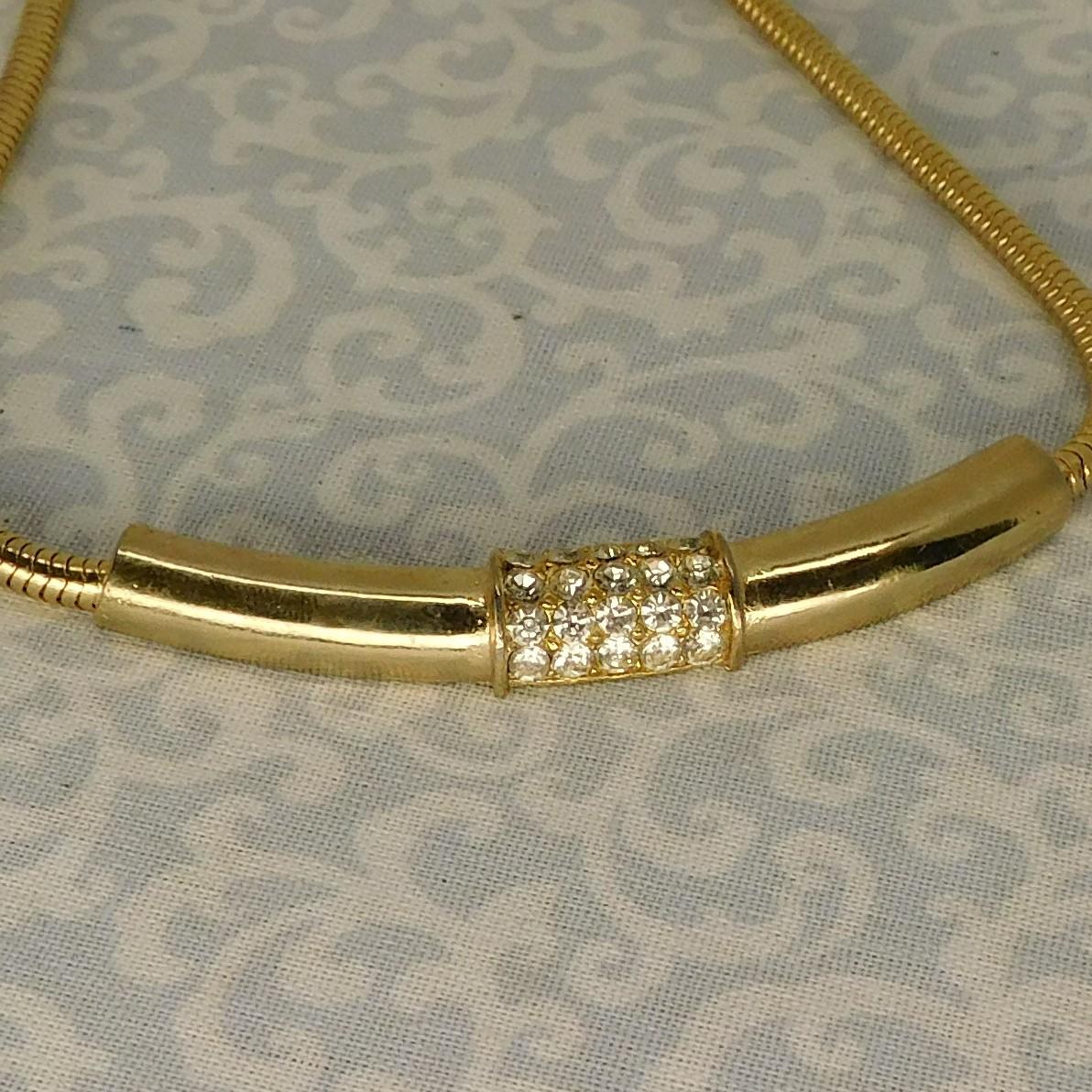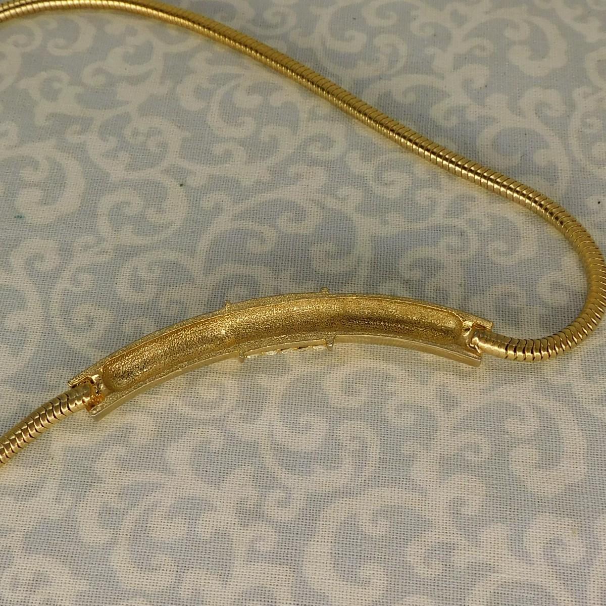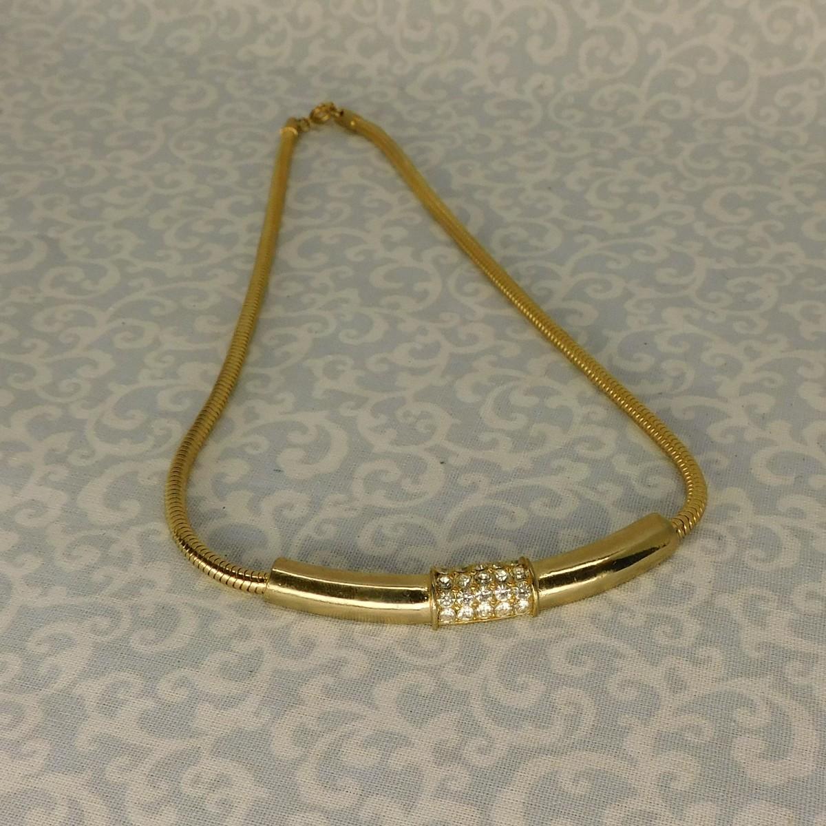 This is a vintage gold snake chain with a center piece of gold and rhinestones necklace. It is about 15 1/2" long.