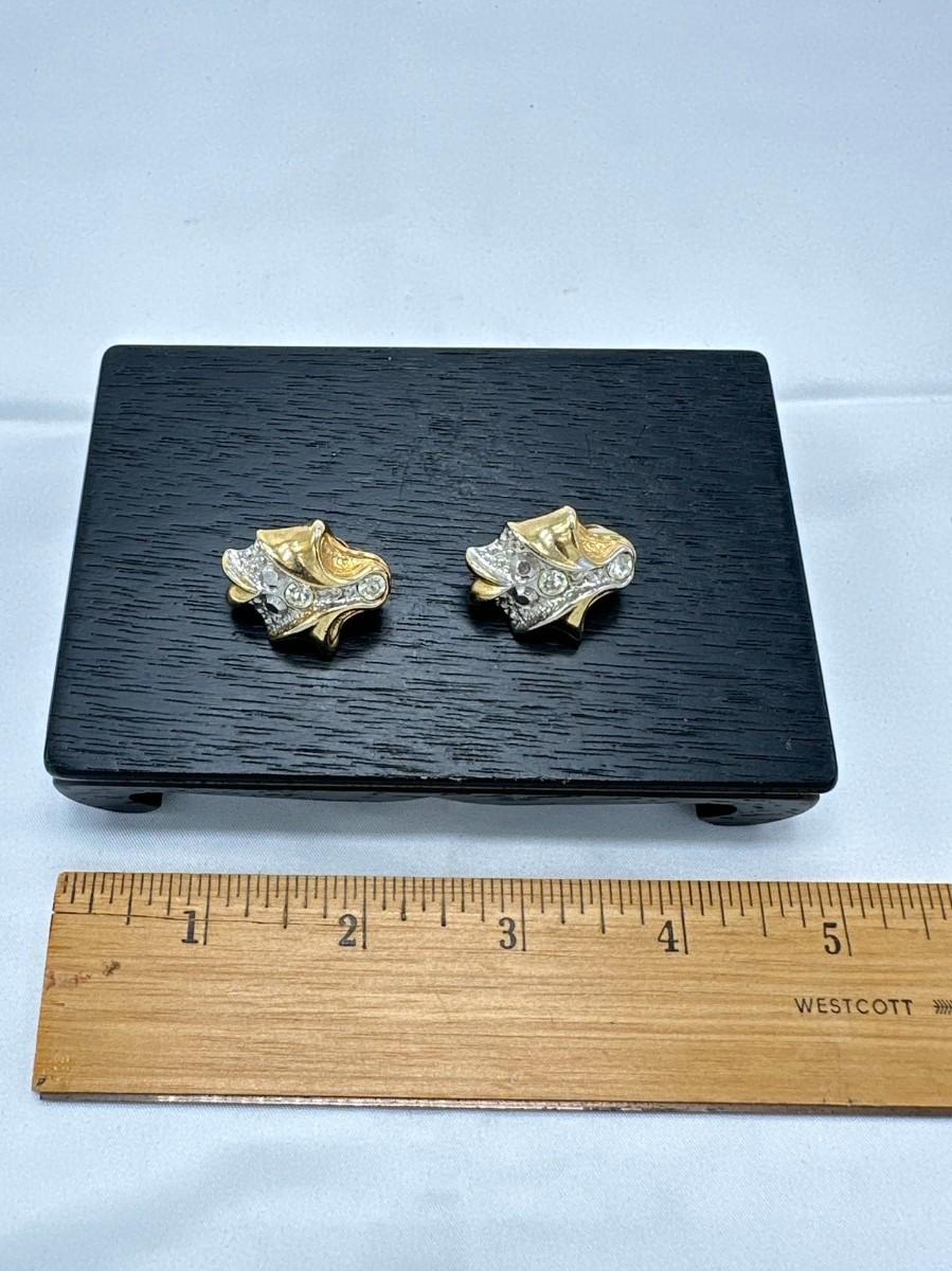 Vintage Gold Plated ribbed Leaf with Clear Crystal Rhinestone Clip Earrings