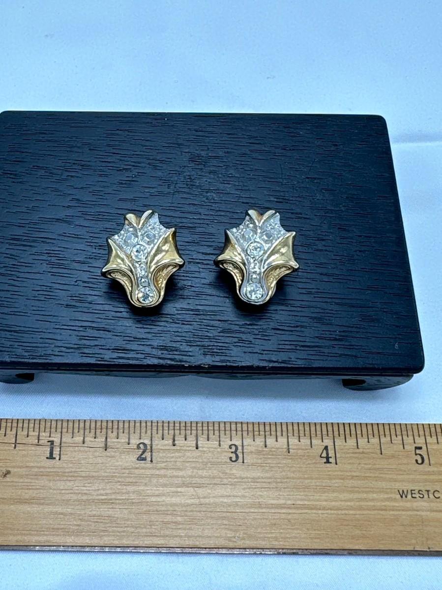 Vintage Gold Plated ribbed Leaf with Clear Crystal Rhinestone Clip Earrings