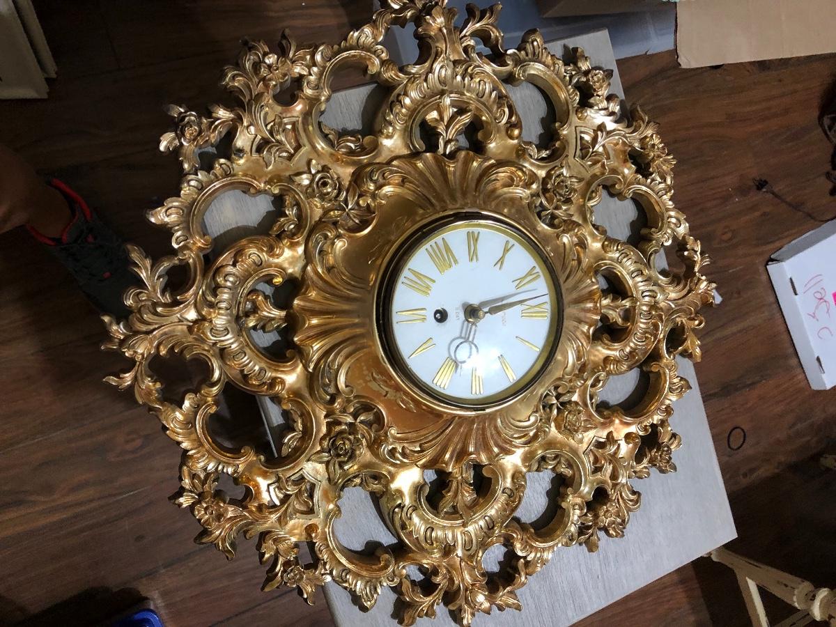 This is a great vintage clock. Measures 18”. I am unsure if it works or not. Glass does open in front.