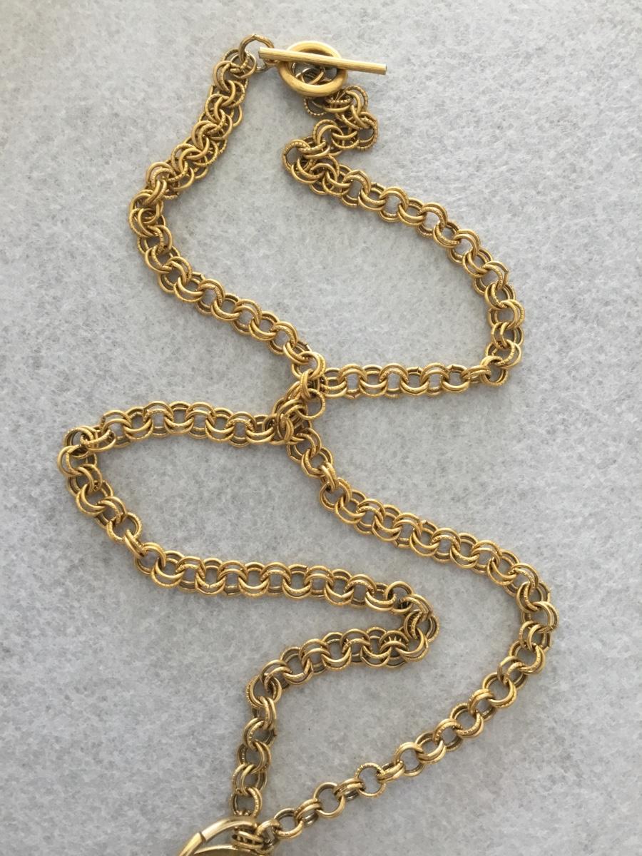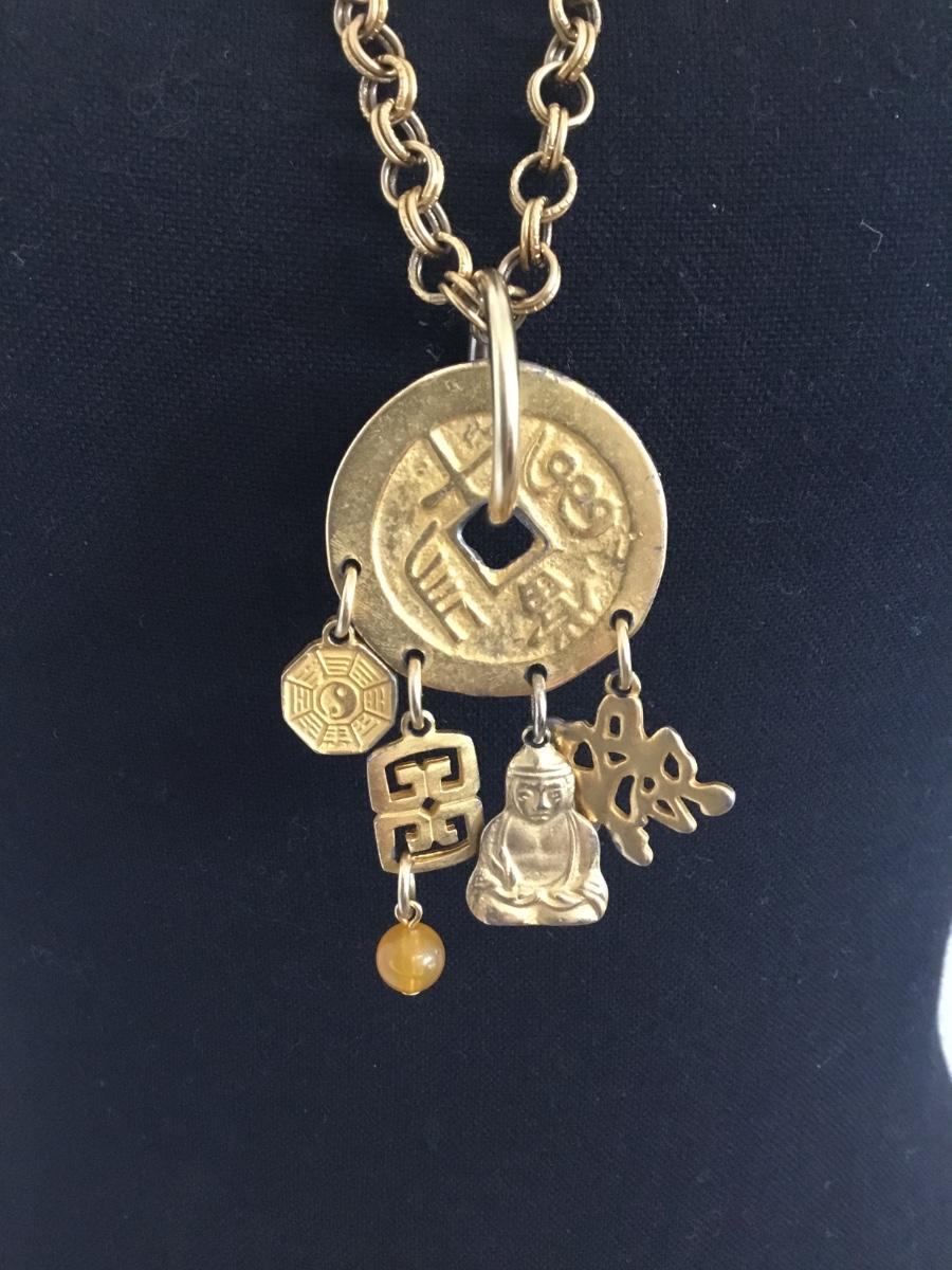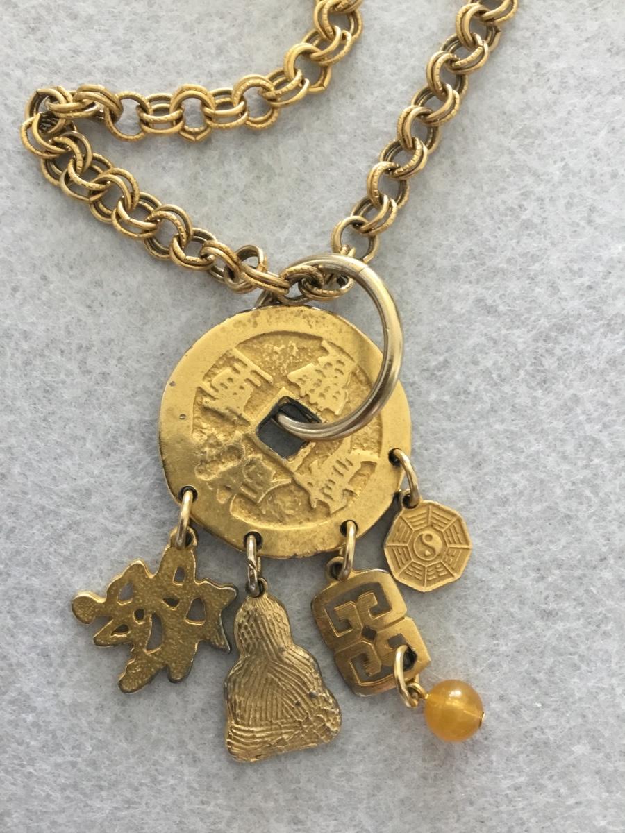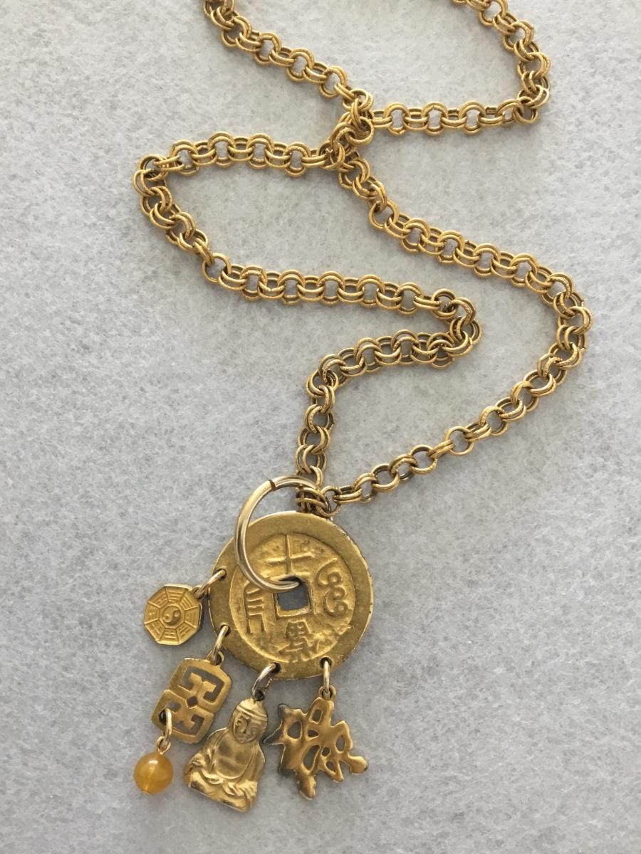 Vintage gold tone 1940s Chinese themed charm pendant, statement, necklace