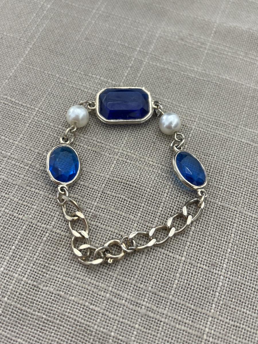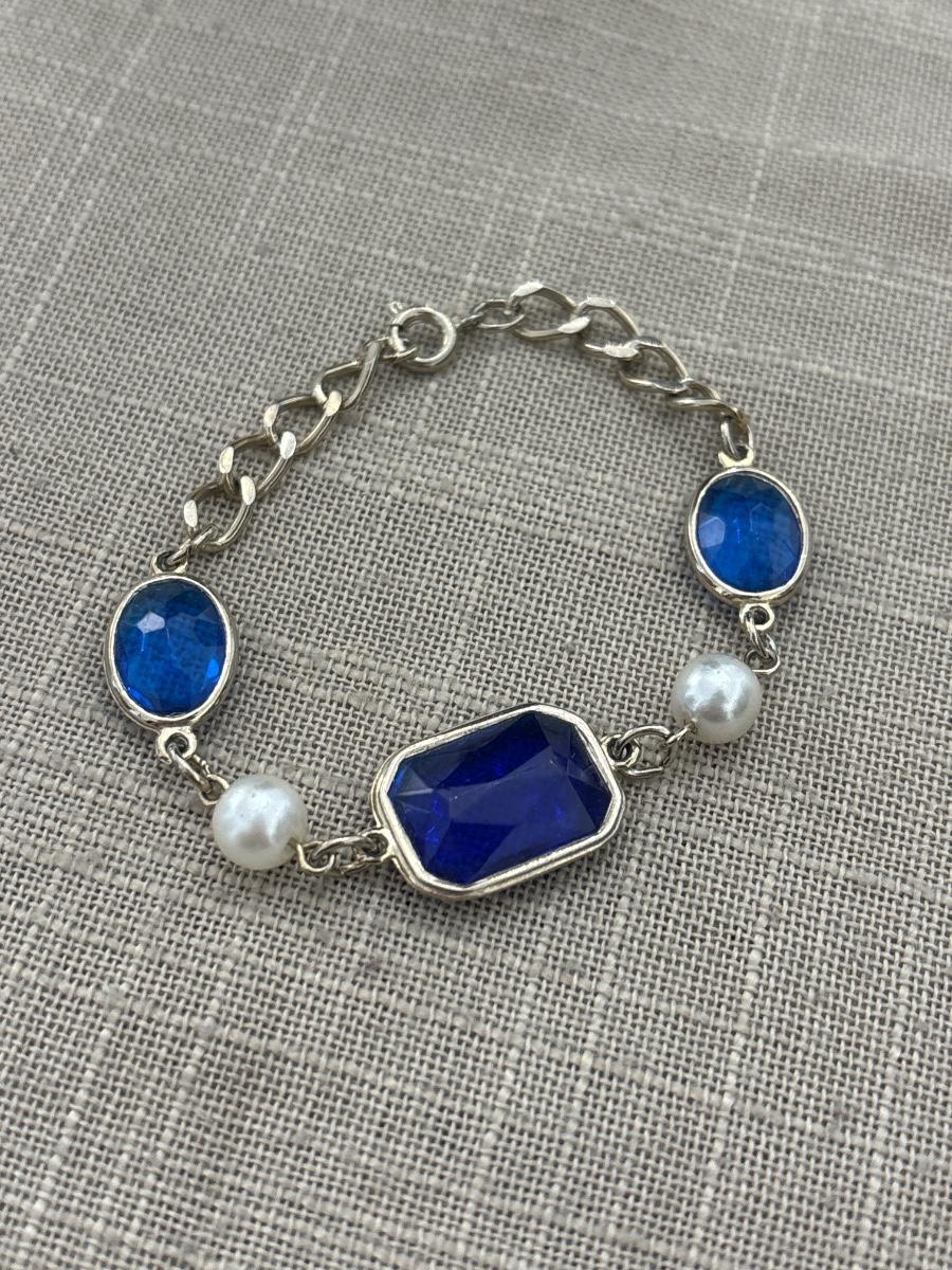 Vintage Gold Tone Bezel Set Cobalt Blue Plastic Rhinestone Faux Pearl Bracelet