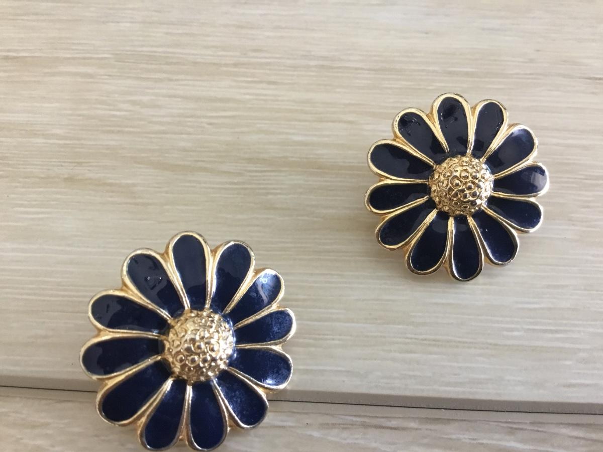 Vintage gold tone, black enamel daisy. Clip on earrings.