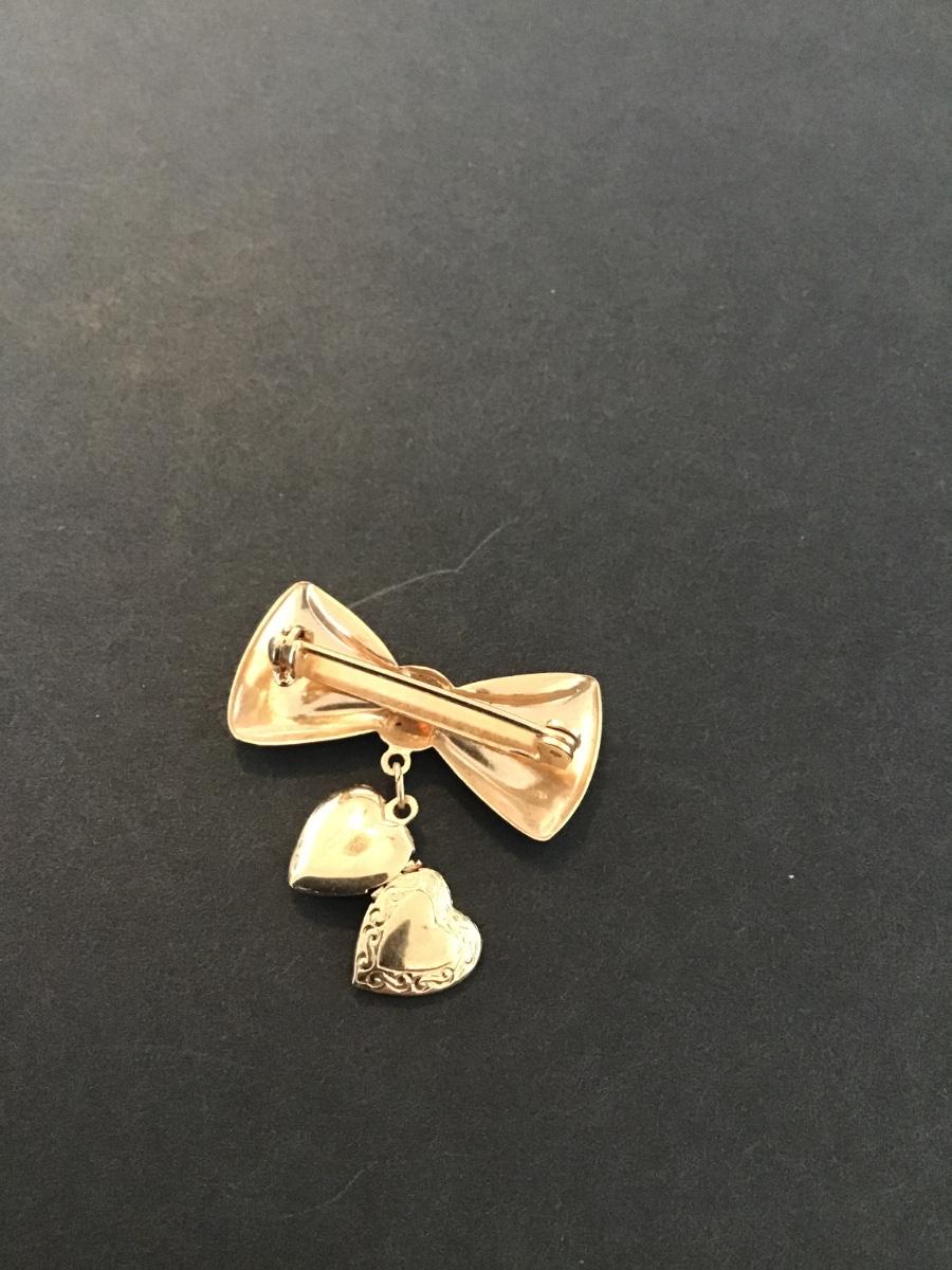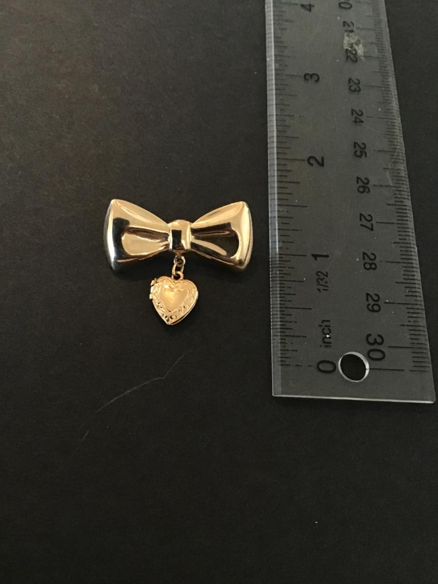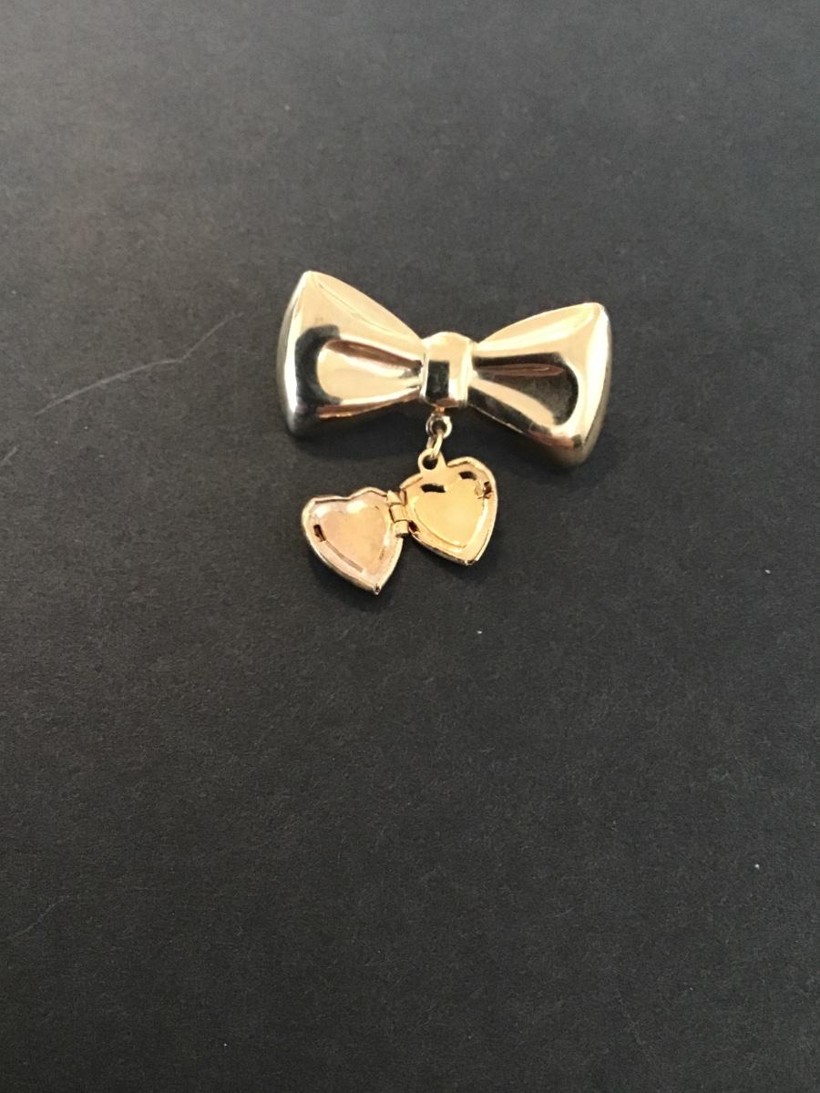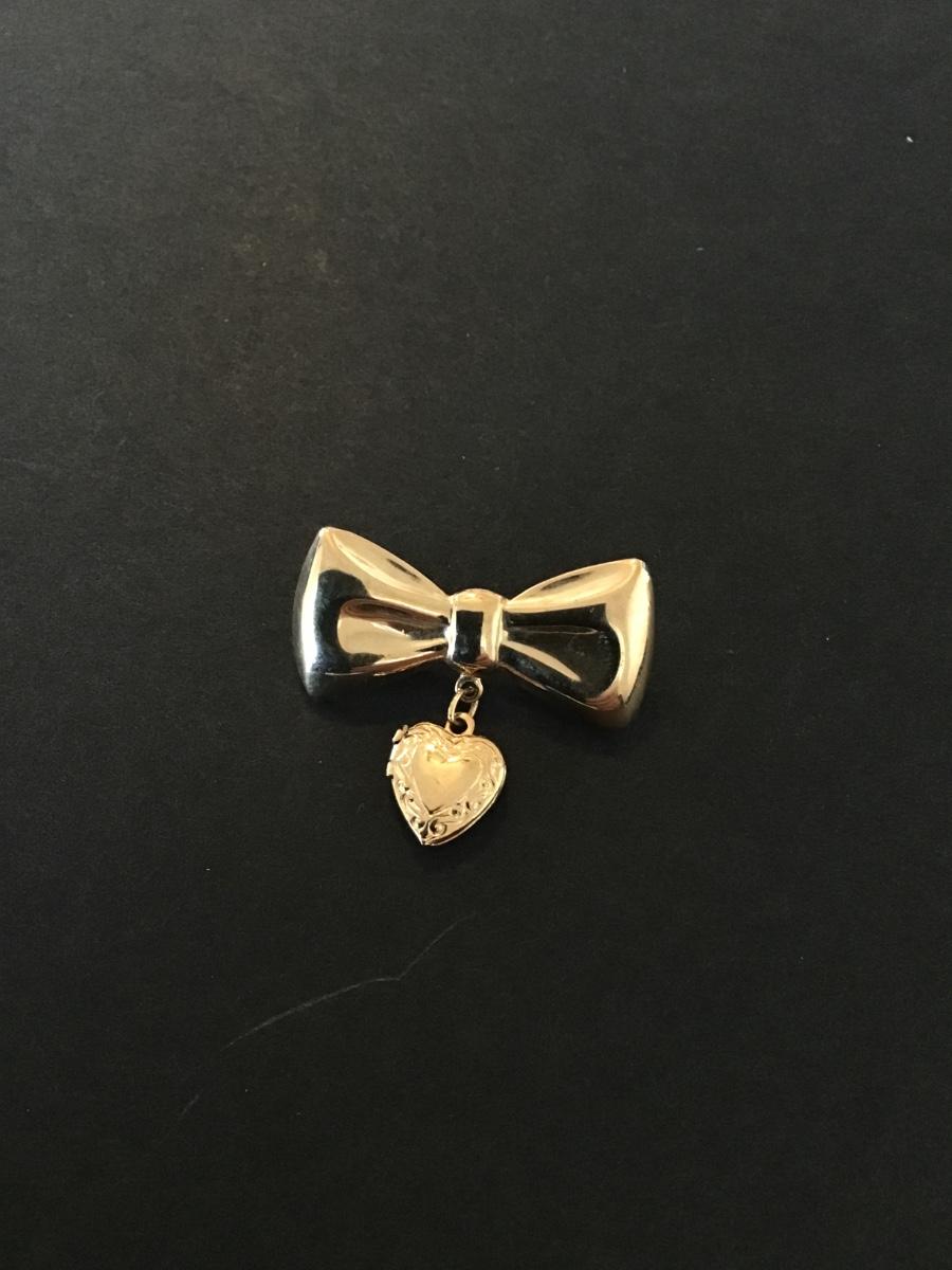 Vintage gold tone bow brooch with dangling heart locket