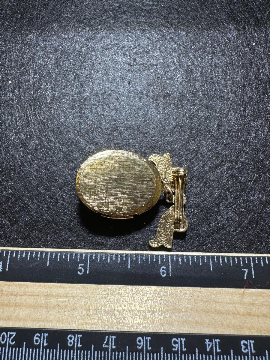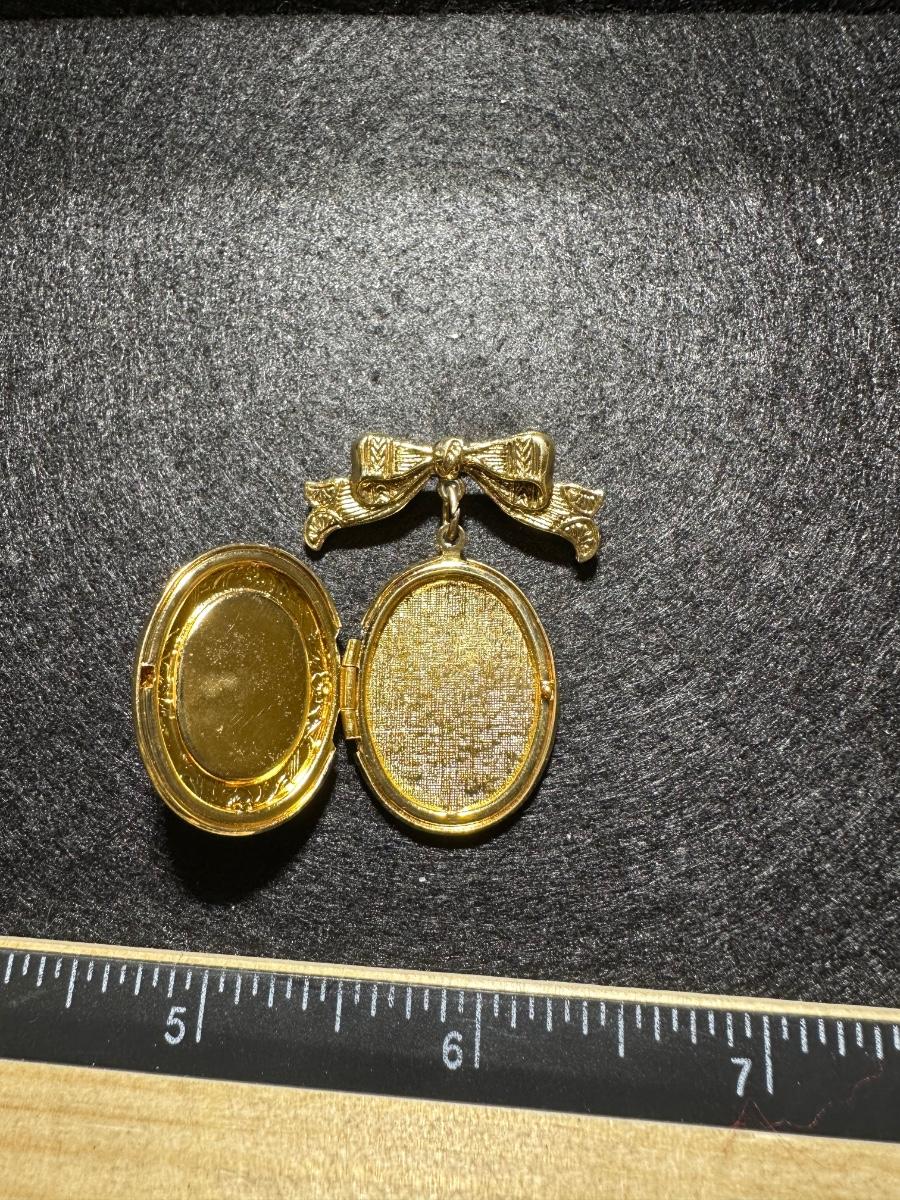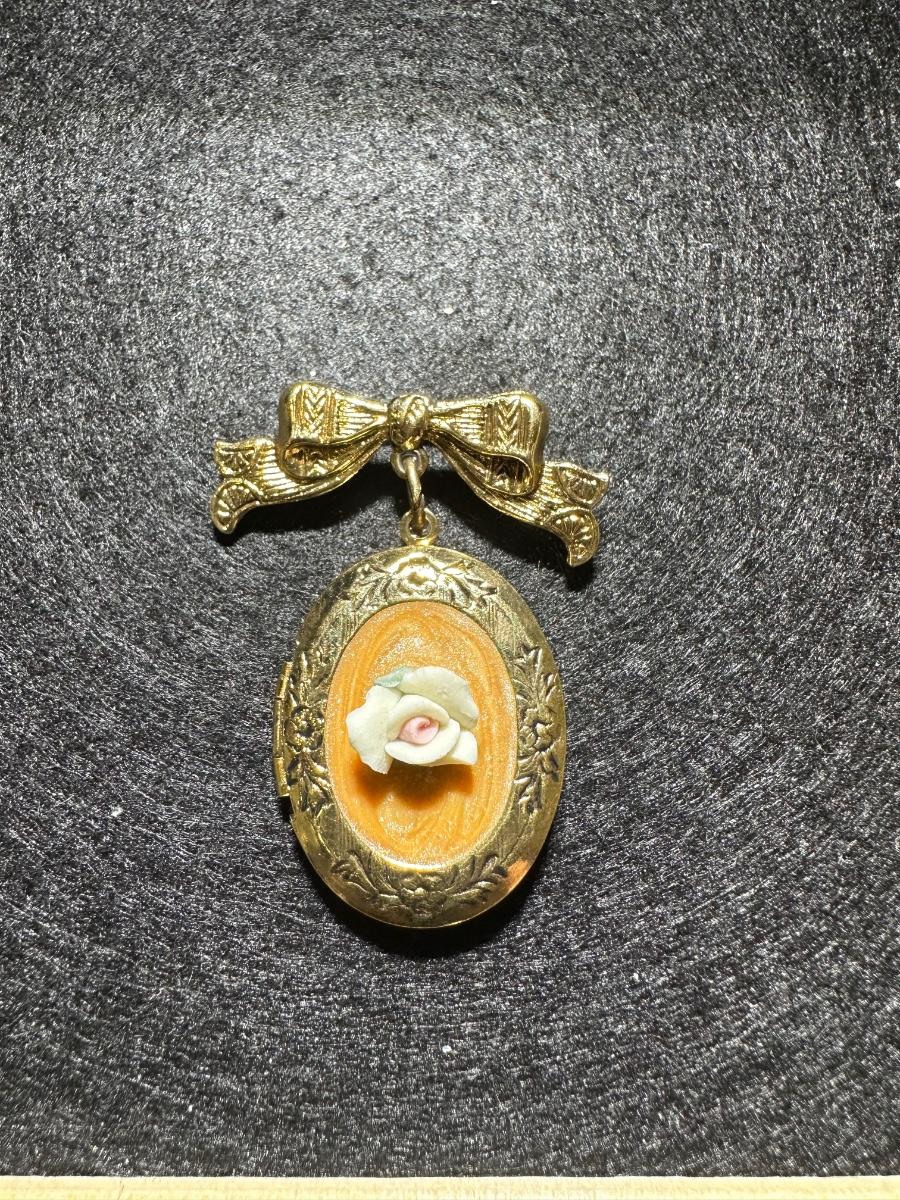 Vintage gold tone bow with dangle picture locket porcelain rose brooch pin