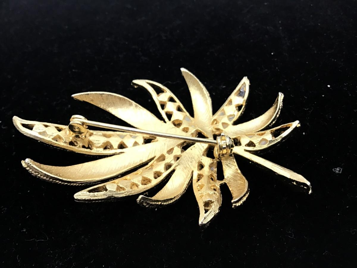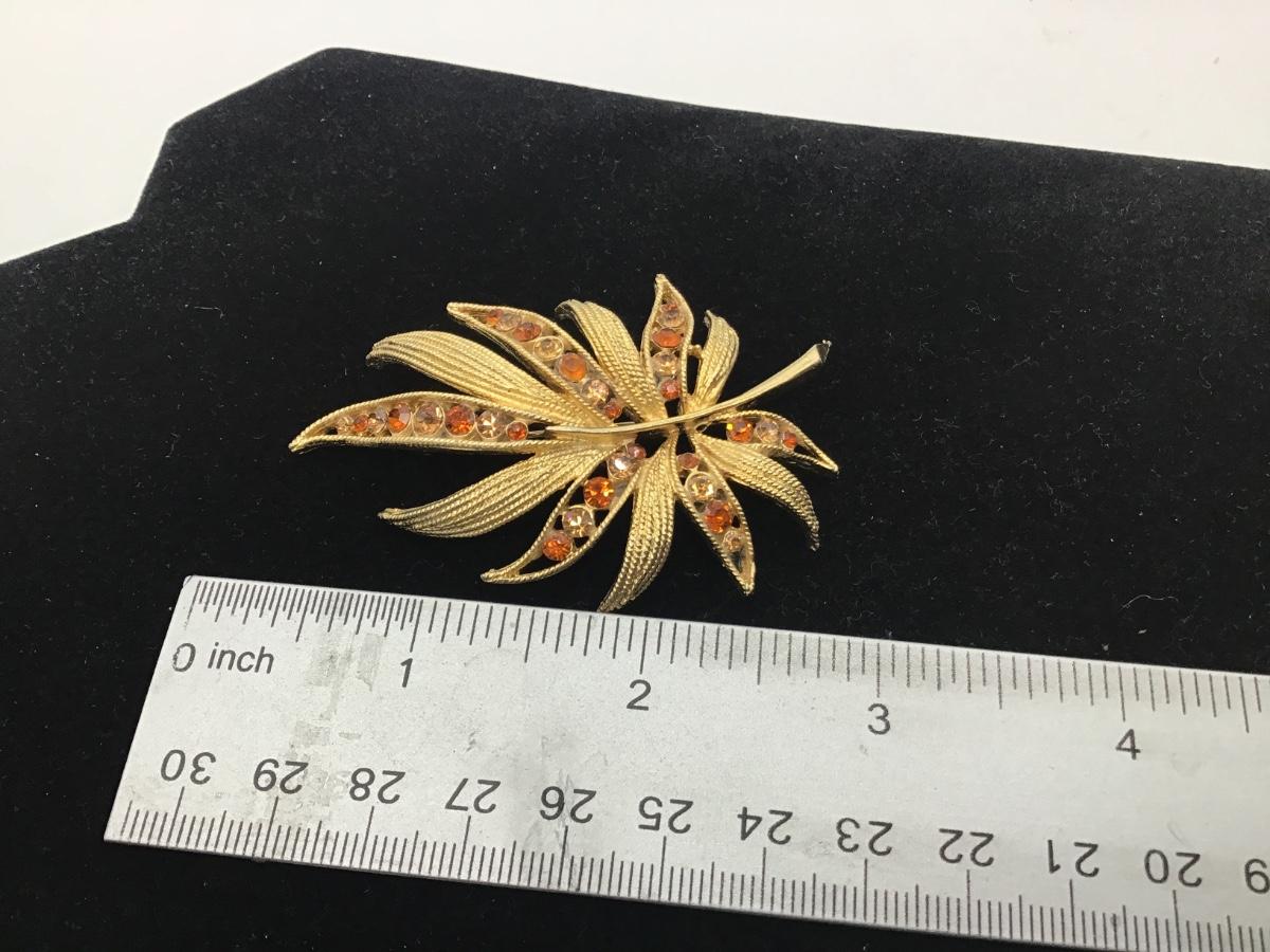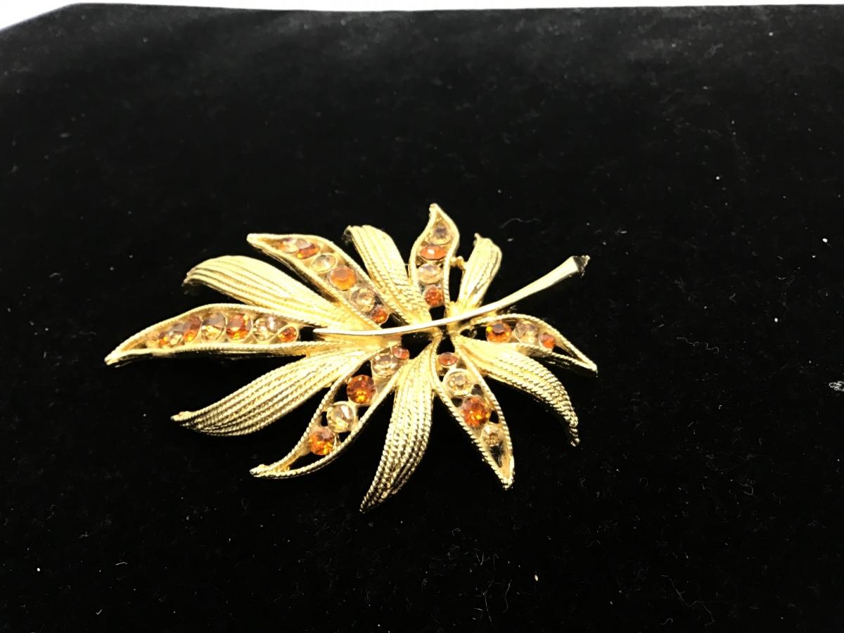 vintage gold tone brown cognac glass Rhinestone floral brooch