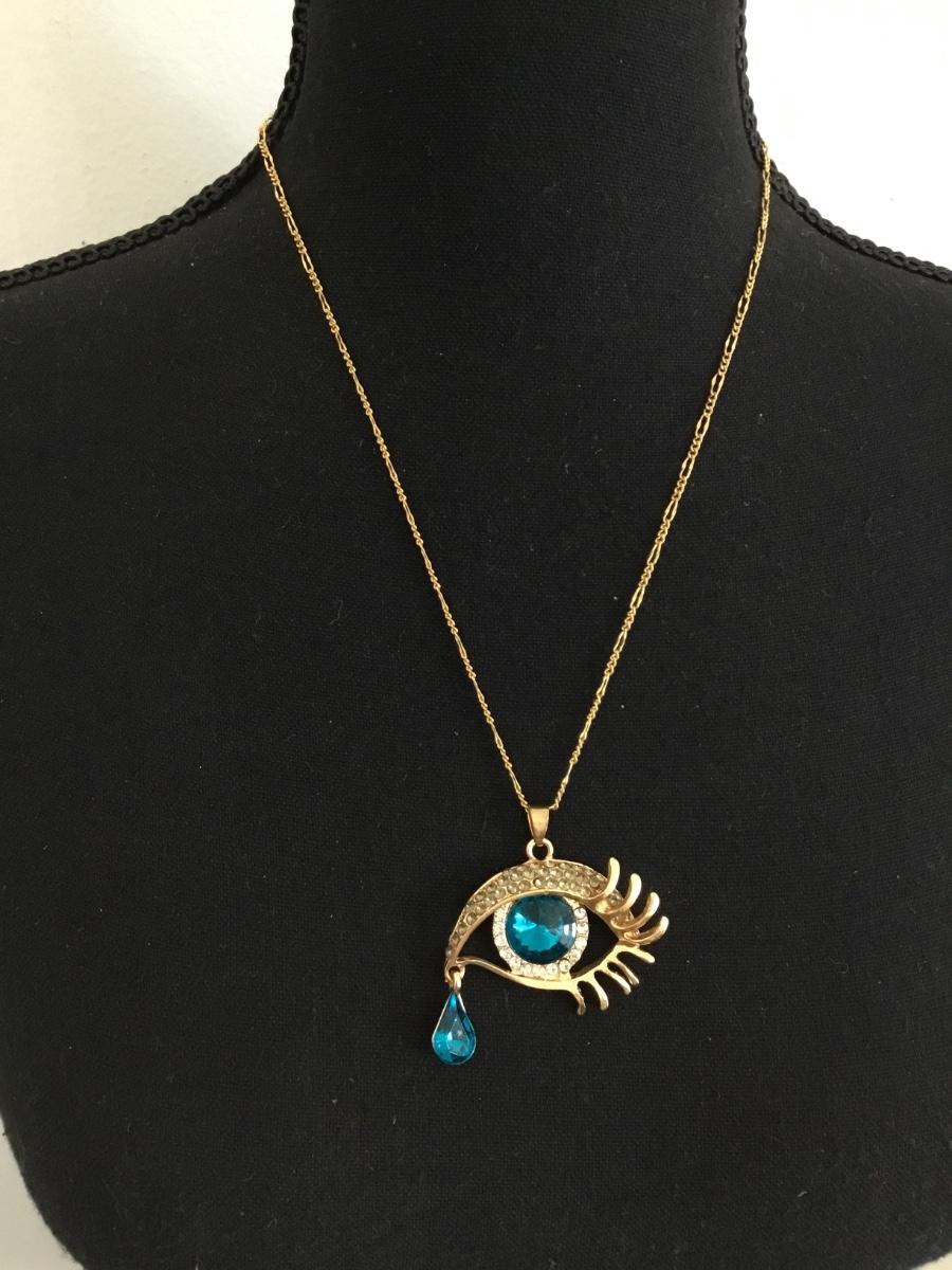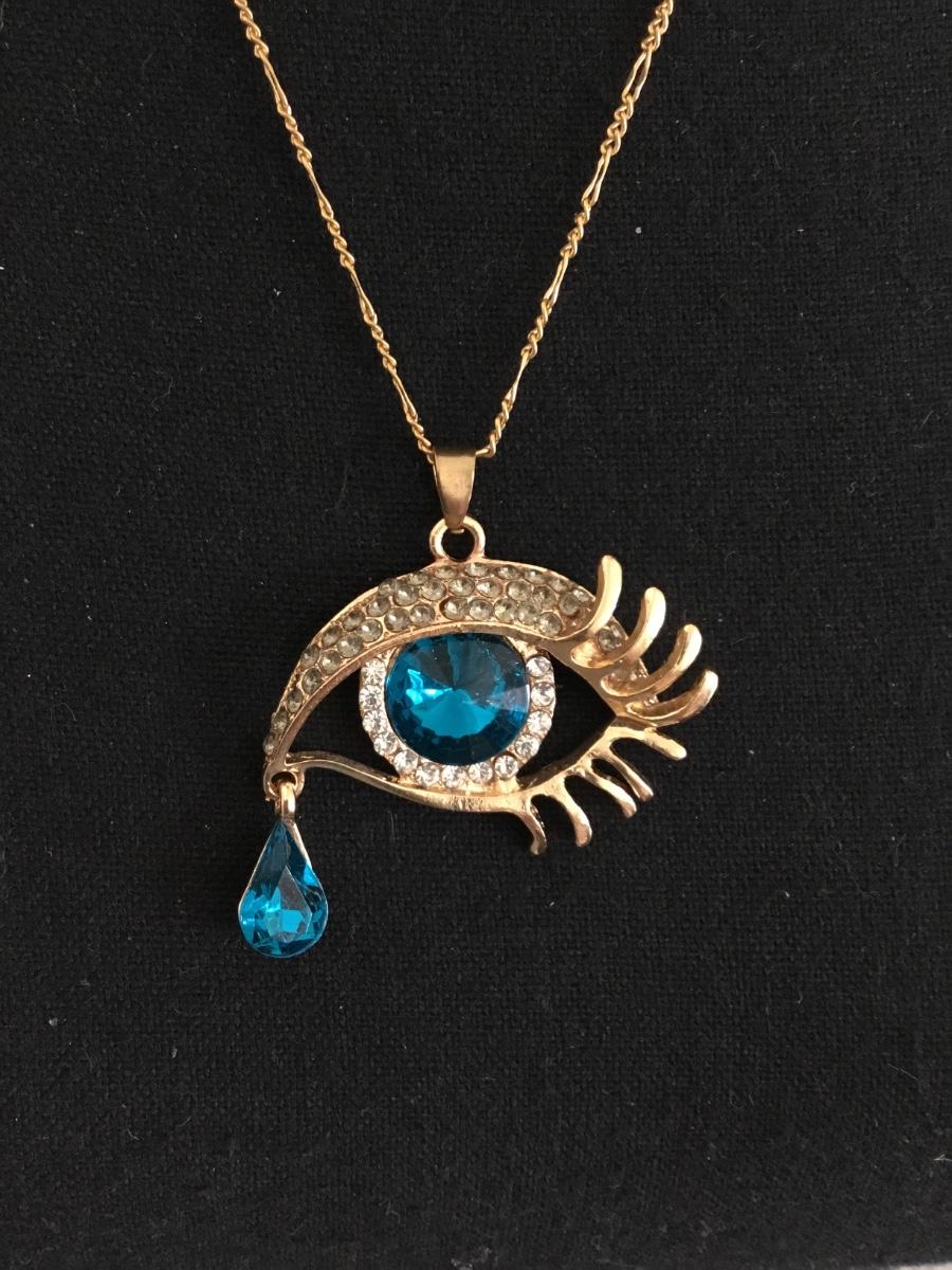 Vintage gold tone chain necklace & blue rhinestone eye pendant