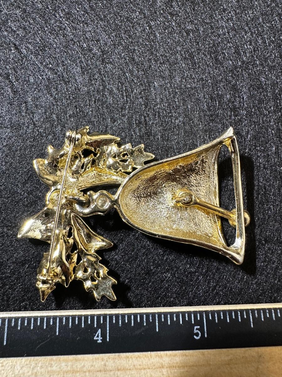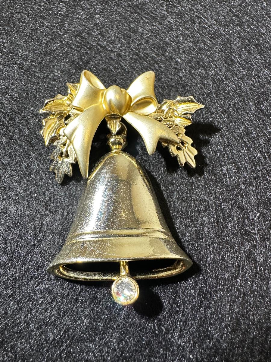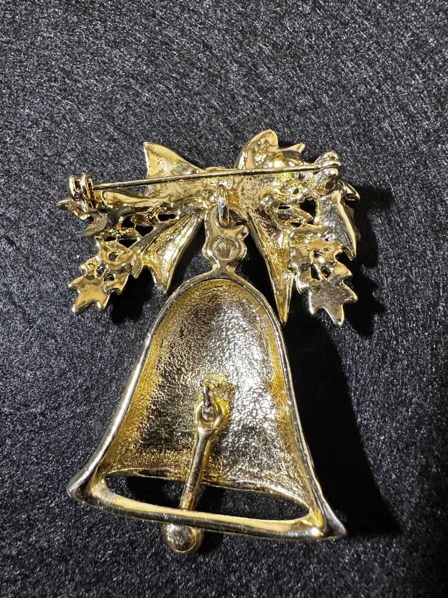 Vintage gold tone Christmas bell and bow brooch articulated bell