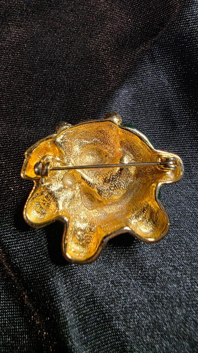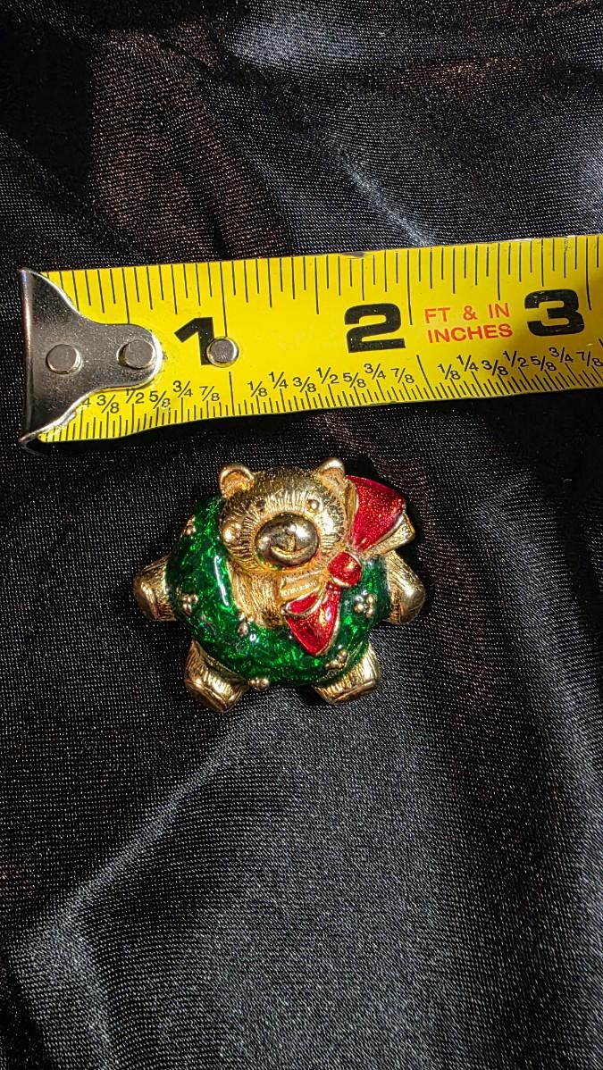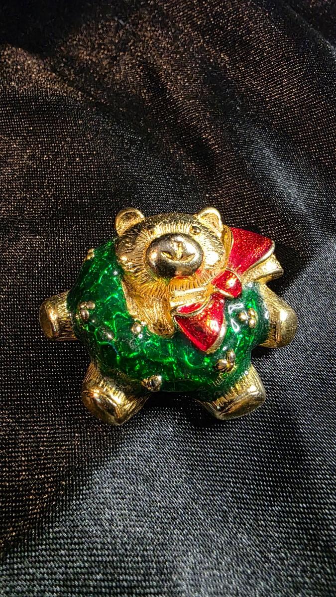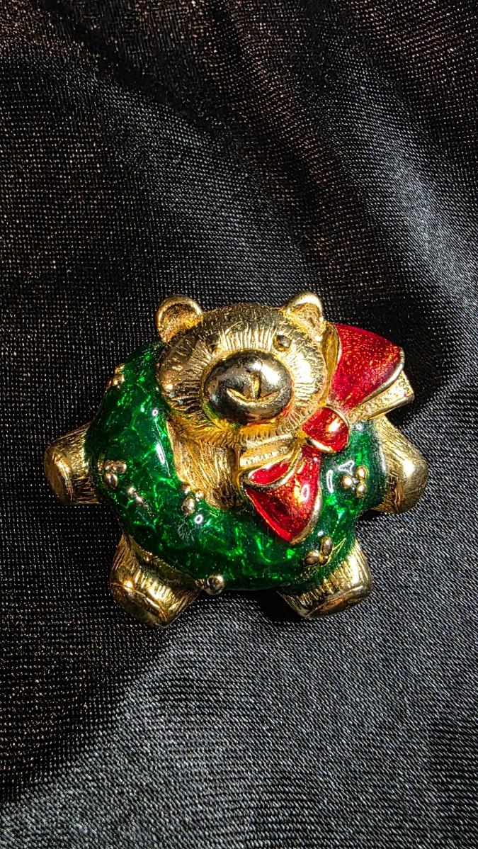 In the twinkling hush of a holiday hearth, where firelight dances across wrapped gifts and the air hums with cinnamon and pine, a teddy bear brooch emerges as the season's sweetest sentinel—plump and plush in gold tone metal, his round face beaming with button eyes and stitched smile, wrapped in a shimmering green enamel wreath dotted with holly berries, tied at the throat with a bold red enamel bow that flutters like a ribbon from Santa's sleigh. The pin's curved back secures with a sturdy clasp, every detail— from the bear's fuzzy ears to the wreath's textured leaves—crafted with the joyful precision of 1980s holiday jewelry that turns lapels into stages for festive cheer.