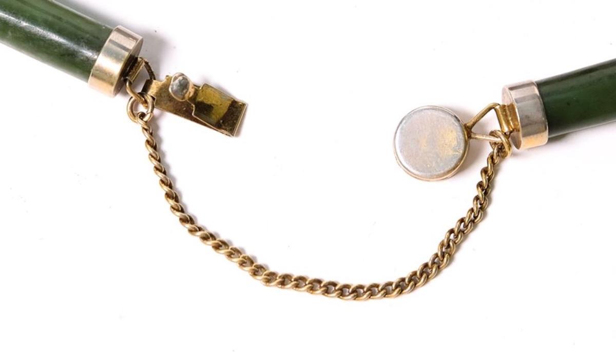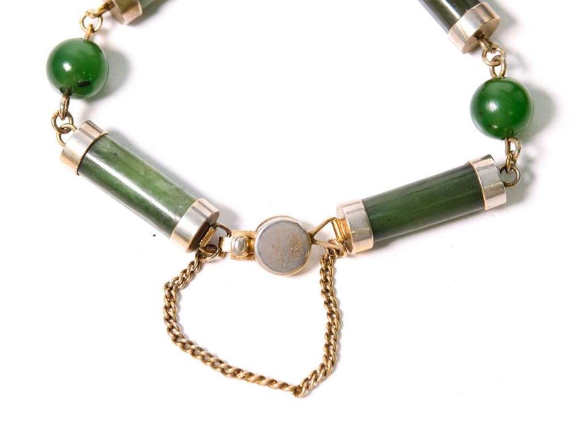 Testing as chrysoprase. Has safety chain. Apparently unmarked. Measures approx. 6". Note: Some gold is rubbing off.