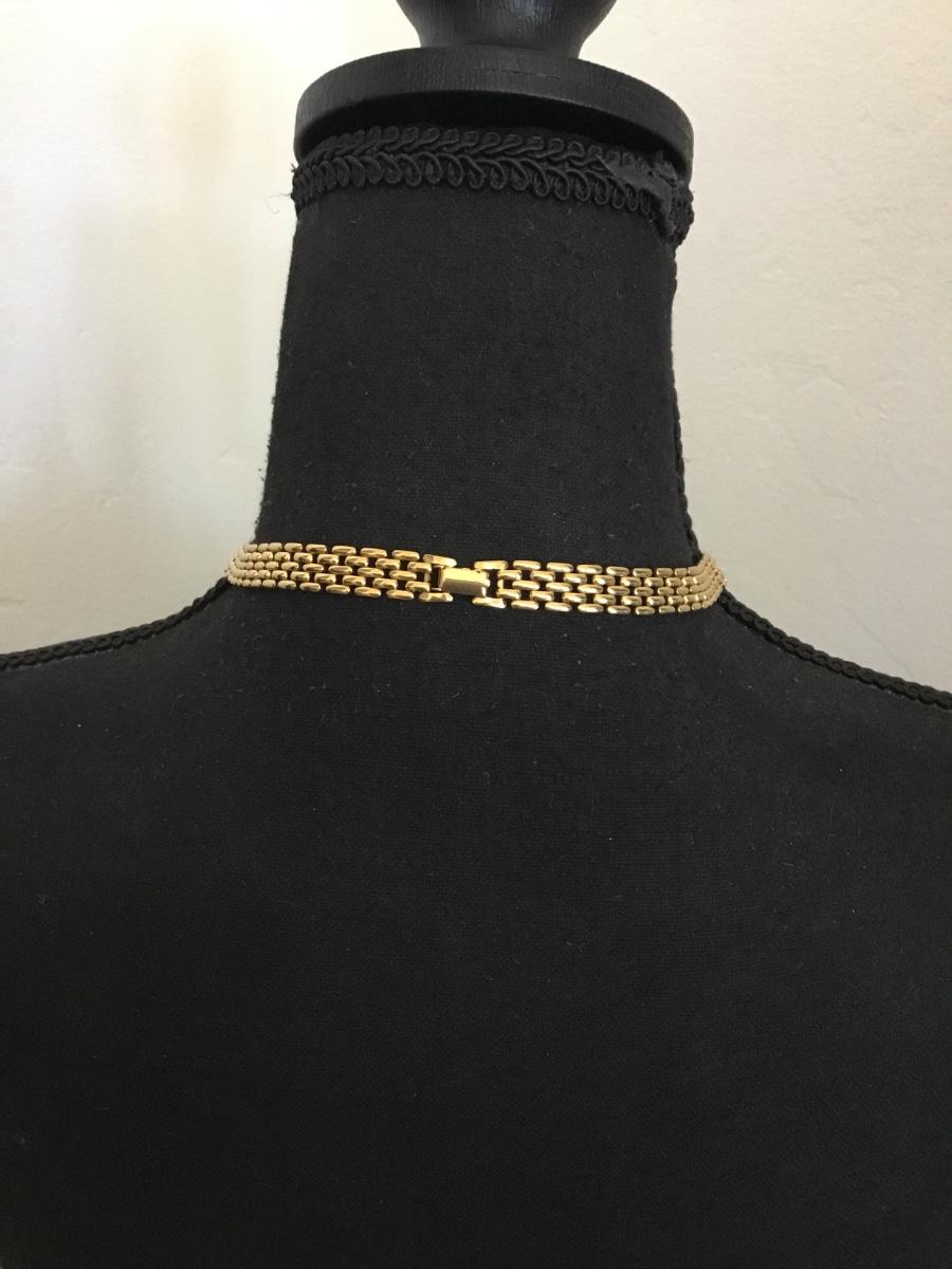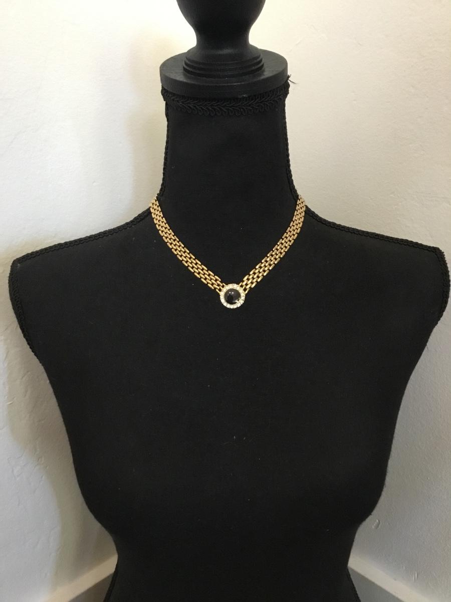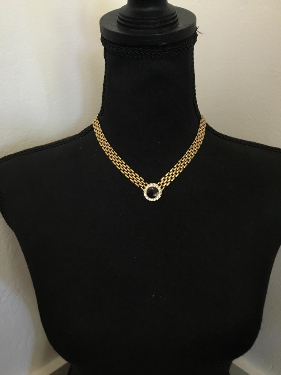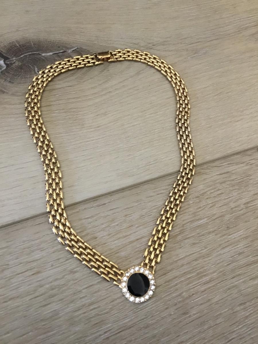 Vintage gold tone, enamel black rhinestone, statement necklace