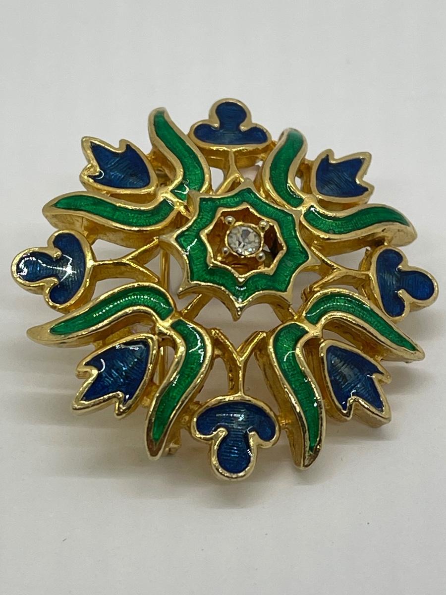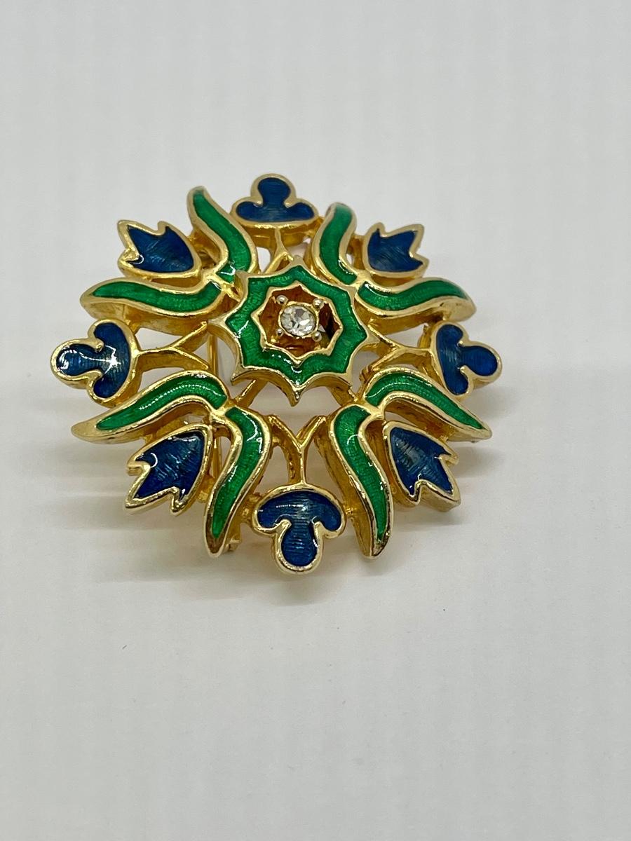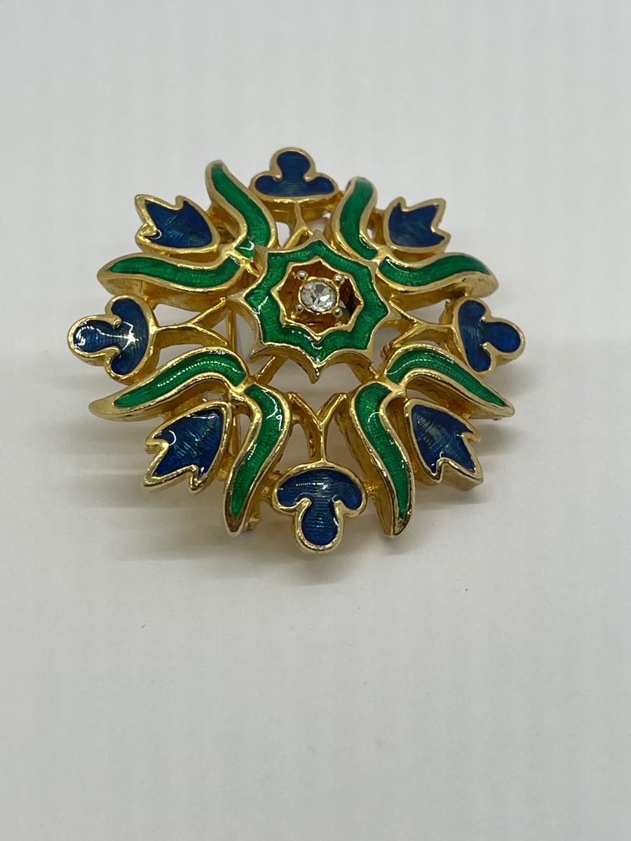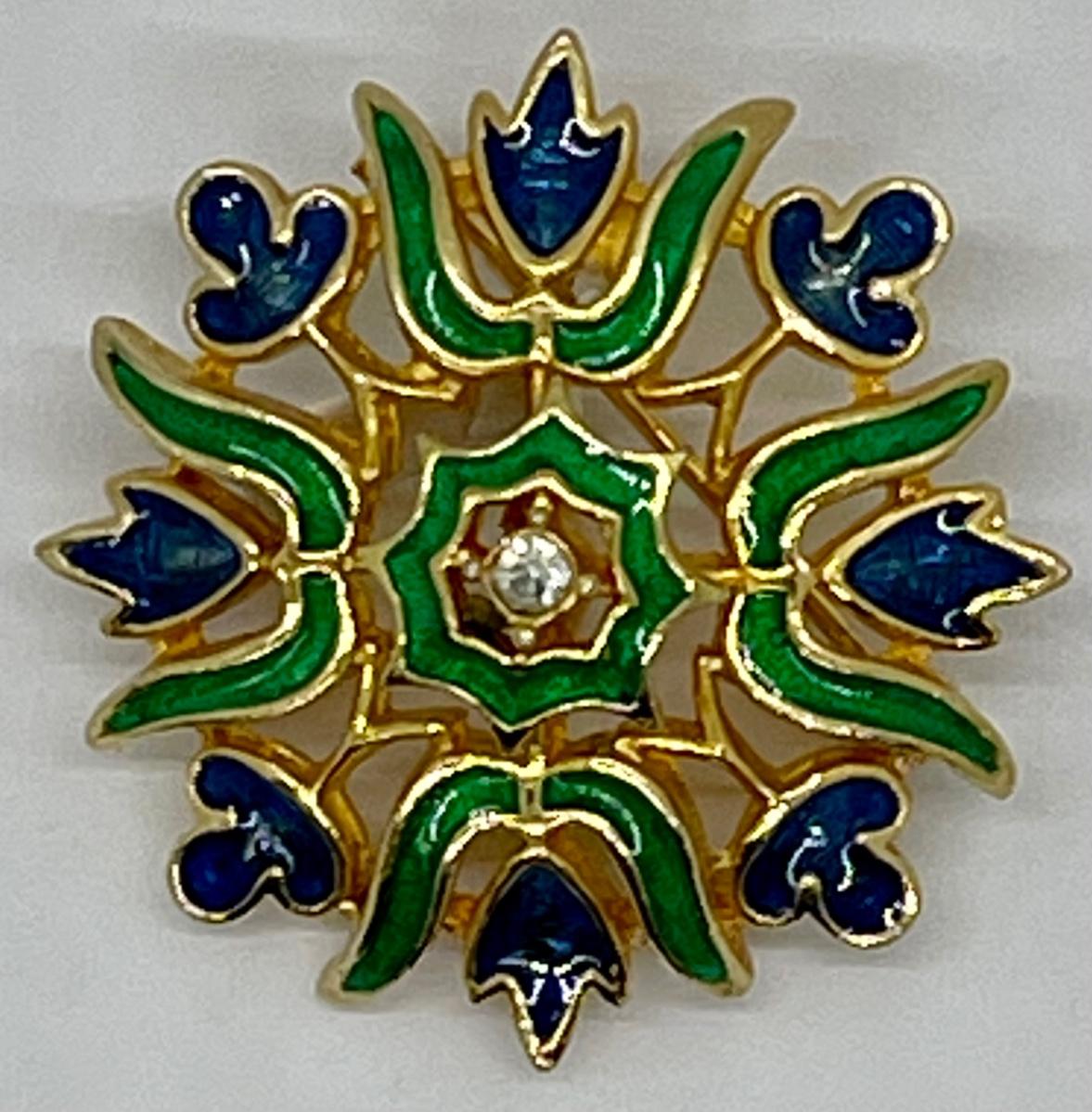 Vintage Gold Tone Enameled Medallion Pin Brooch. Blue and green enamel with rhinestone center. Good condition. About 1.5" size. Signed Polcini on the back.