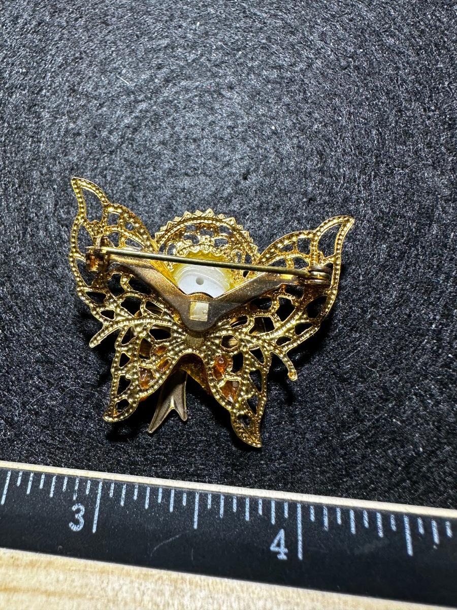 Vintage gold tone faux pearl butterfly ribbon brooch