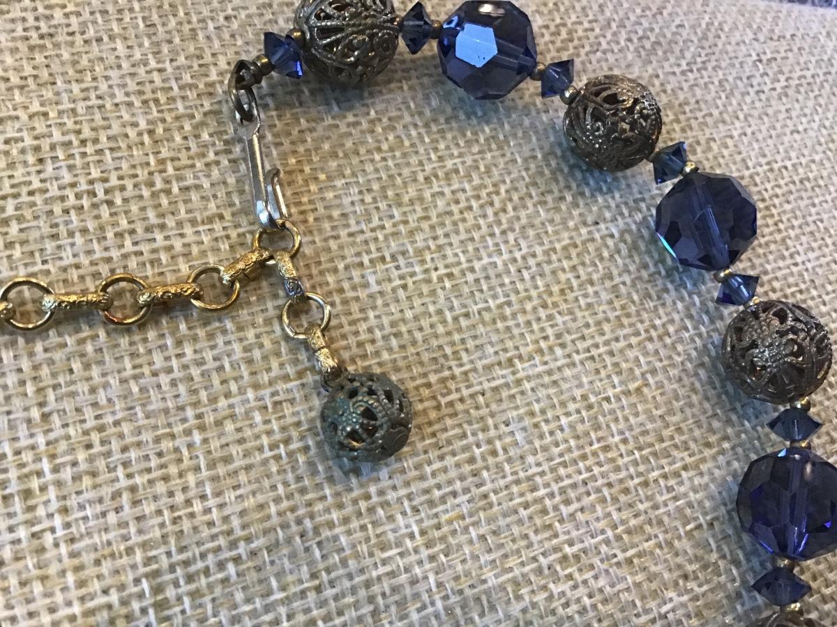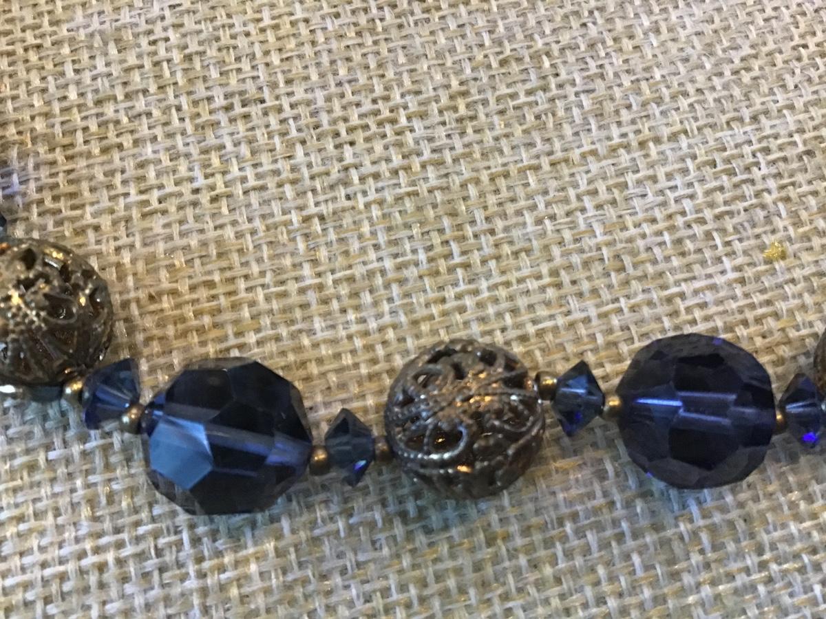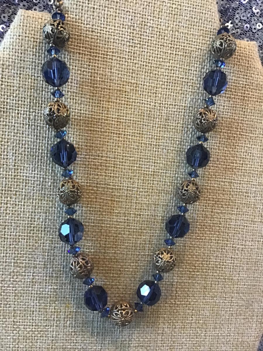 VINTAGE GOLD TONE FILIGREE BEAD BALL AB BLUE CRYSTAL STRAND NECKLACE