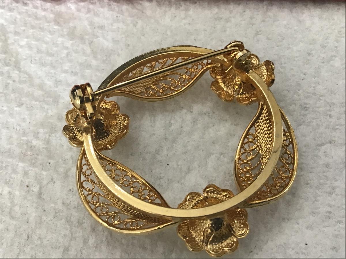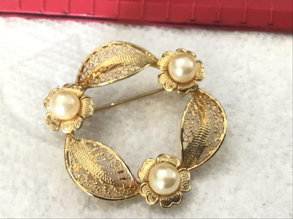 Vintage Gold Tone Filigree Brooch Pearl Flower Leaves