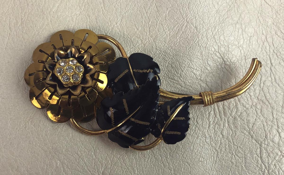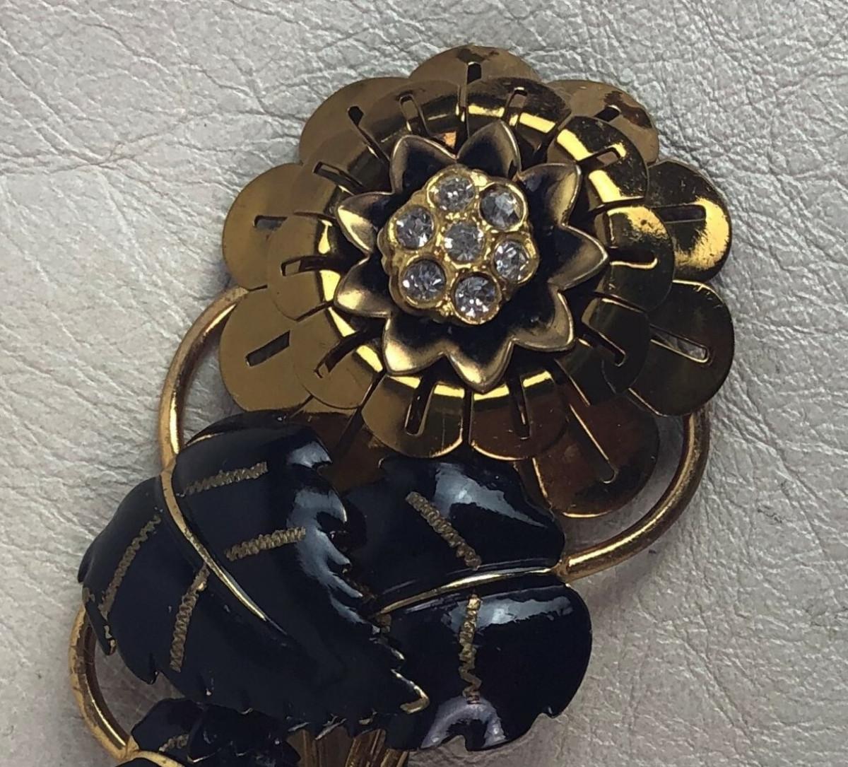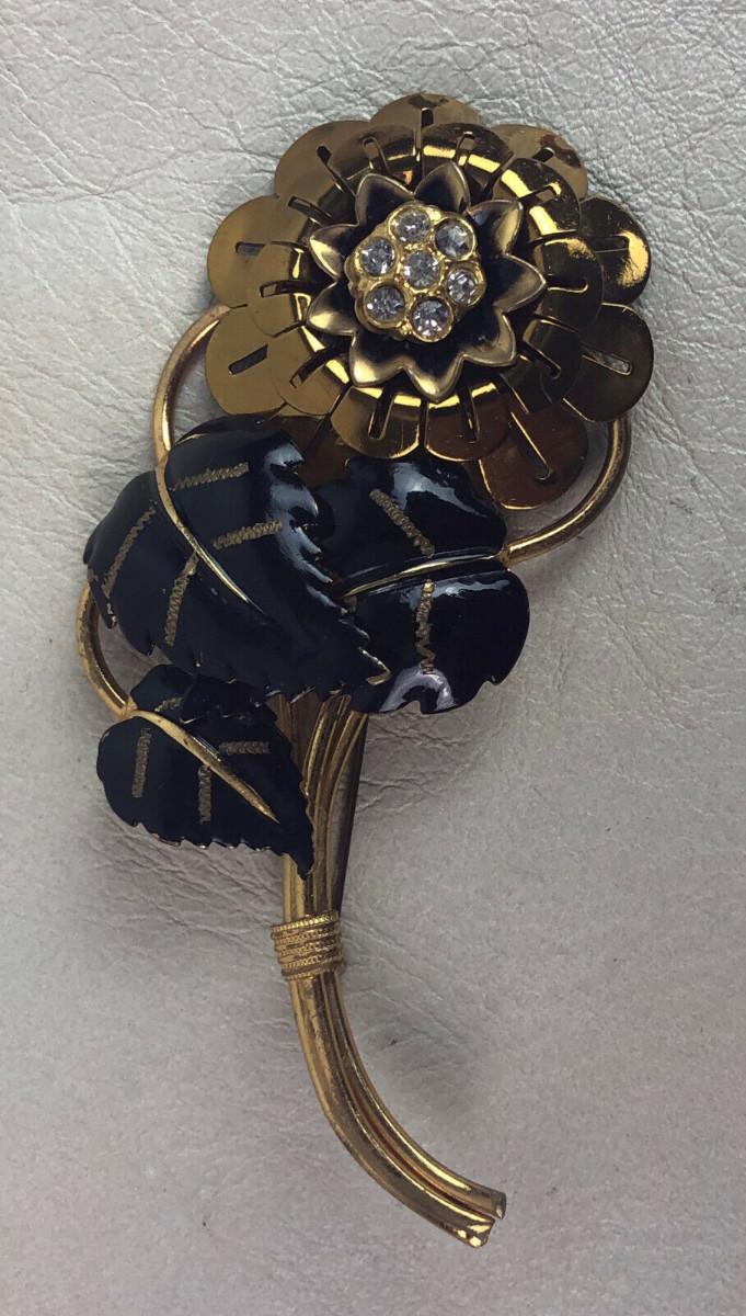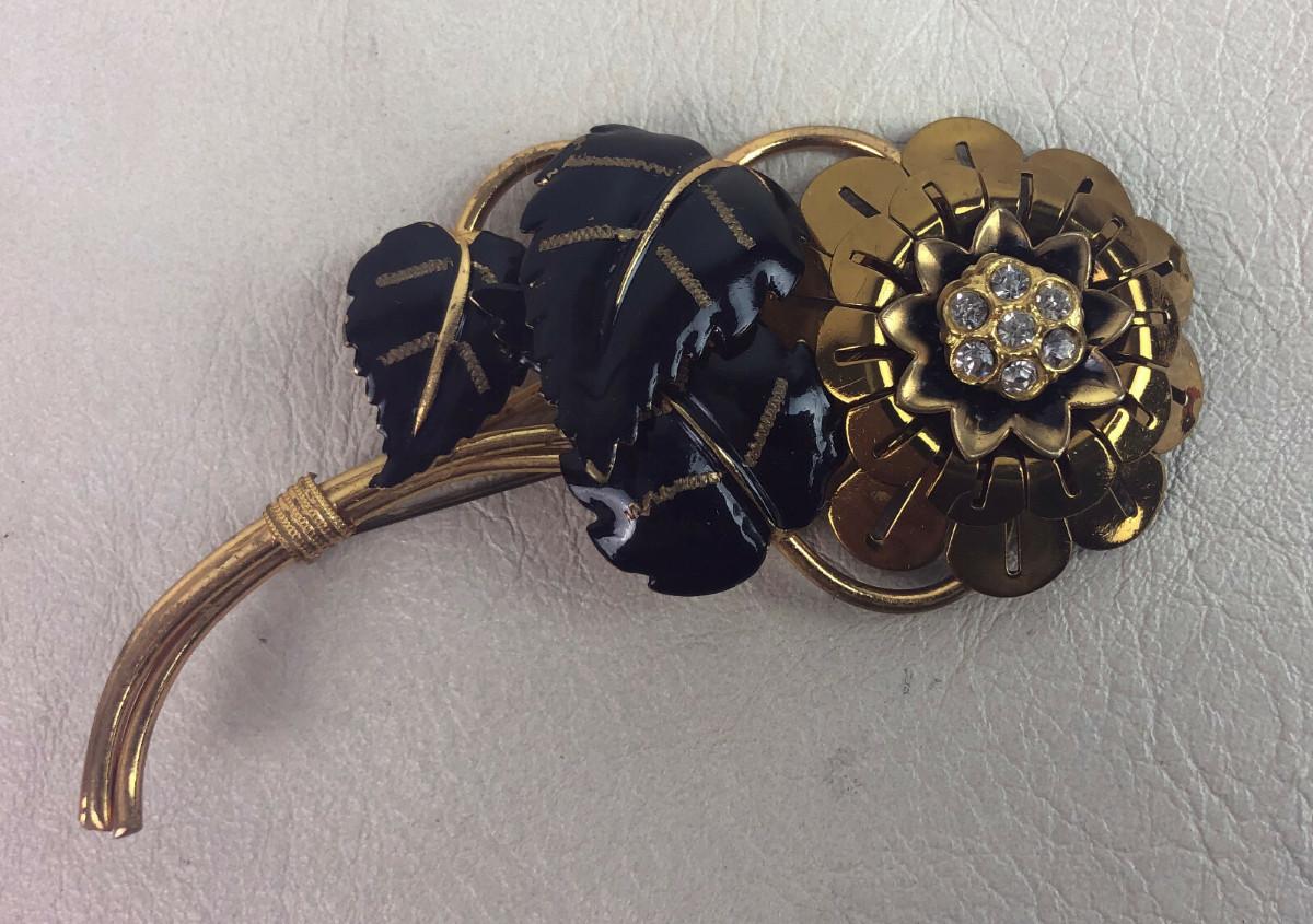 vintage GOLD TONE FLORAL BROOCH BLACK ENAMEL LEAVES WHITE RHINESTONES