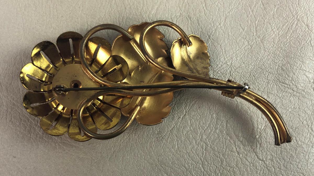 arge retro floral brooch...with goldtone metal setting..white rhinestones as the stamen center and enameled glossy black leaves...3 7/8" long...Unsigned...Excellent condition..
