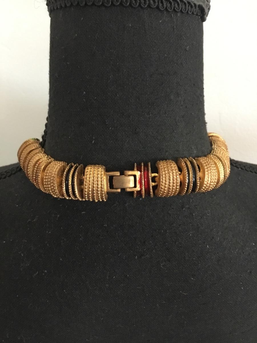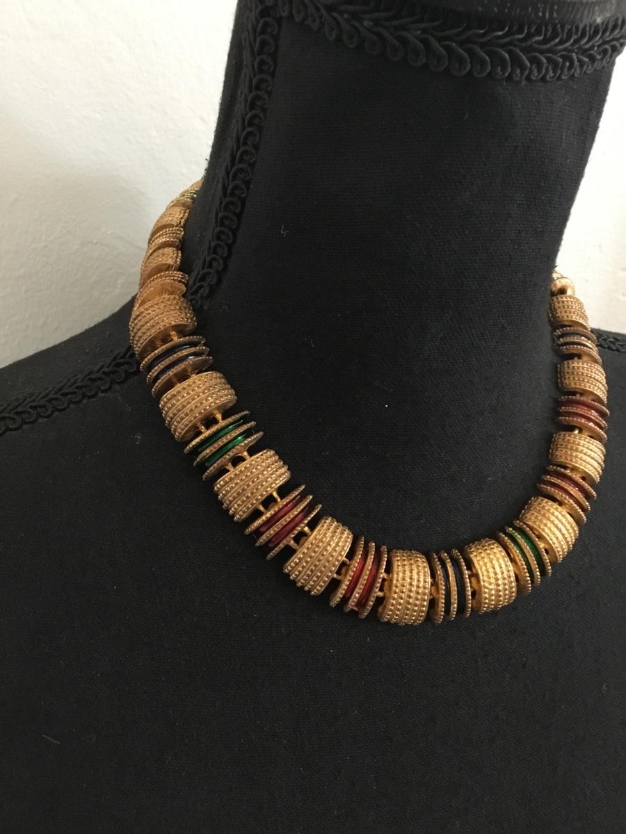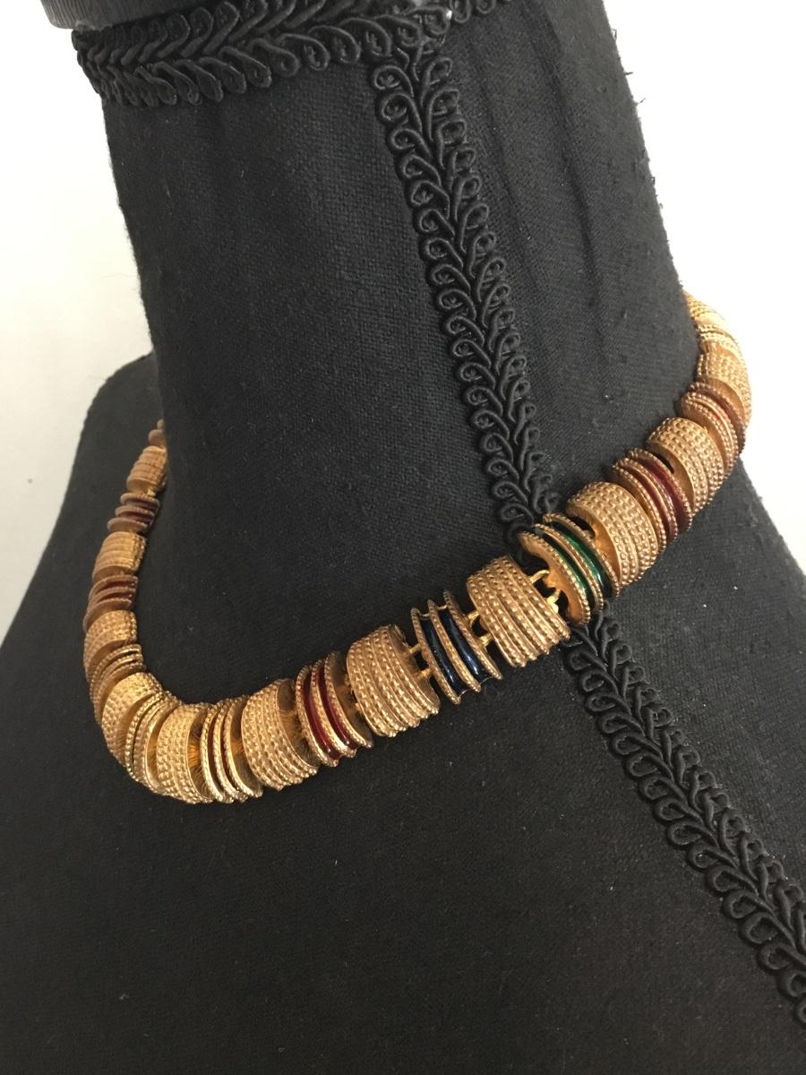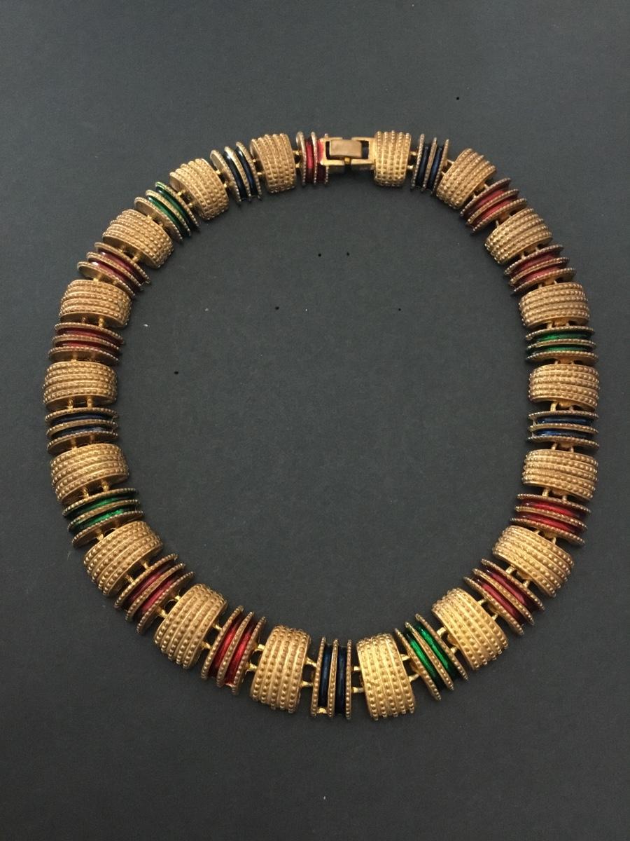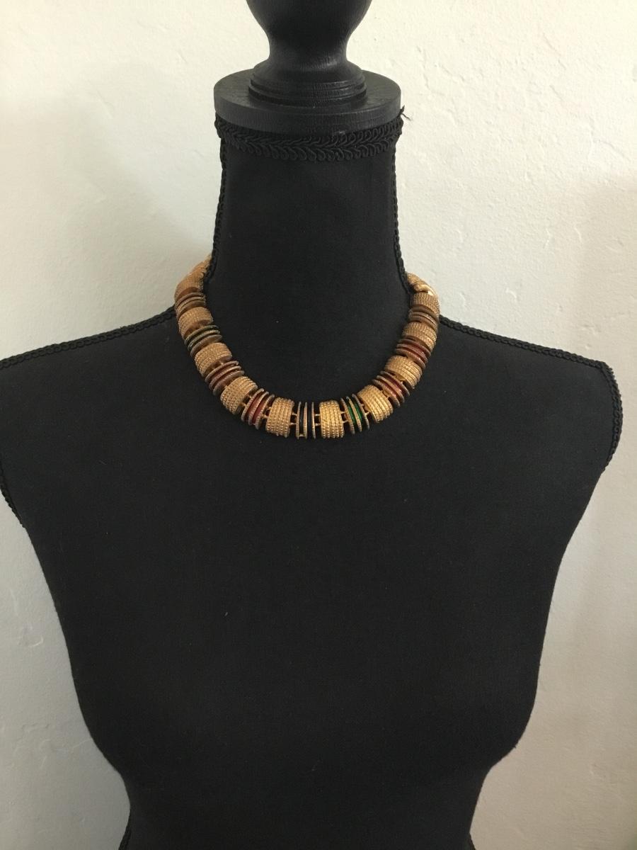 Vintage, gold tone, heavy metal, multicolored, enamel statement, collar necklace
