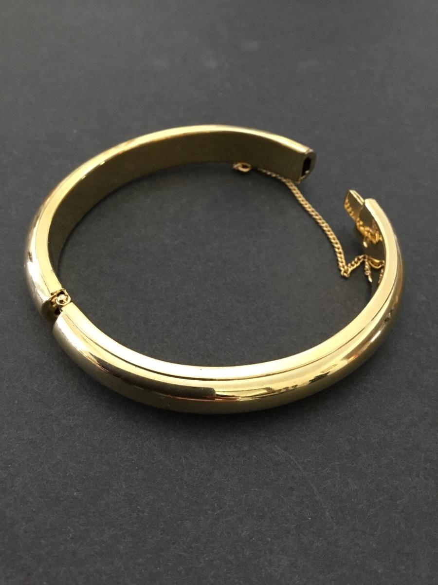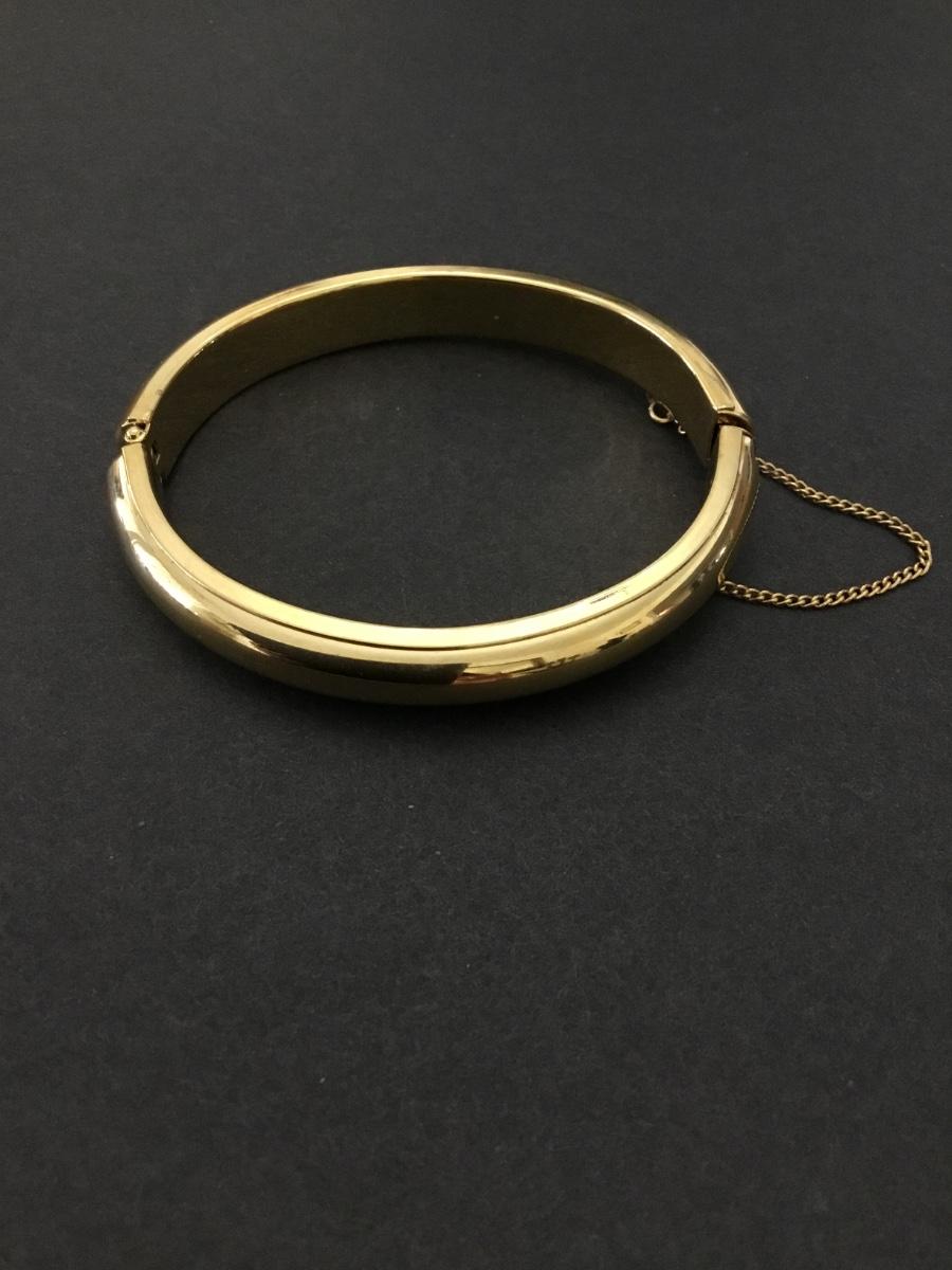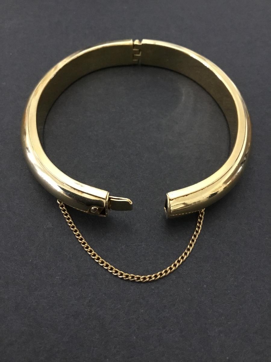 Vintage, gold tone, hinge, locking bracelet with safety chain excellent condition
