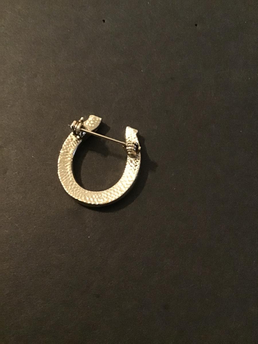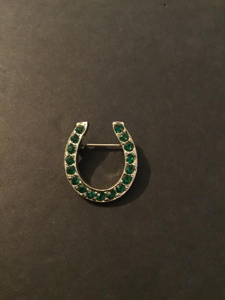 Vintage Gold Tone horse shoe brooch with green emerald rhinestones Please see attached photos