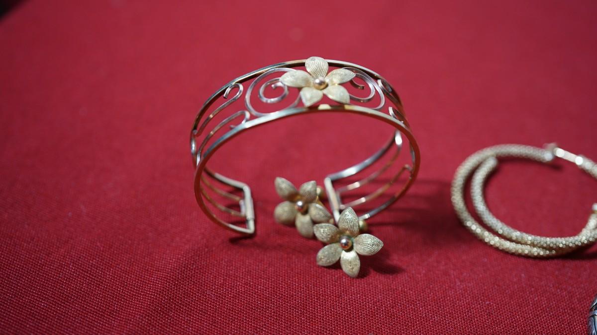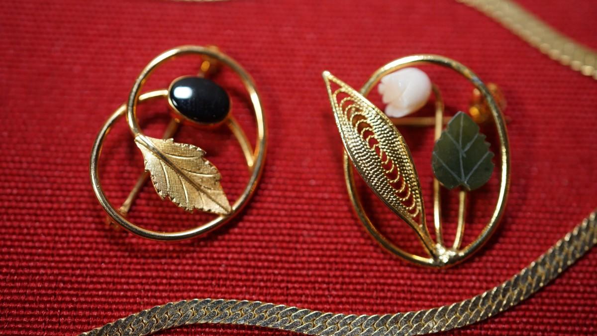grouping of 60-70's jewelry includes bracelets, earrings, a brass cobra chain necklace. two dainty pins with jade and coral flowers, one has a onyx oval accent.