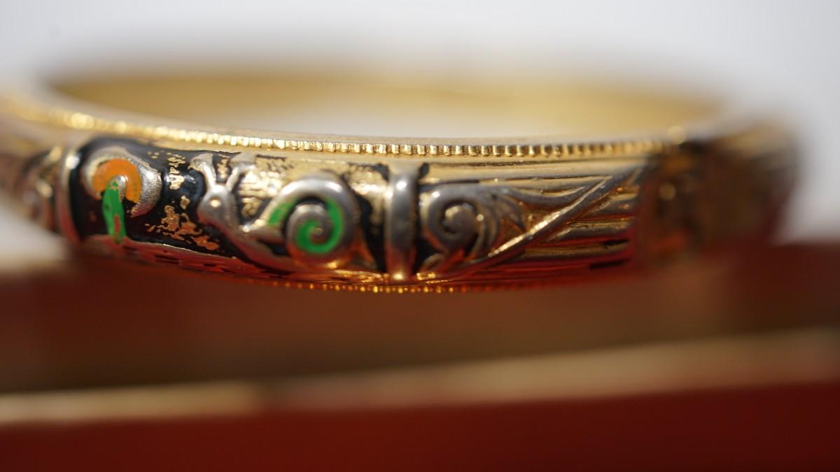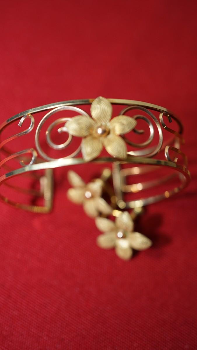 brass wire bracelet with star flower has matching earrings. interlocking bracelet of 1 3/4" interior so a small size has enameled accent , Vintage Avon tiered leaf pin; All in good condition