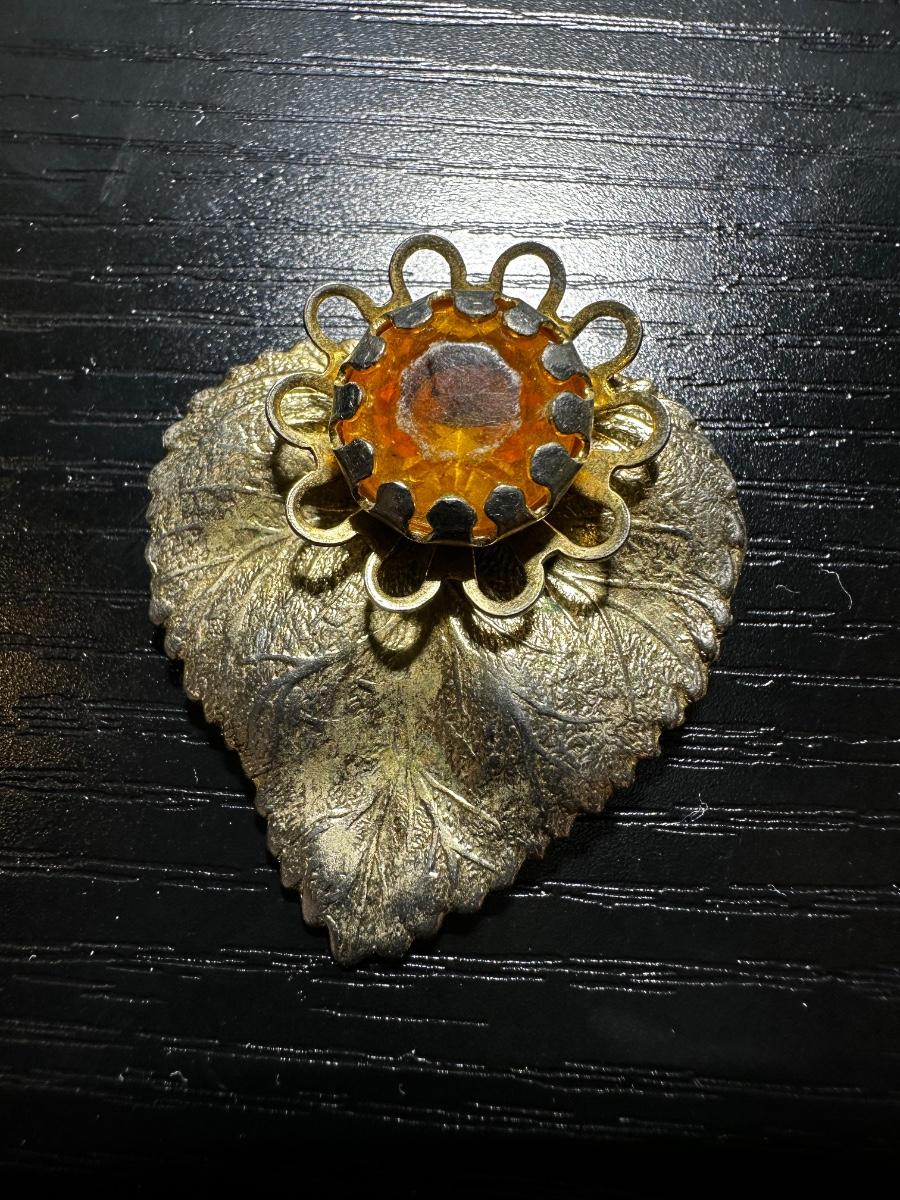 Vintage gold tone leaf with faux cognac colored gem brooch