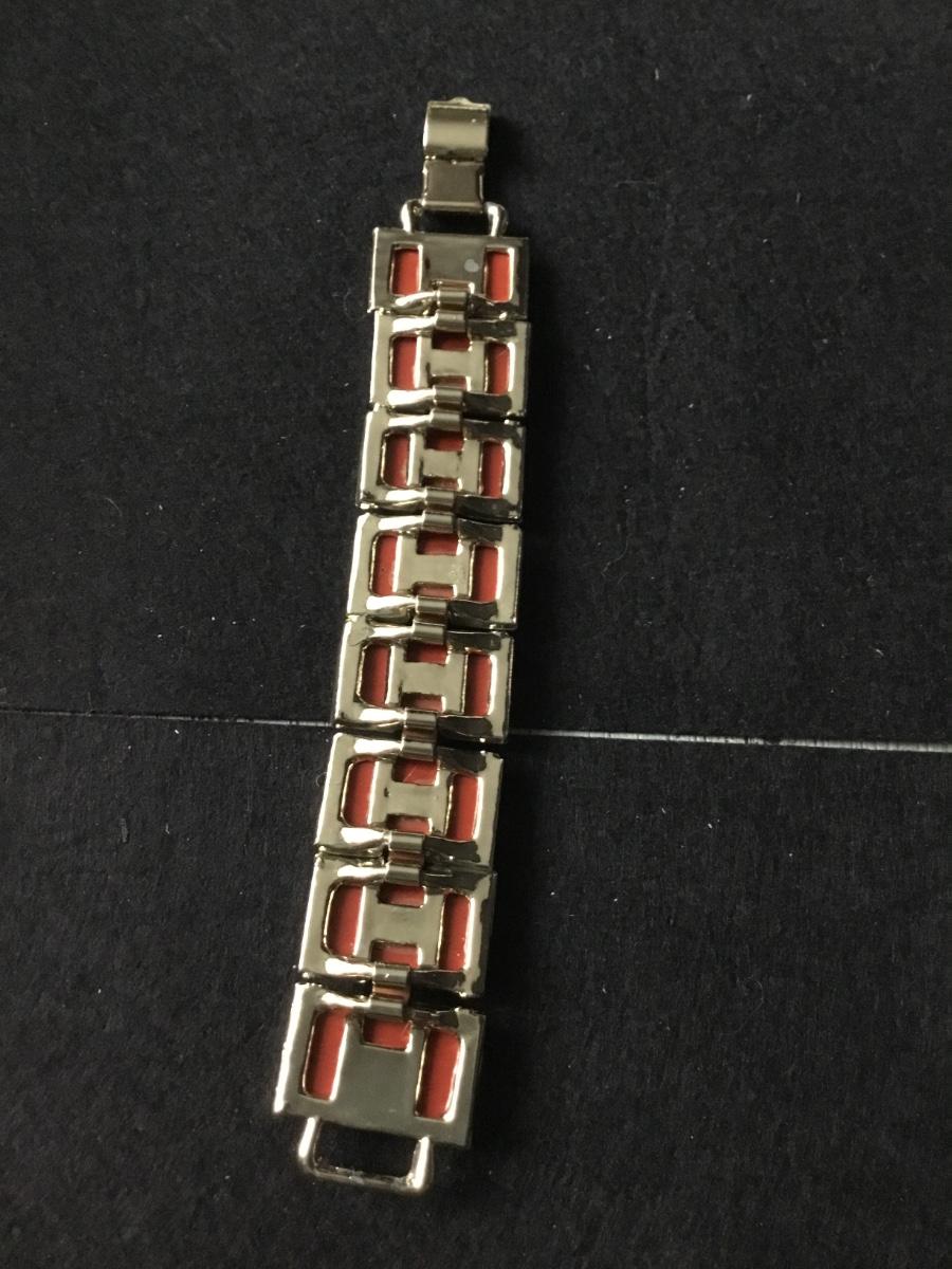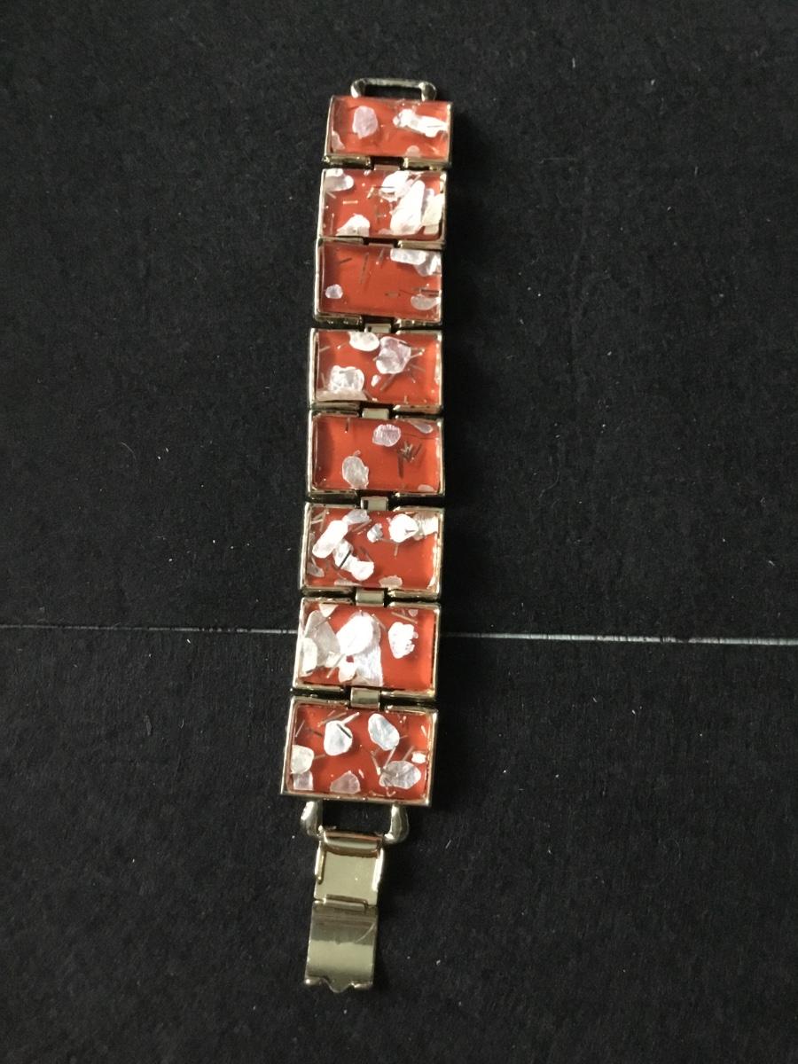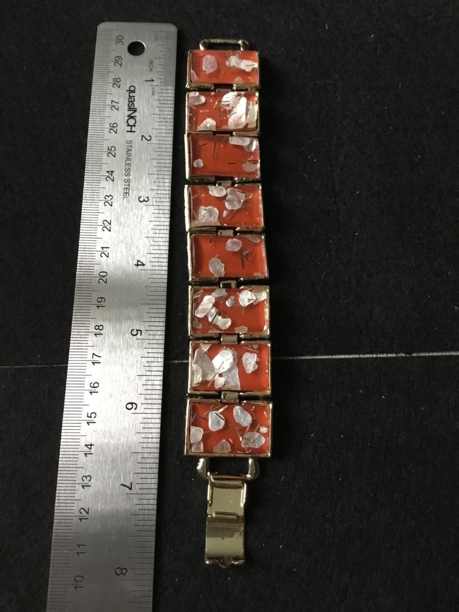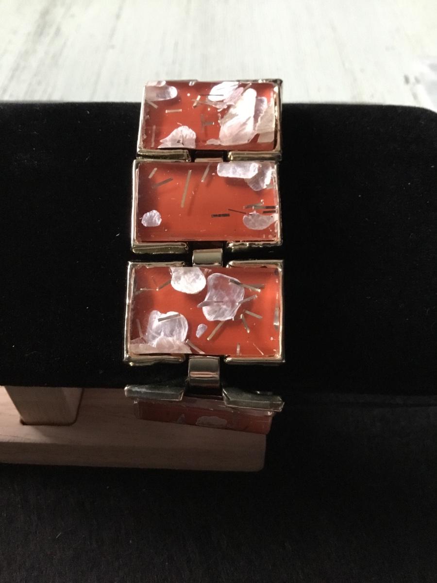 Vintage gold tone link red/ orange confetti lucite bracelet